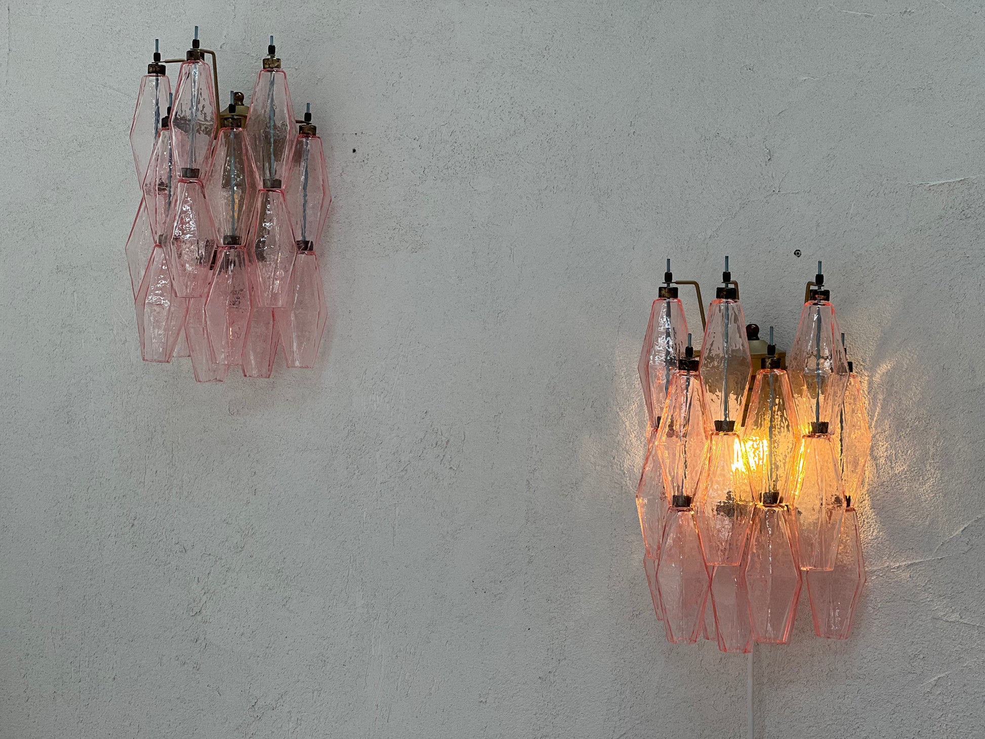 Each applique consists of 17 Murano handmade pink POLIEDRI glass, on a solid metal frame gold painted and brass.