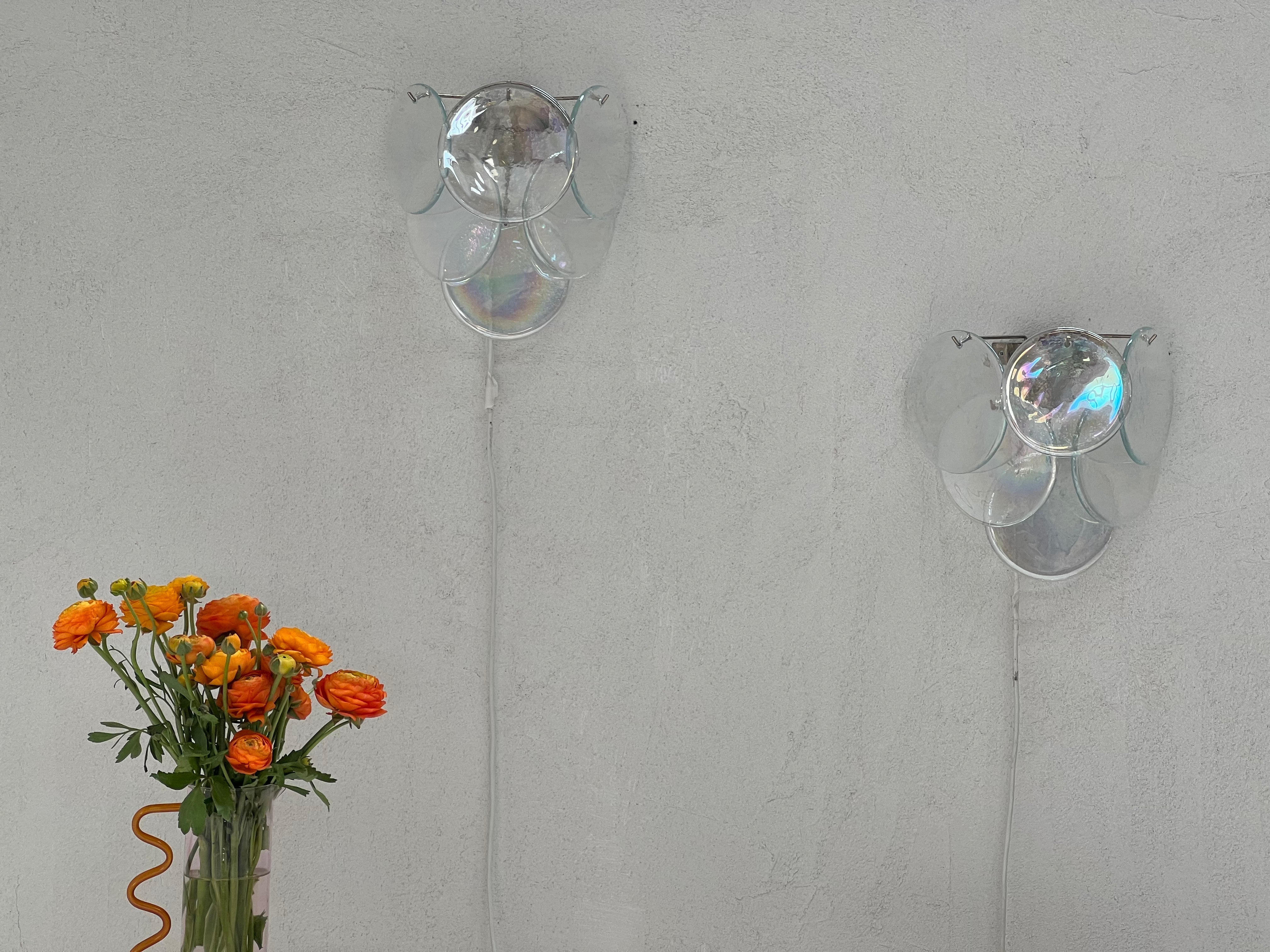 Stunning vintage Italian Murano Vistosi sconce with six iridescent pearly Murano glass discs hanging on a metal frame.
