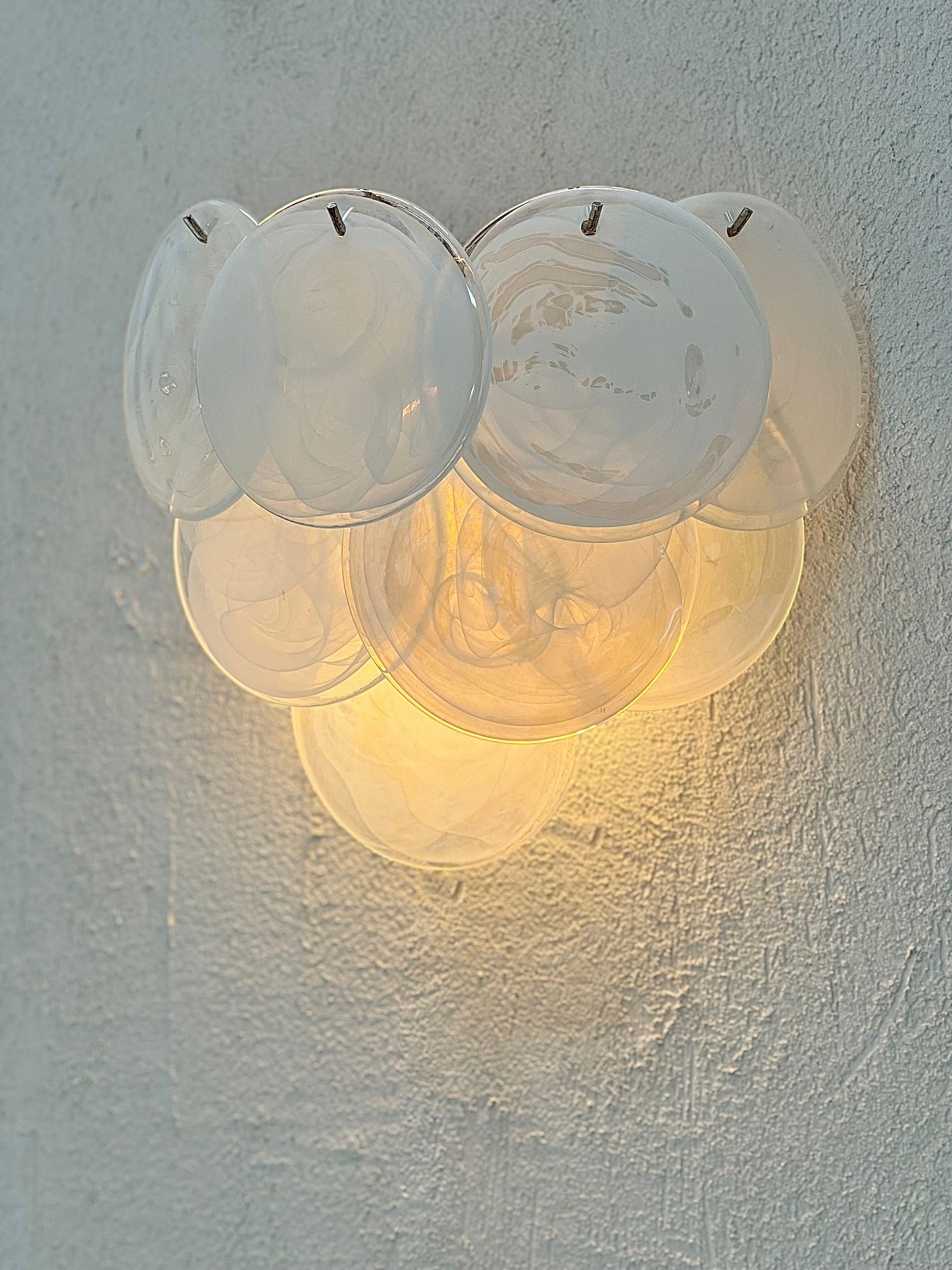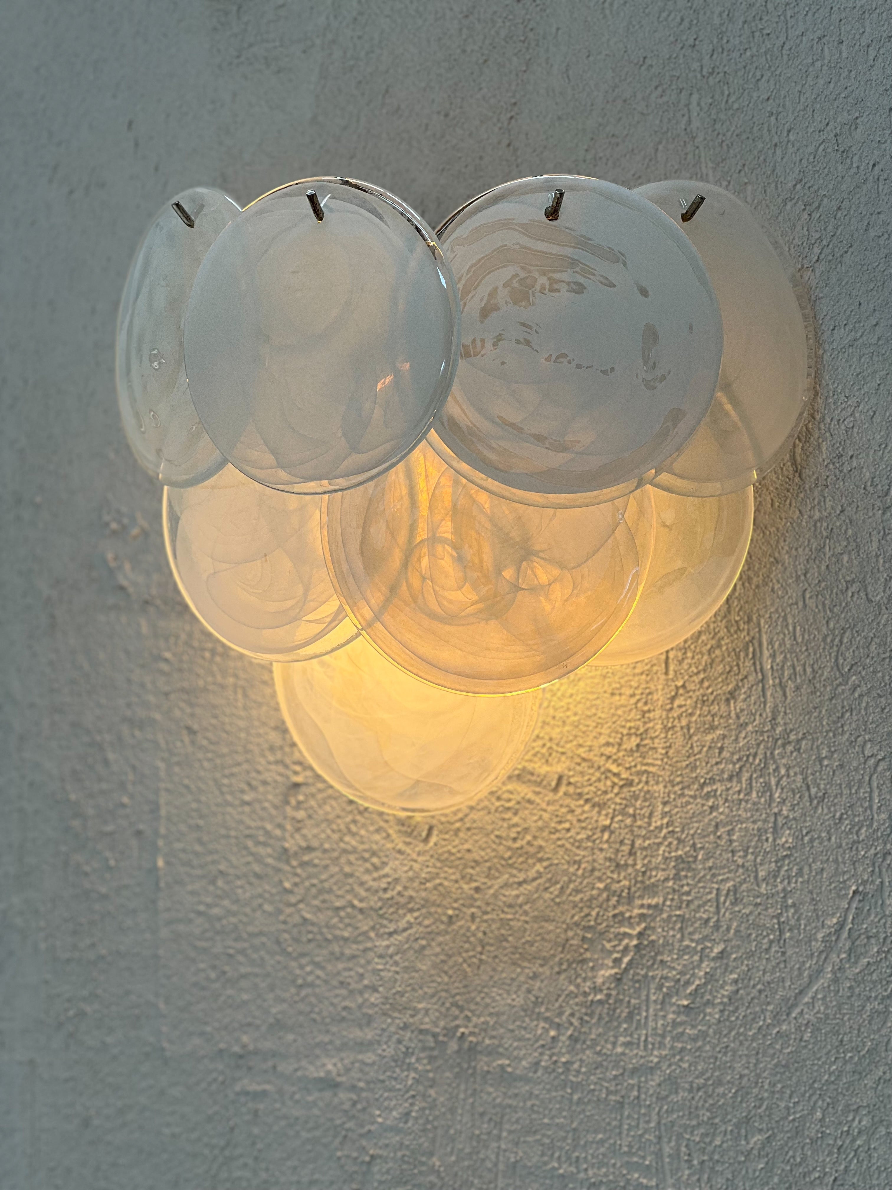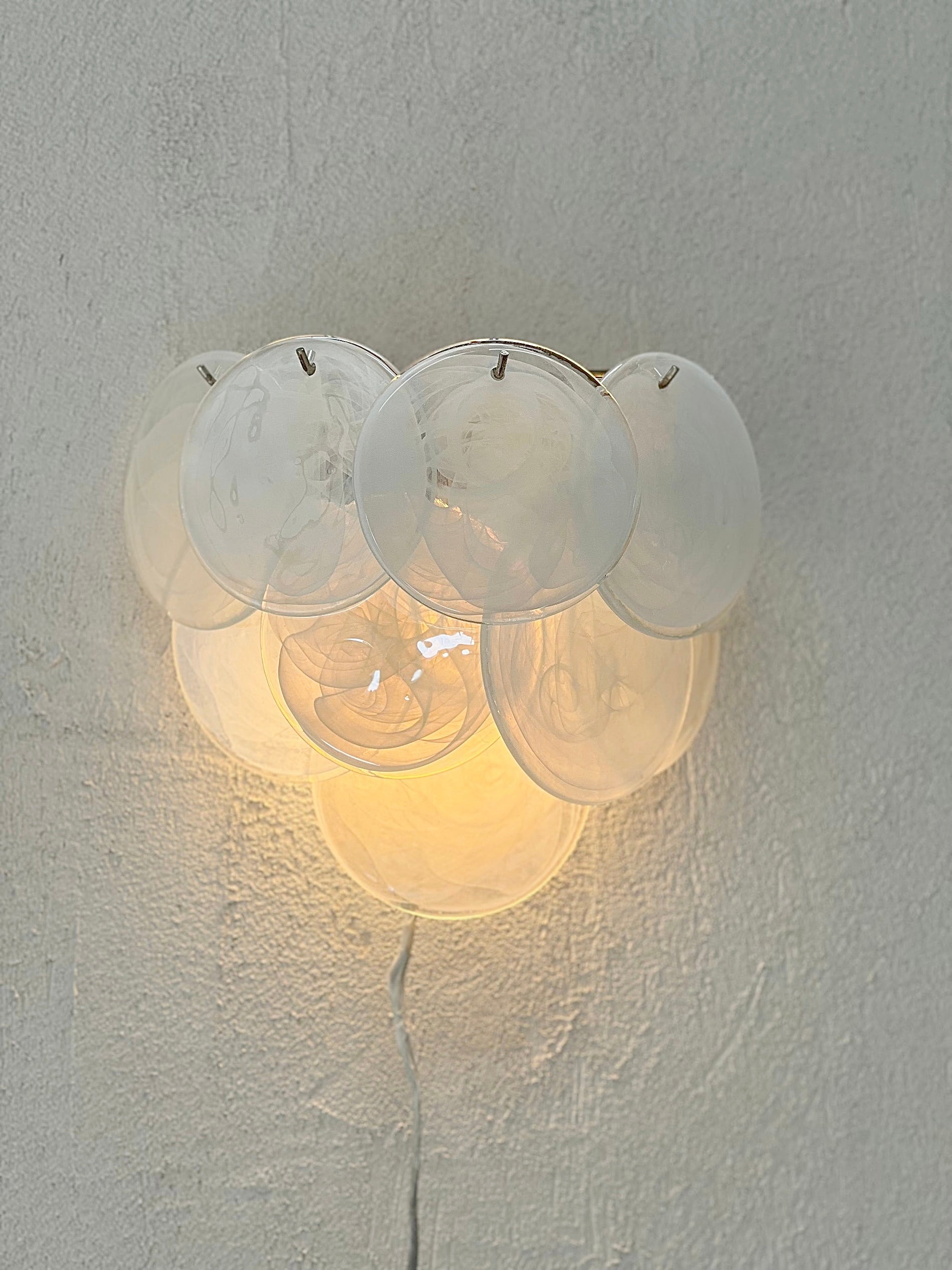 Stunning vintage Italian Murano Vistosi sconce, with 10 white Murano glass discs hanging on a metal frame.