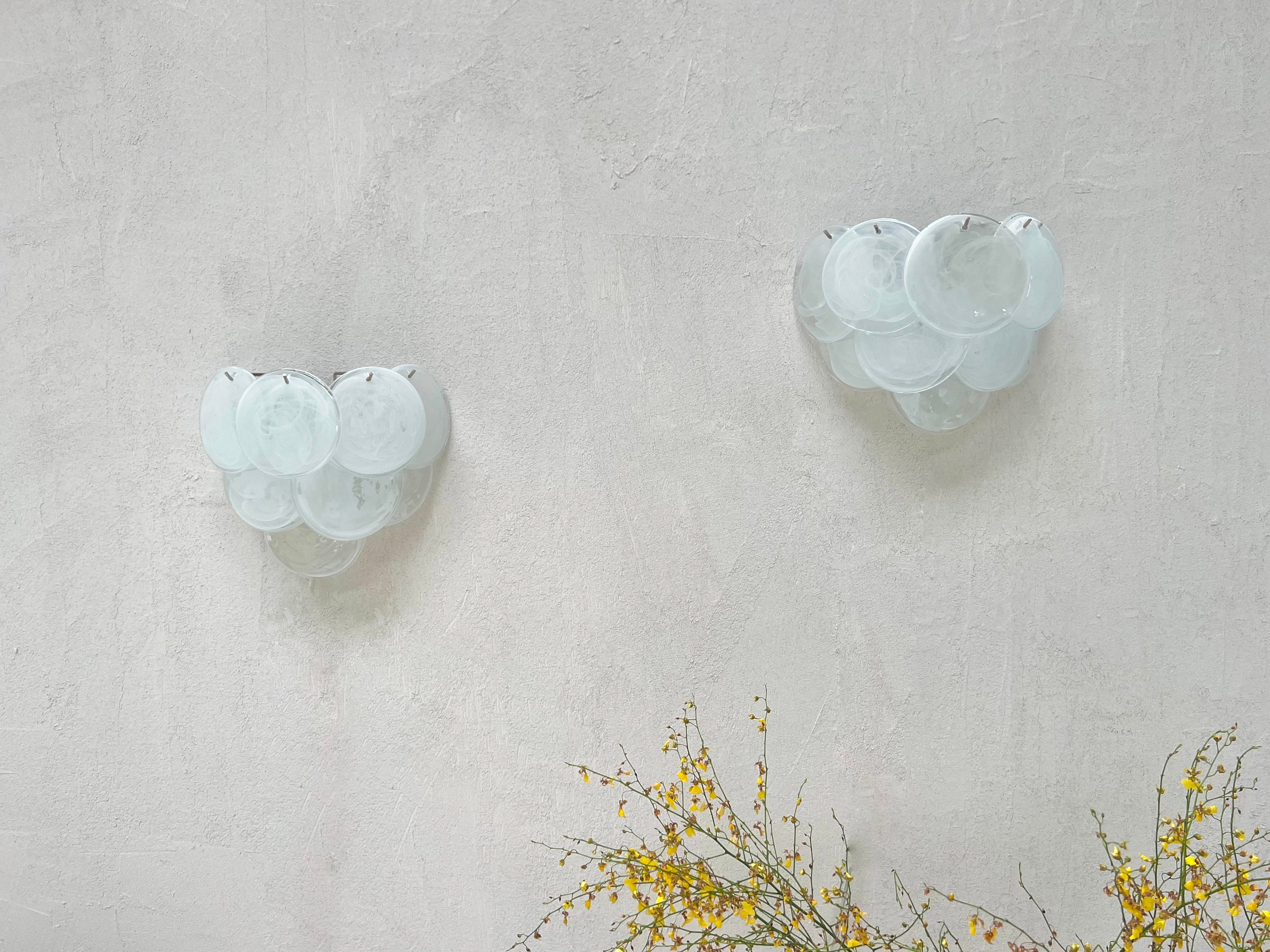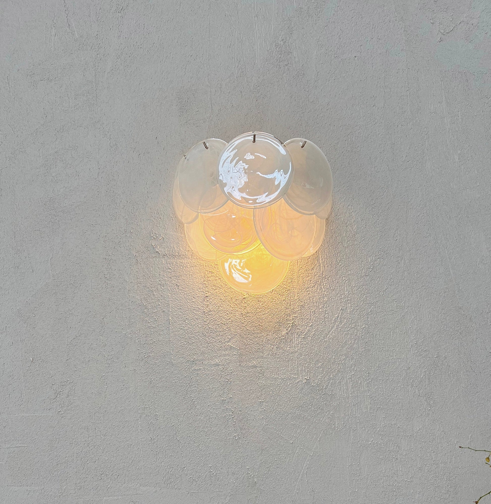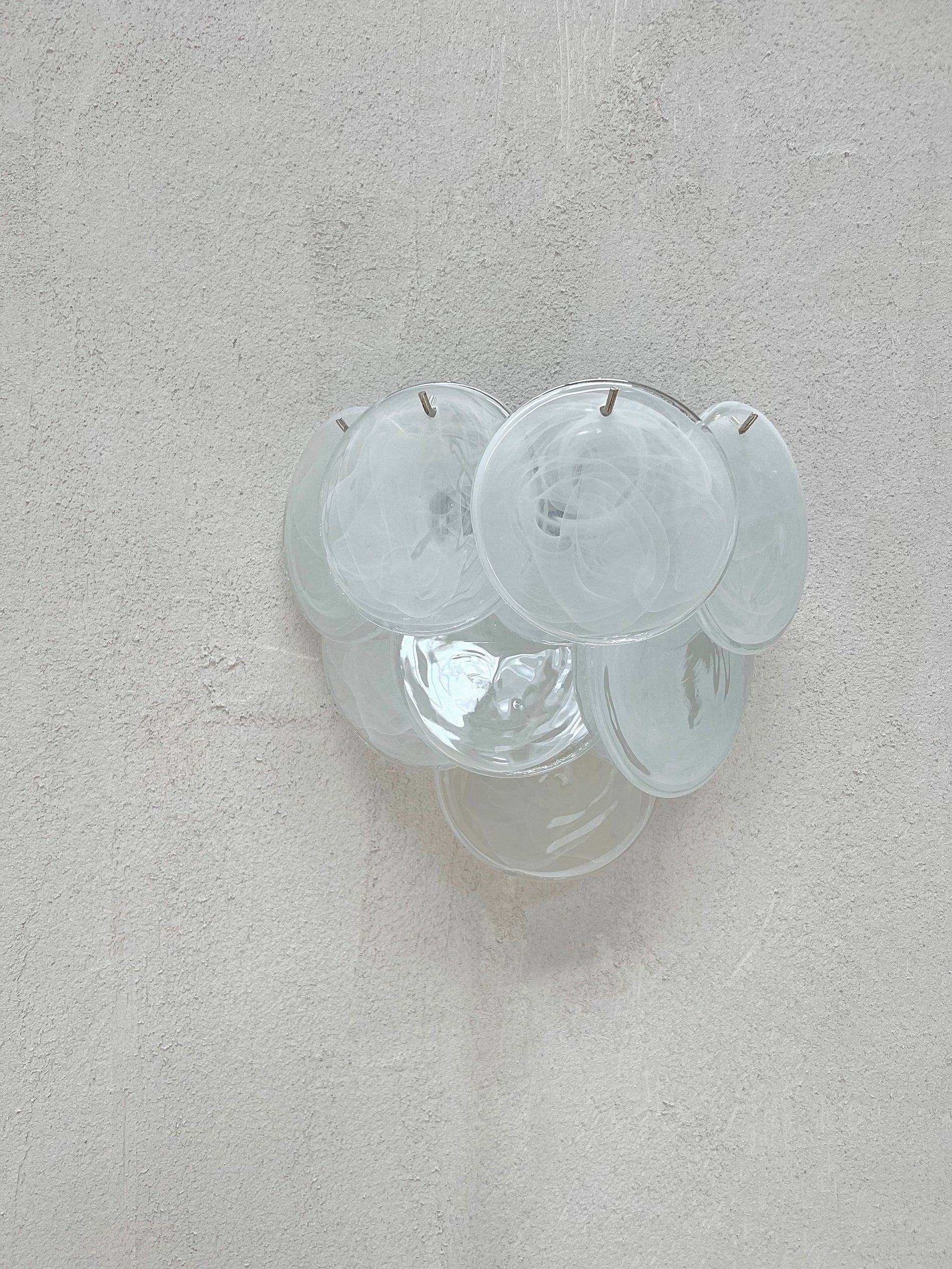 Stunning vintage Italian Murano Vistosi sconce, with 10 white Murano glass discs hanging on a metal frame.