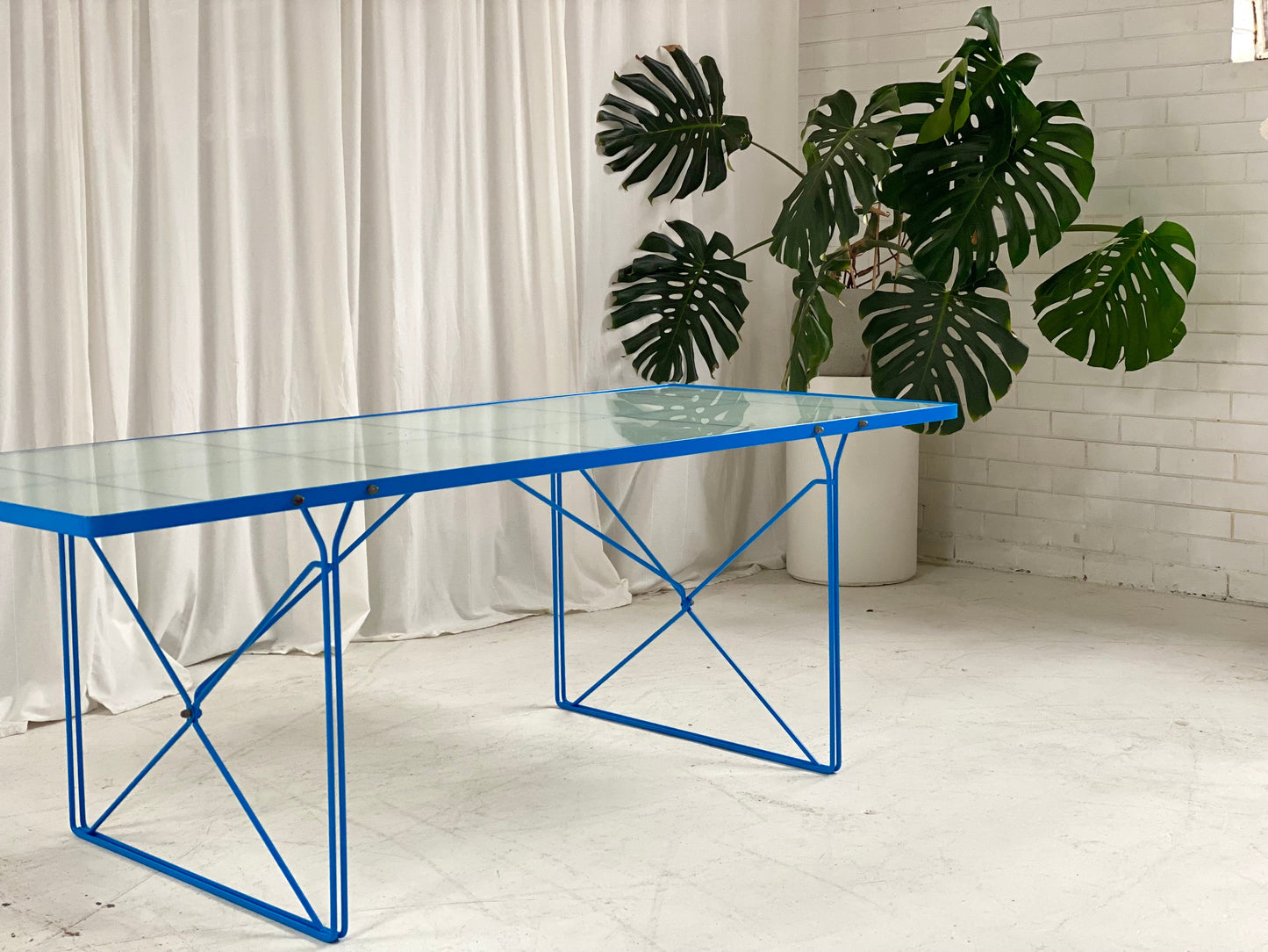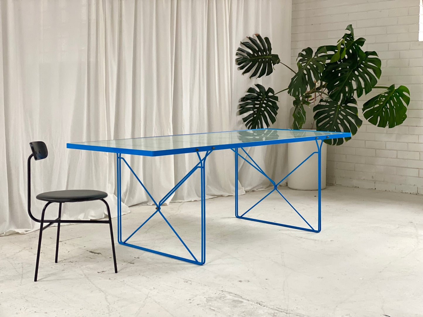 Frosted glass top and freshly powder coated in 'blaze blue'