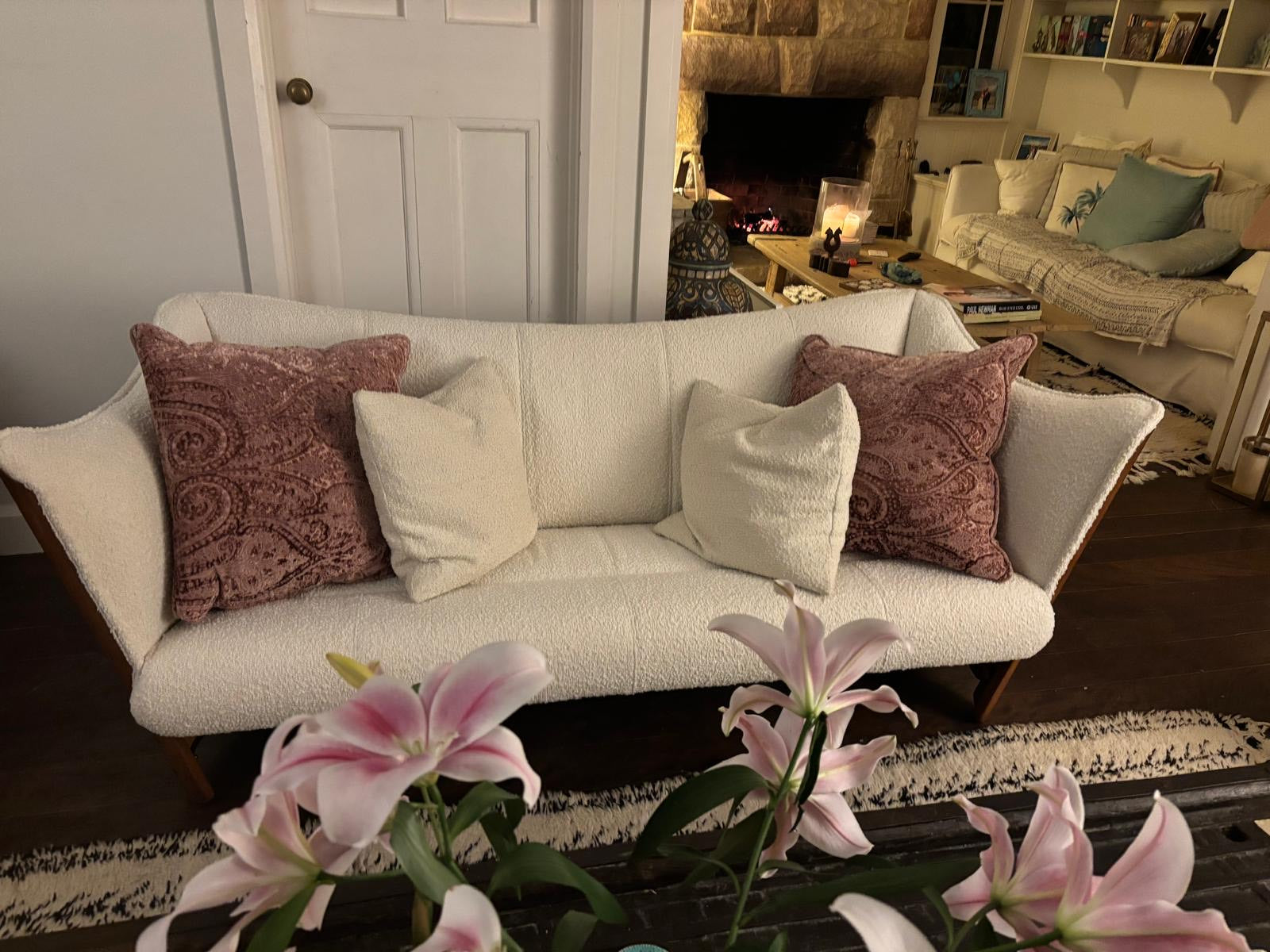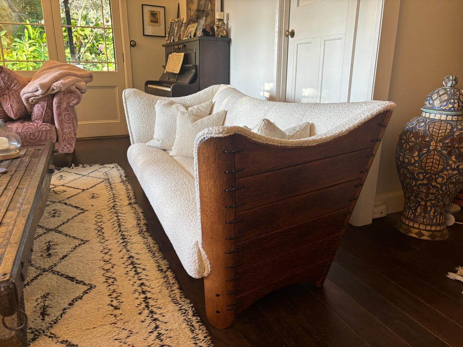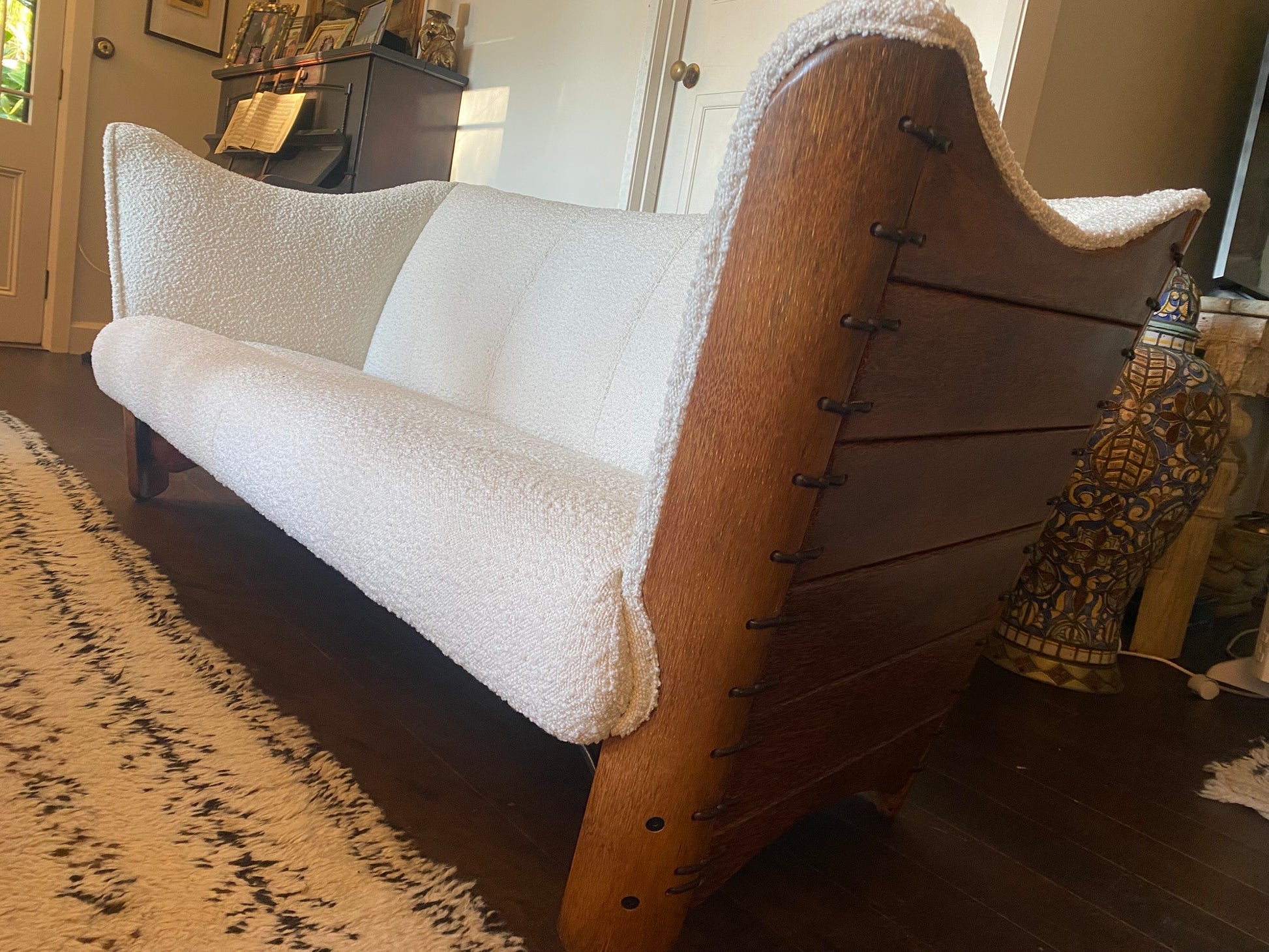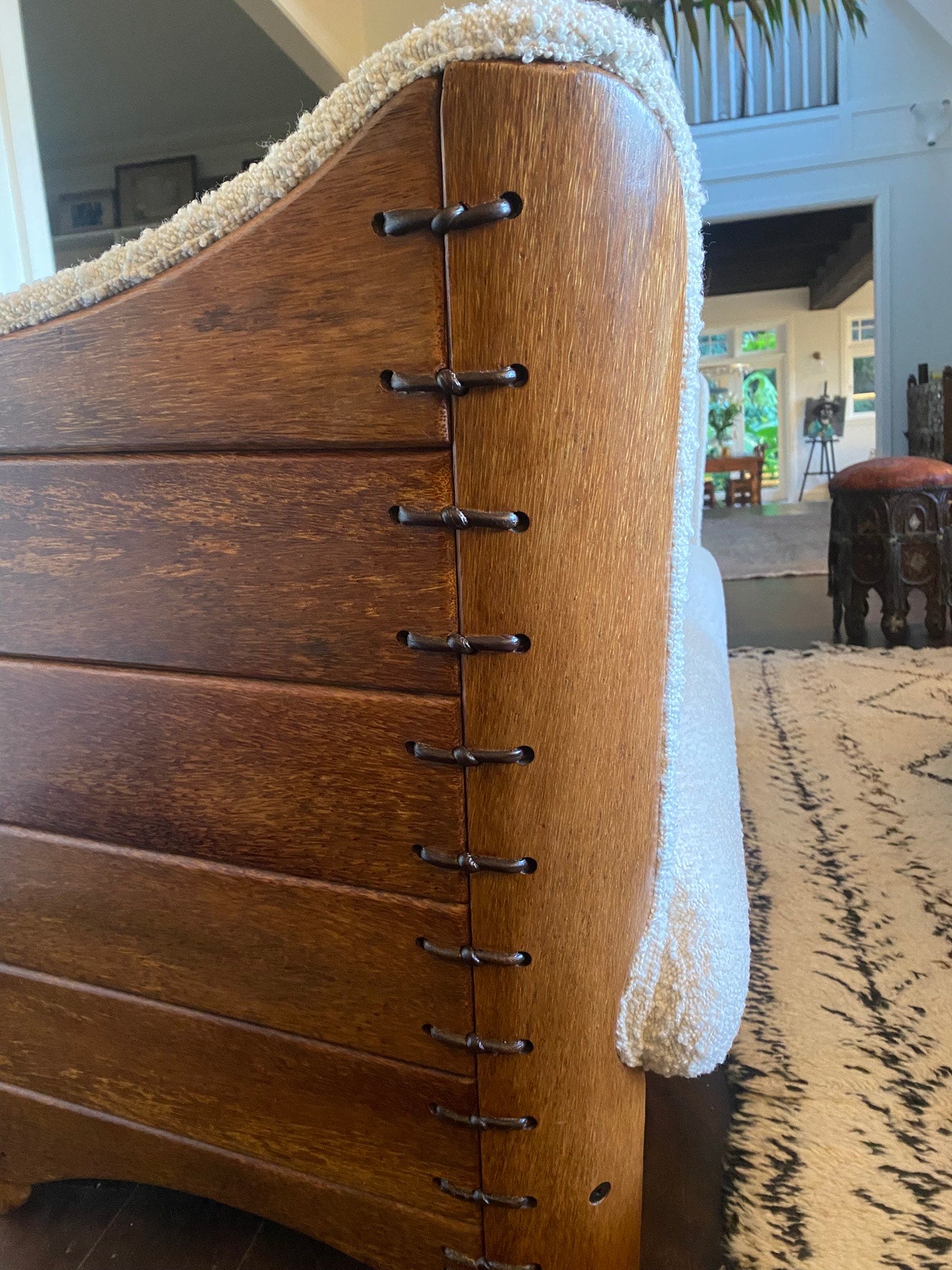 Materials - Polished Palmwood with steel fittings, white boucle fabric