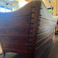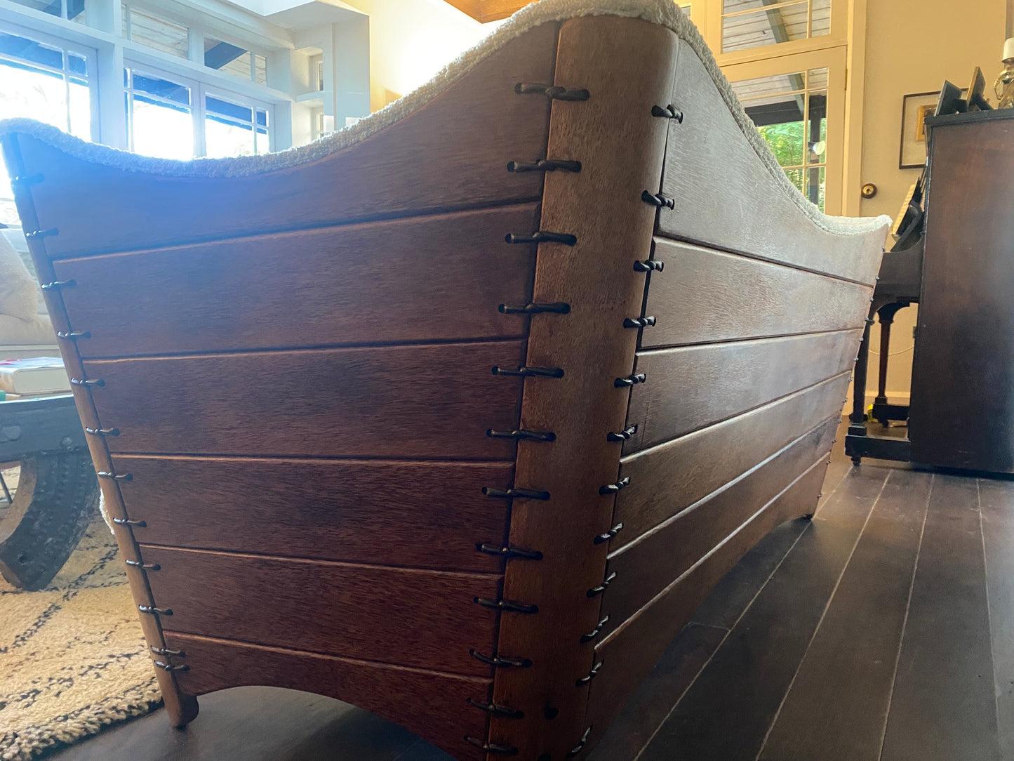 The panel features are influenced by the construction of Polynesian canoes where wood panels were lashed