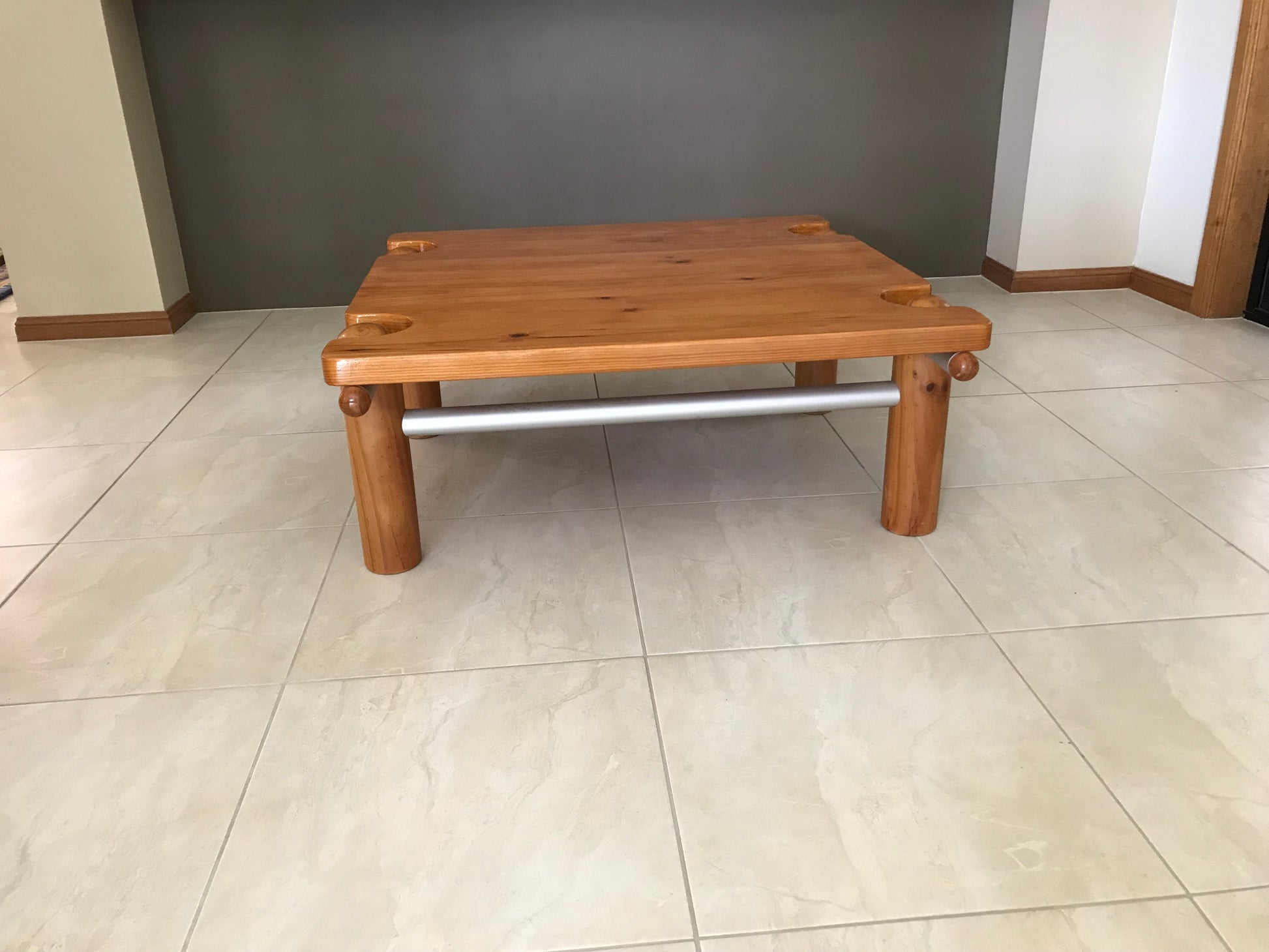 Square coffee table. Radiata pine, aluminium frame with solid rejuvenated 4cm deep top. Studio line circa 1976. Pine top and aluminium and pine legs.