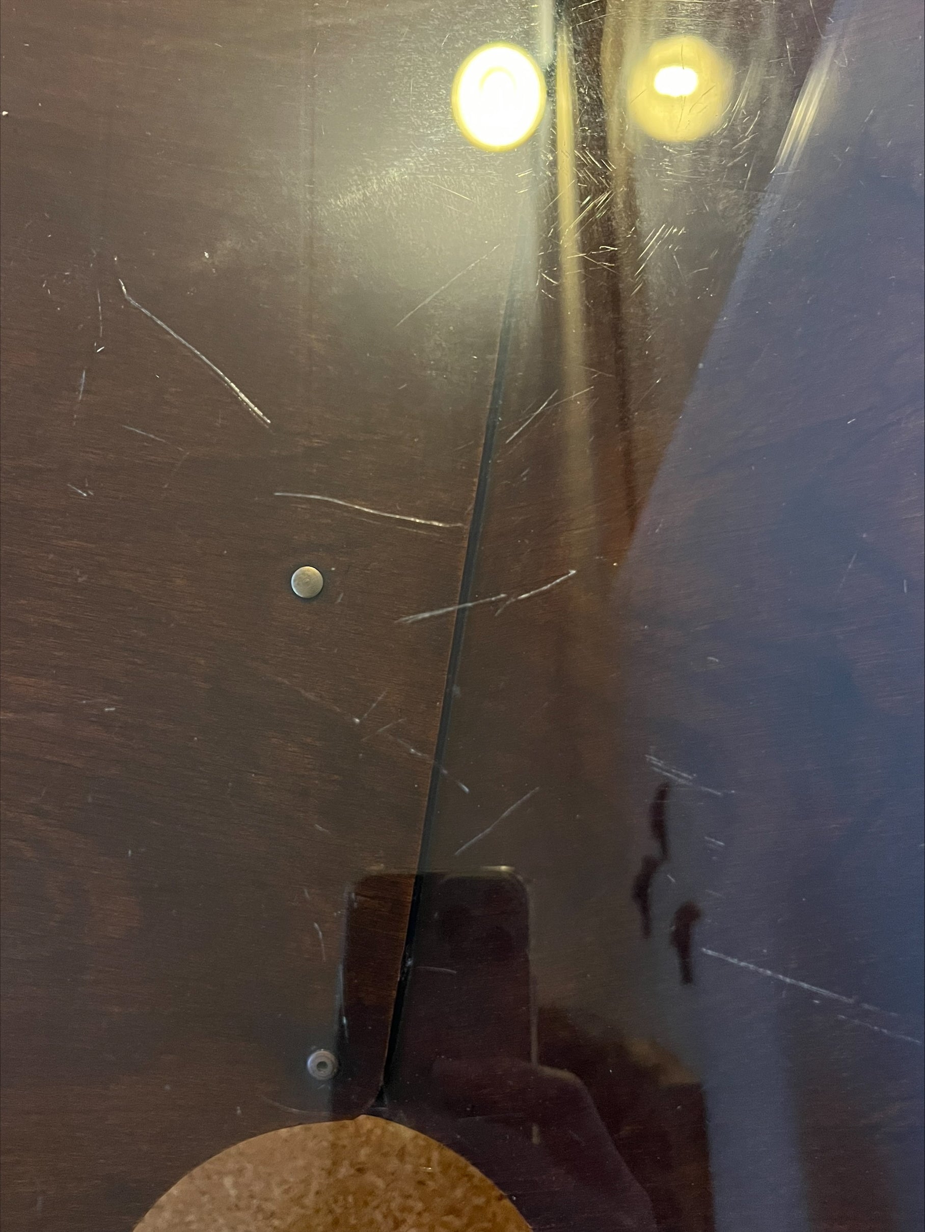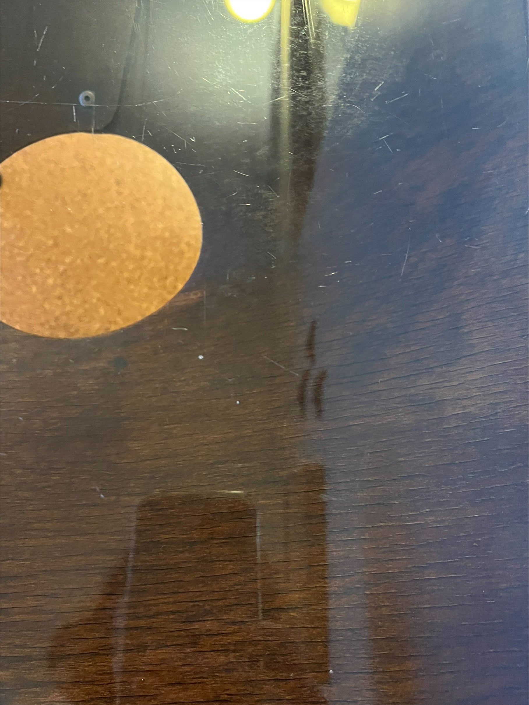 Taking inspiration from Charles & Ray Eames and other mid-century furniture designers, he used moulded plywood as the base material as it was readily available in the post war period. He made a simple construction by forming a shallow cone shape with a hole in the centre from a single sheet of moulded aviation plywood and secured the join with brass pins. The timber cone form supports a glass tabletop and sits on a circular base & 4 legs made of powder coated 14mm steel rod.