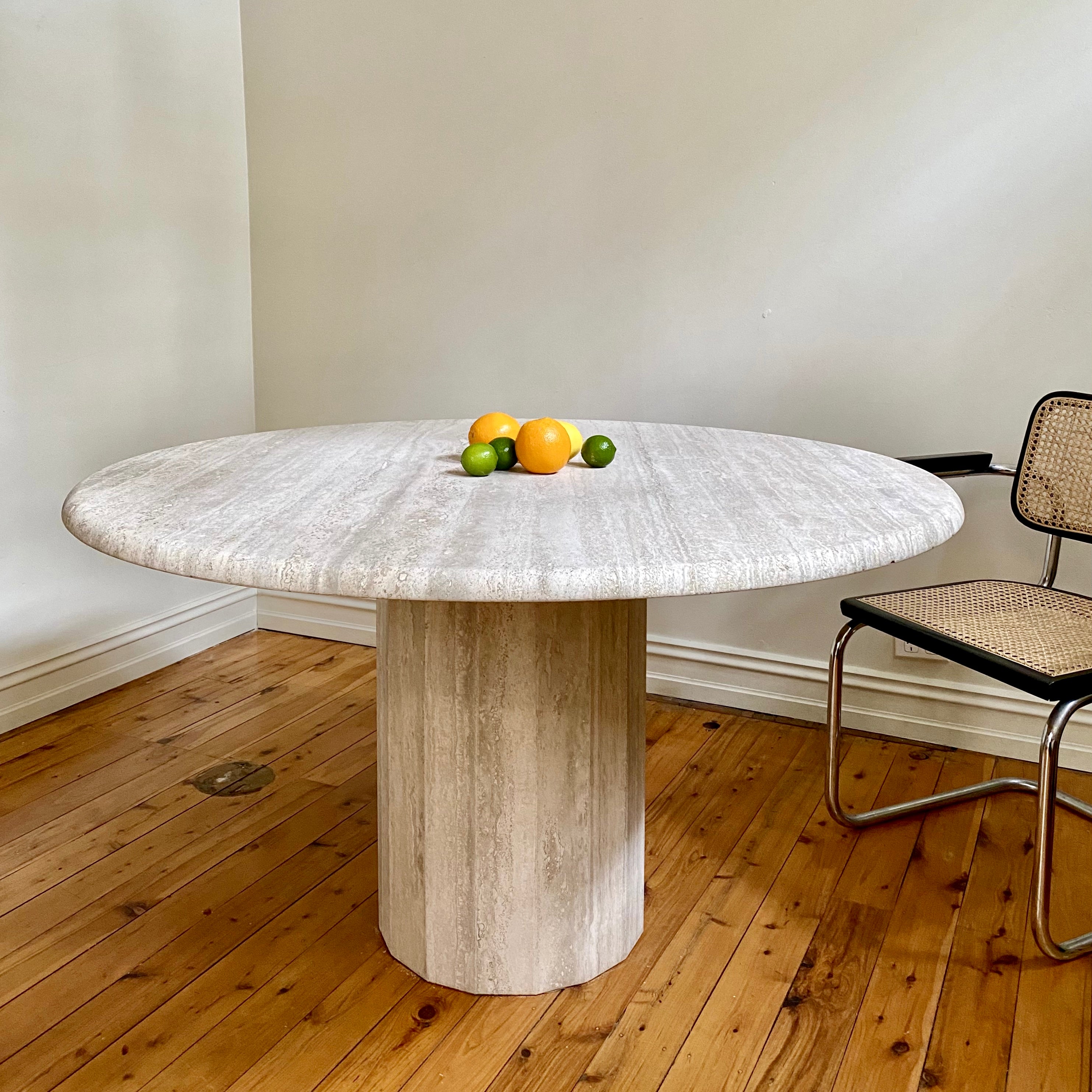 Stunning round vintage unfilled travertine table in creamy, neutral tones with lovely earthy veining detail. Seats 4-5.