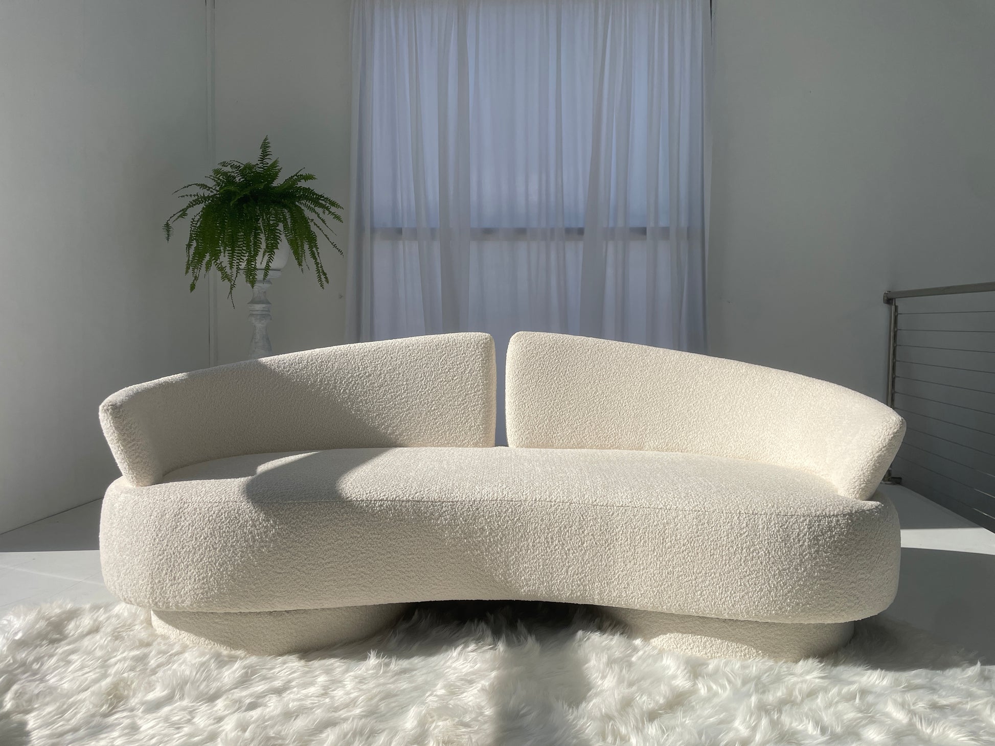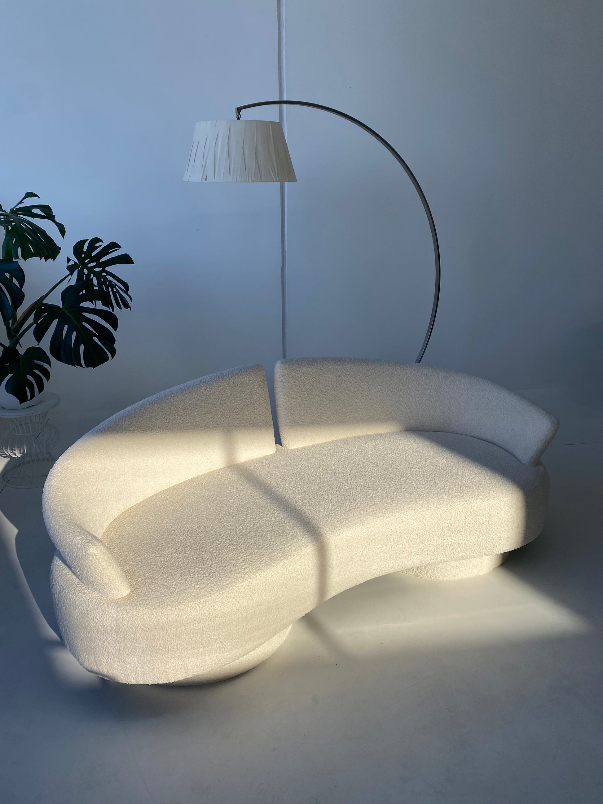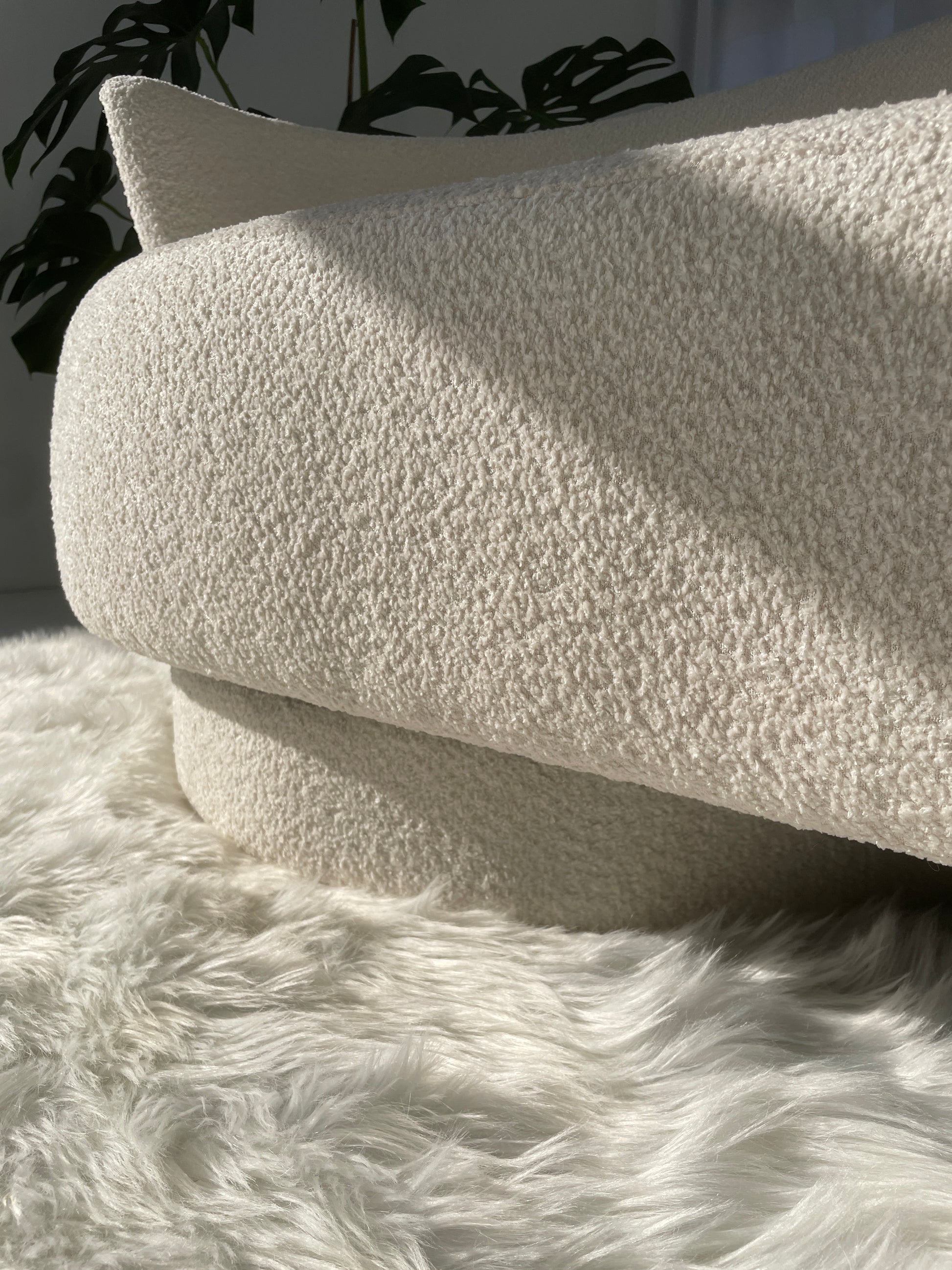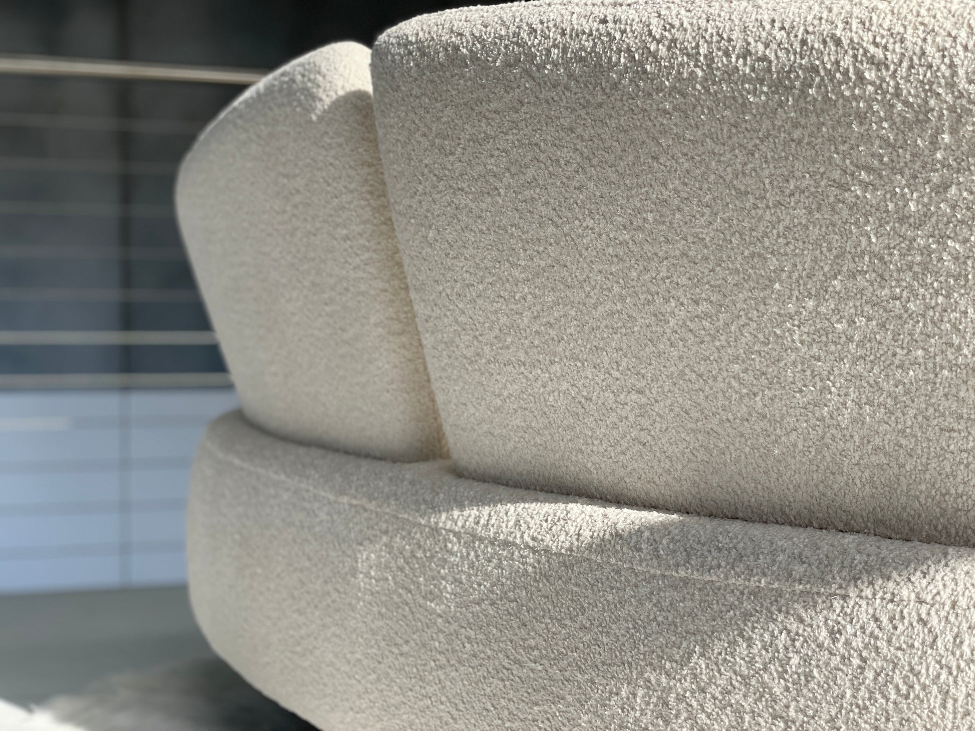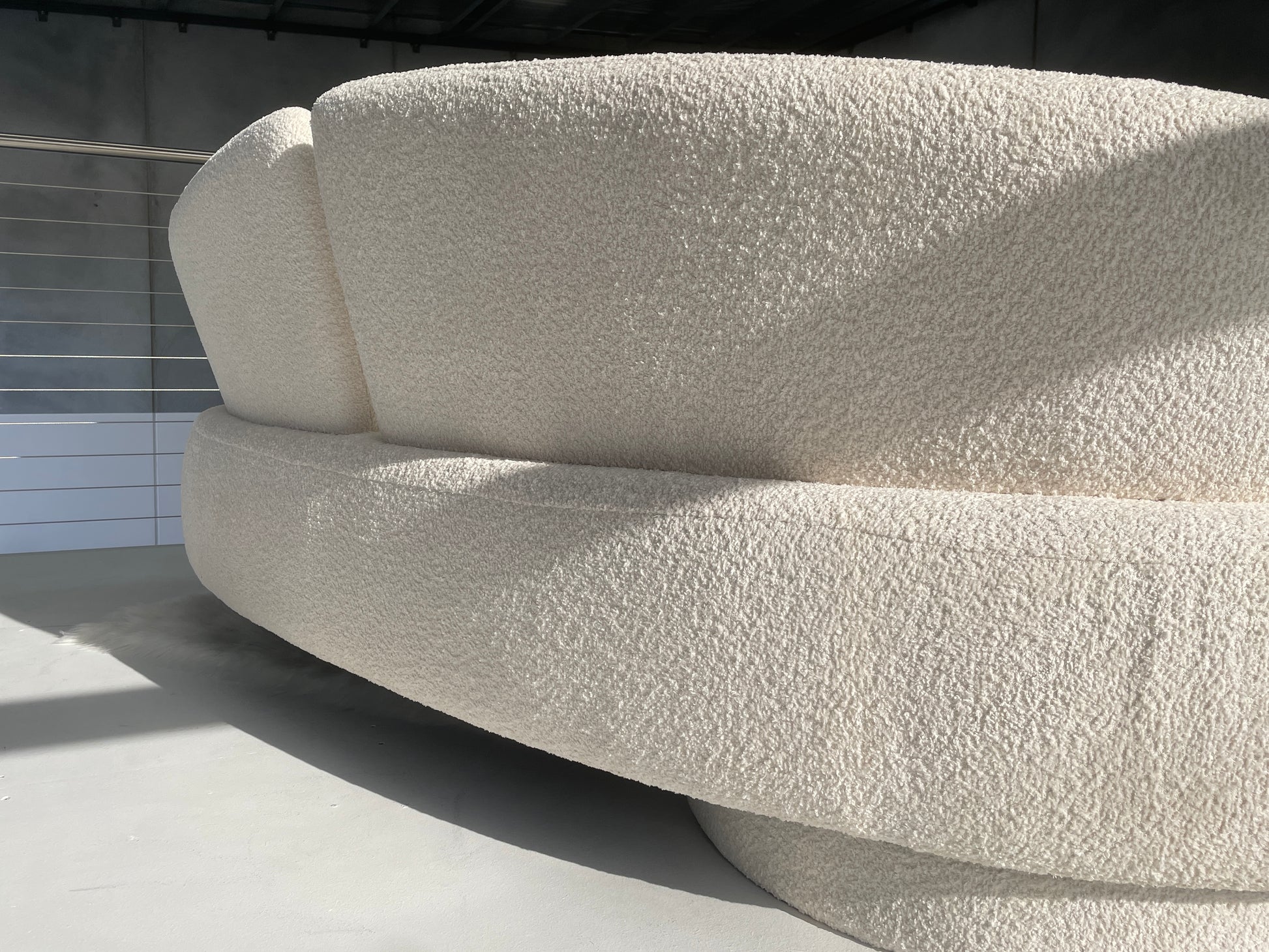 Stunning, freshly upholstered curved sofa in bouclé Snow fabric.