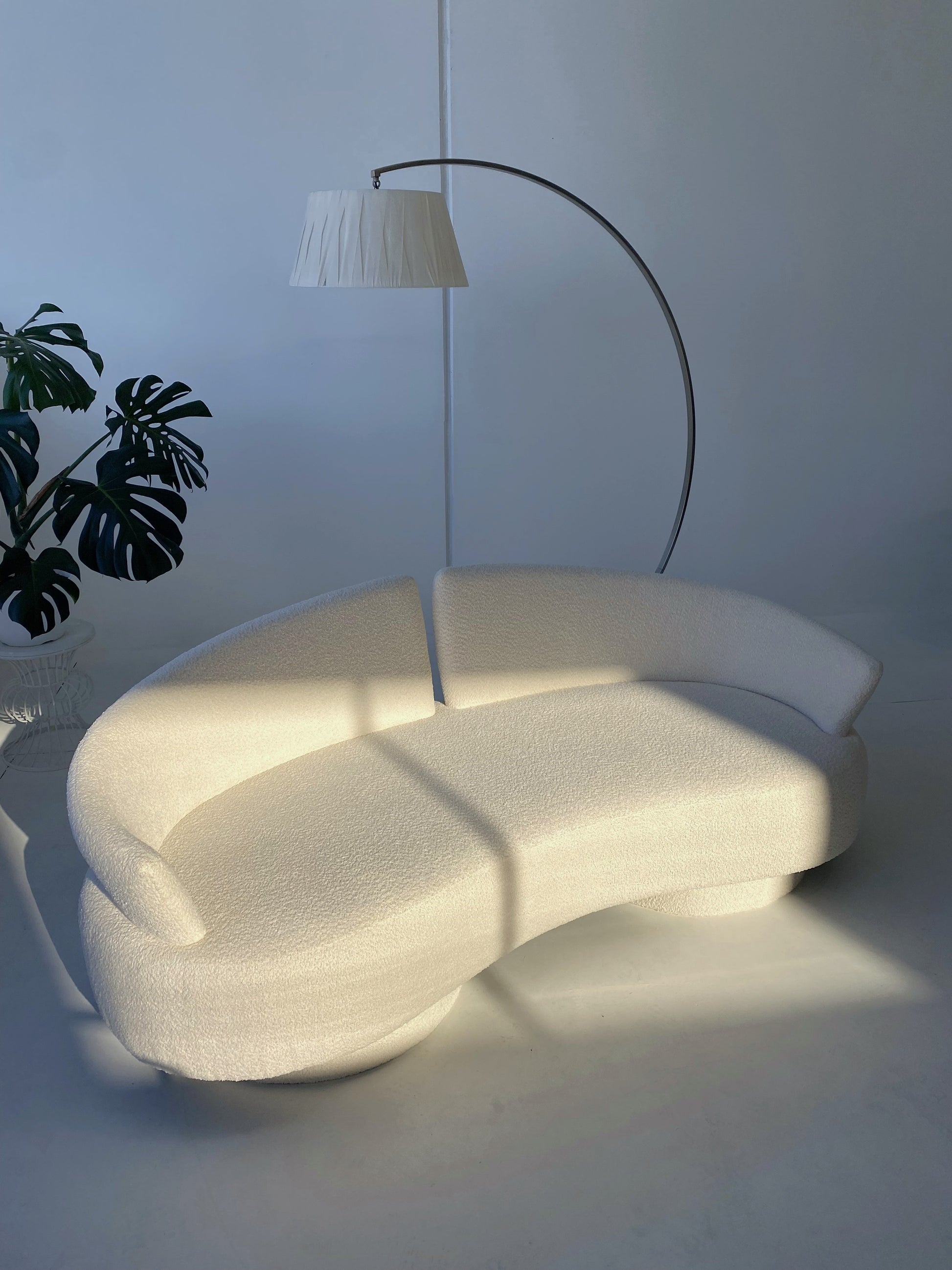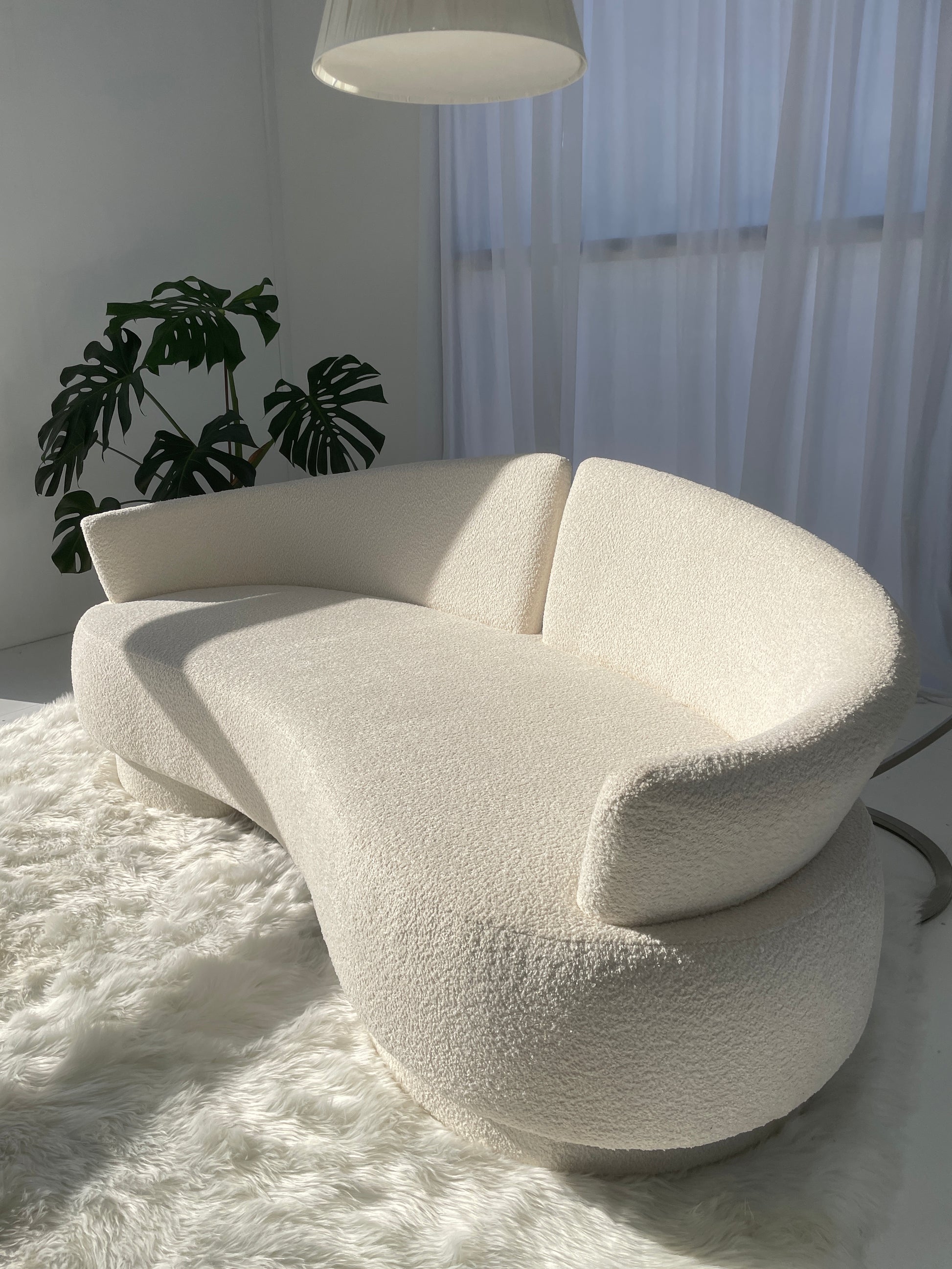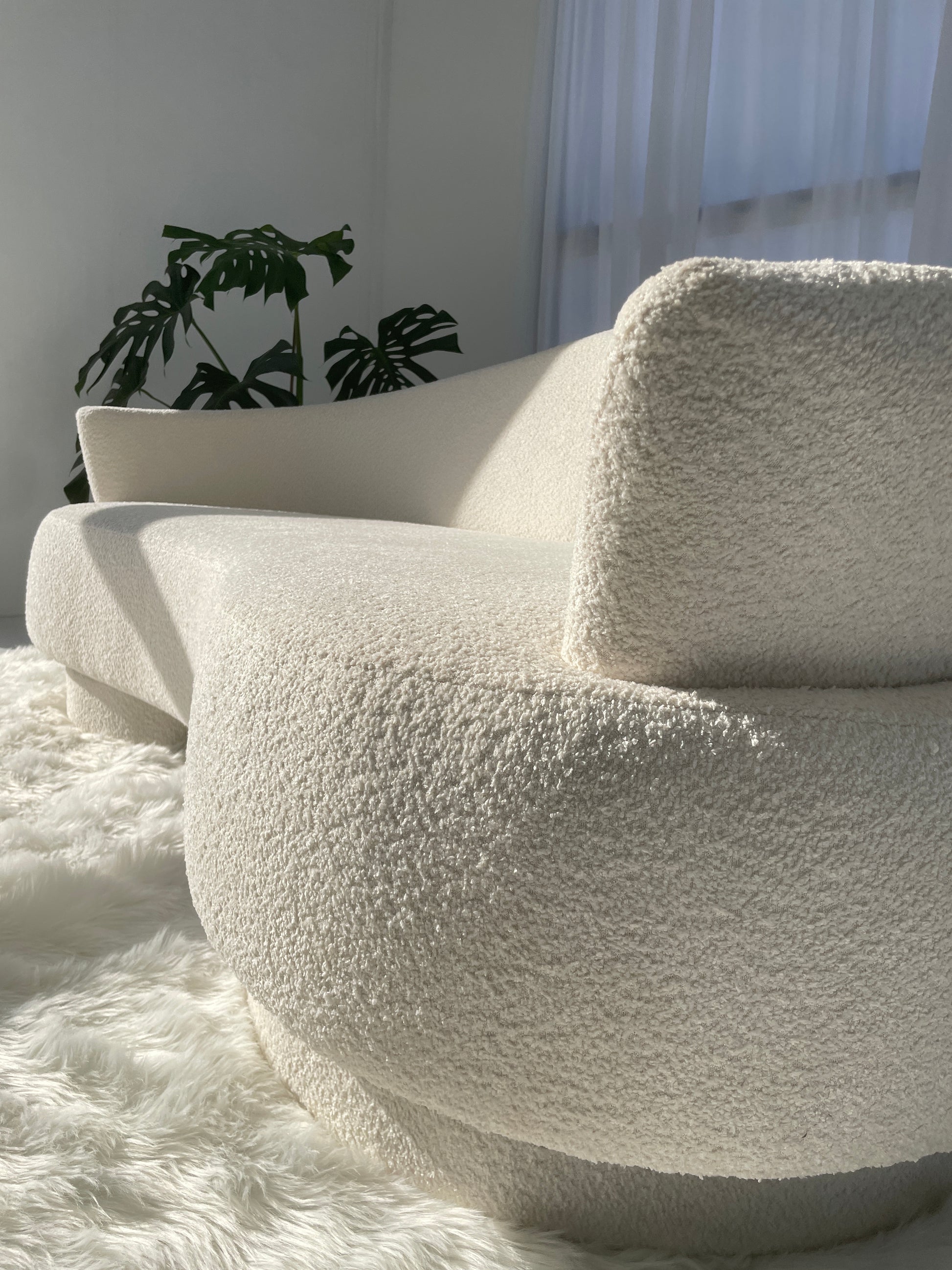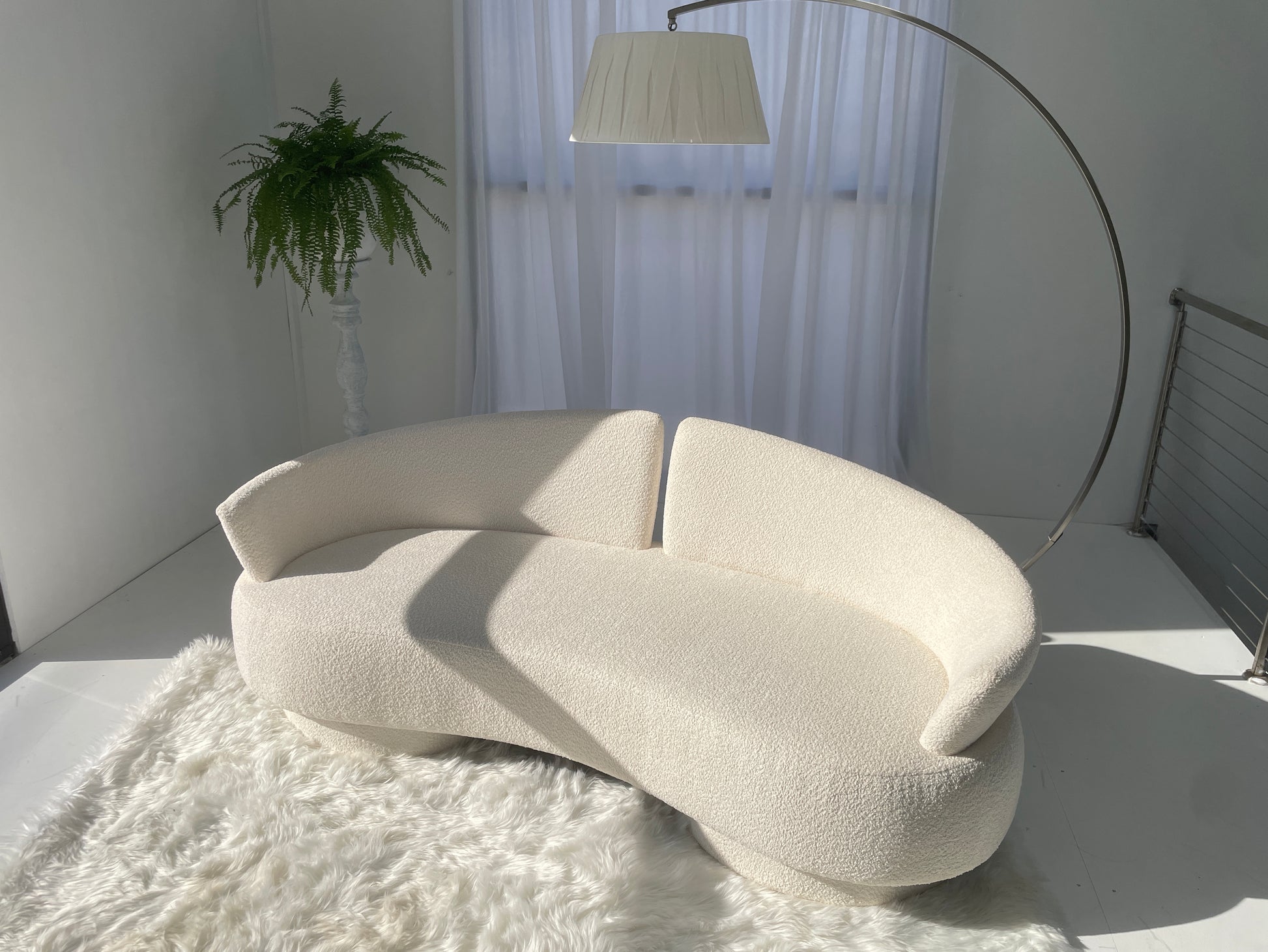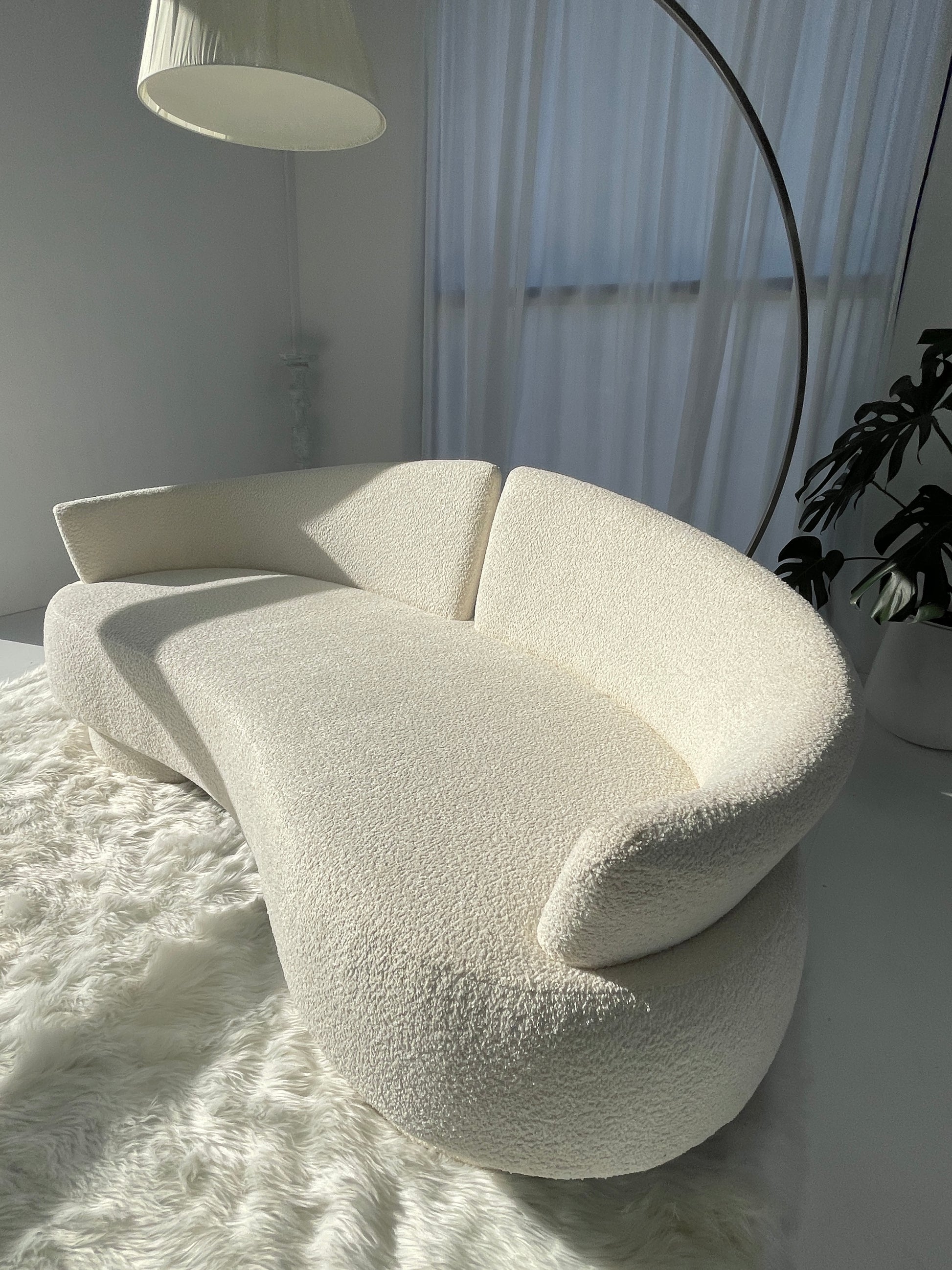 Stunning, freshly upholstered curved sofa in bouclé Snow fabric.