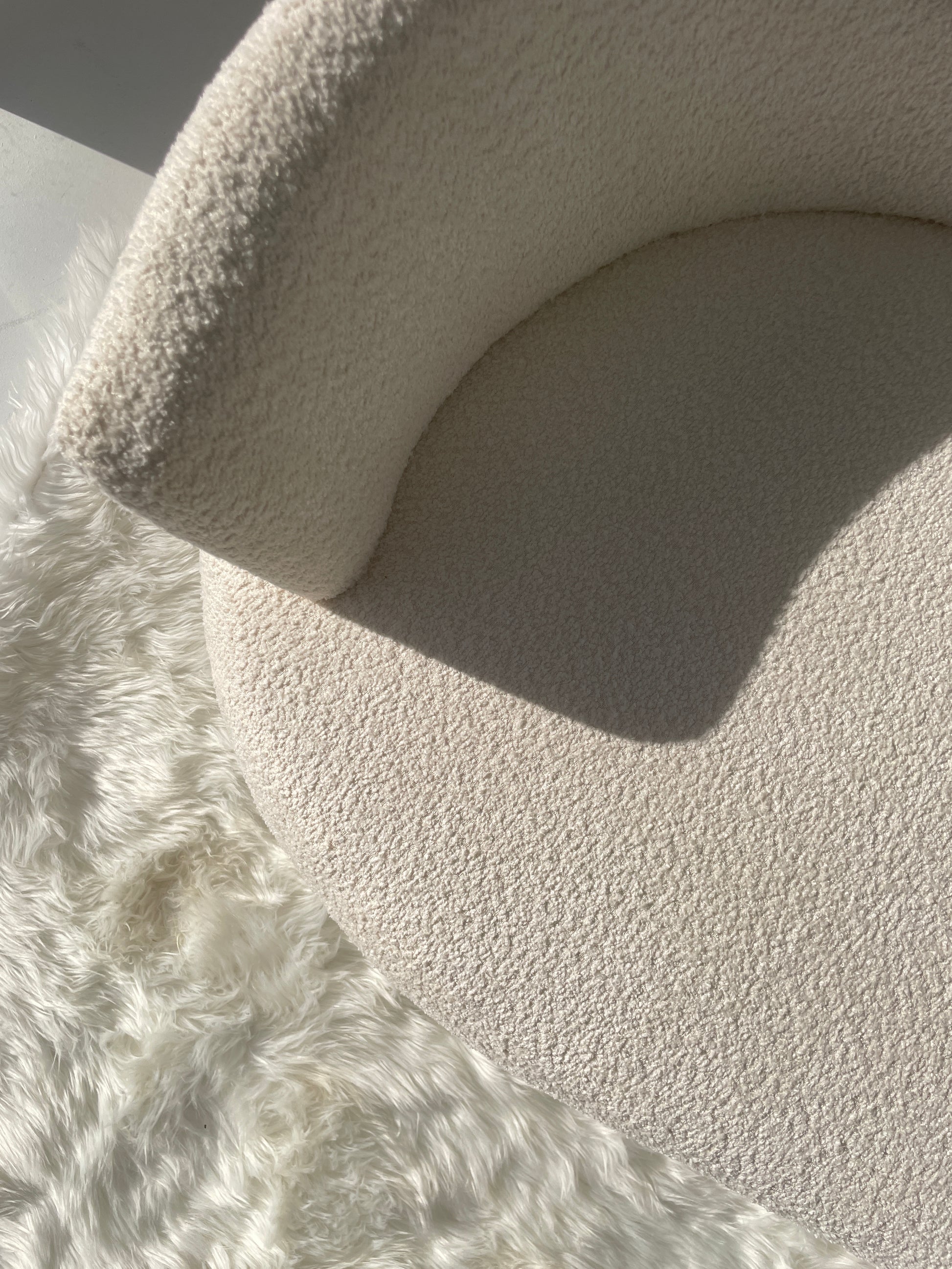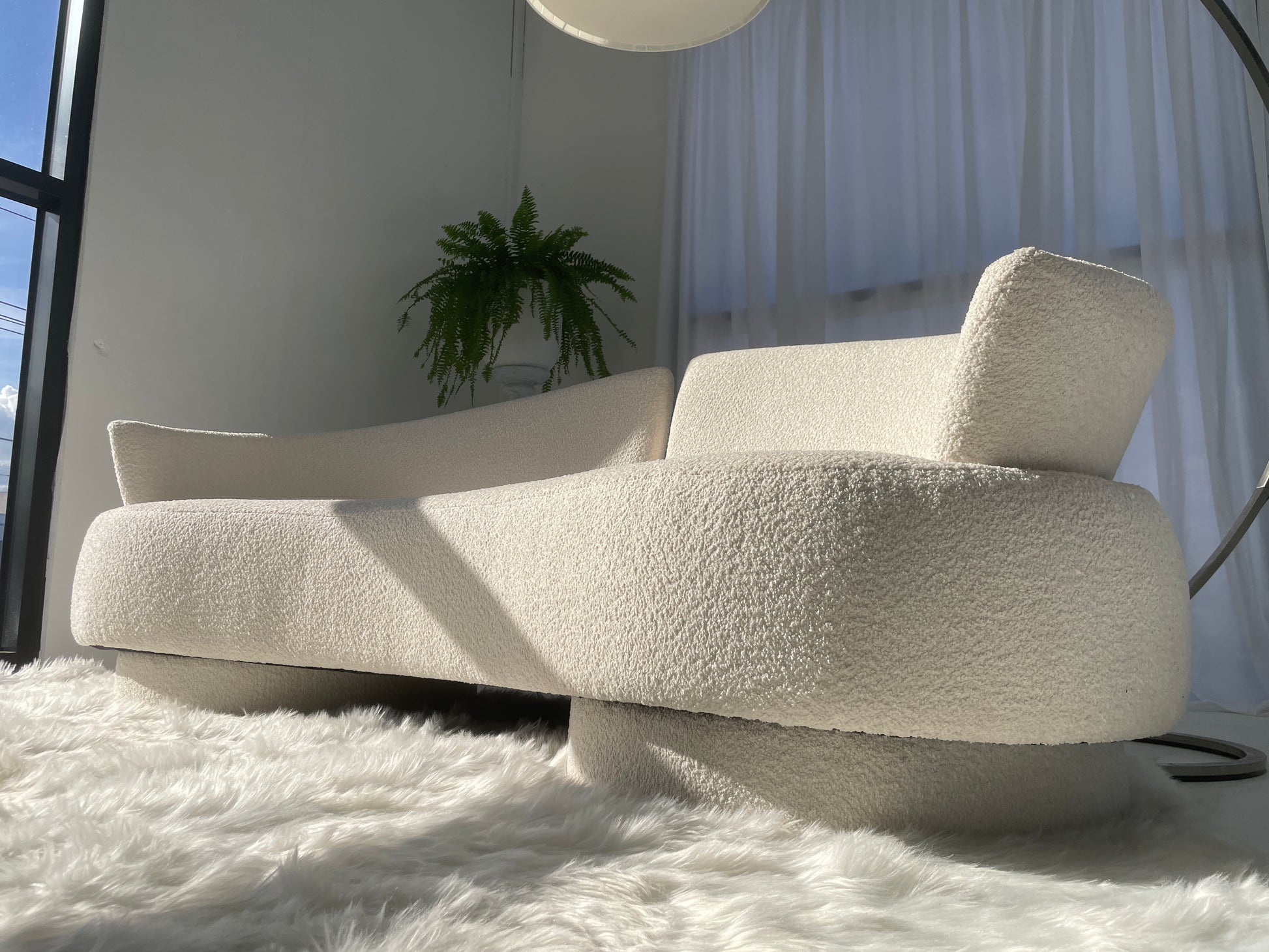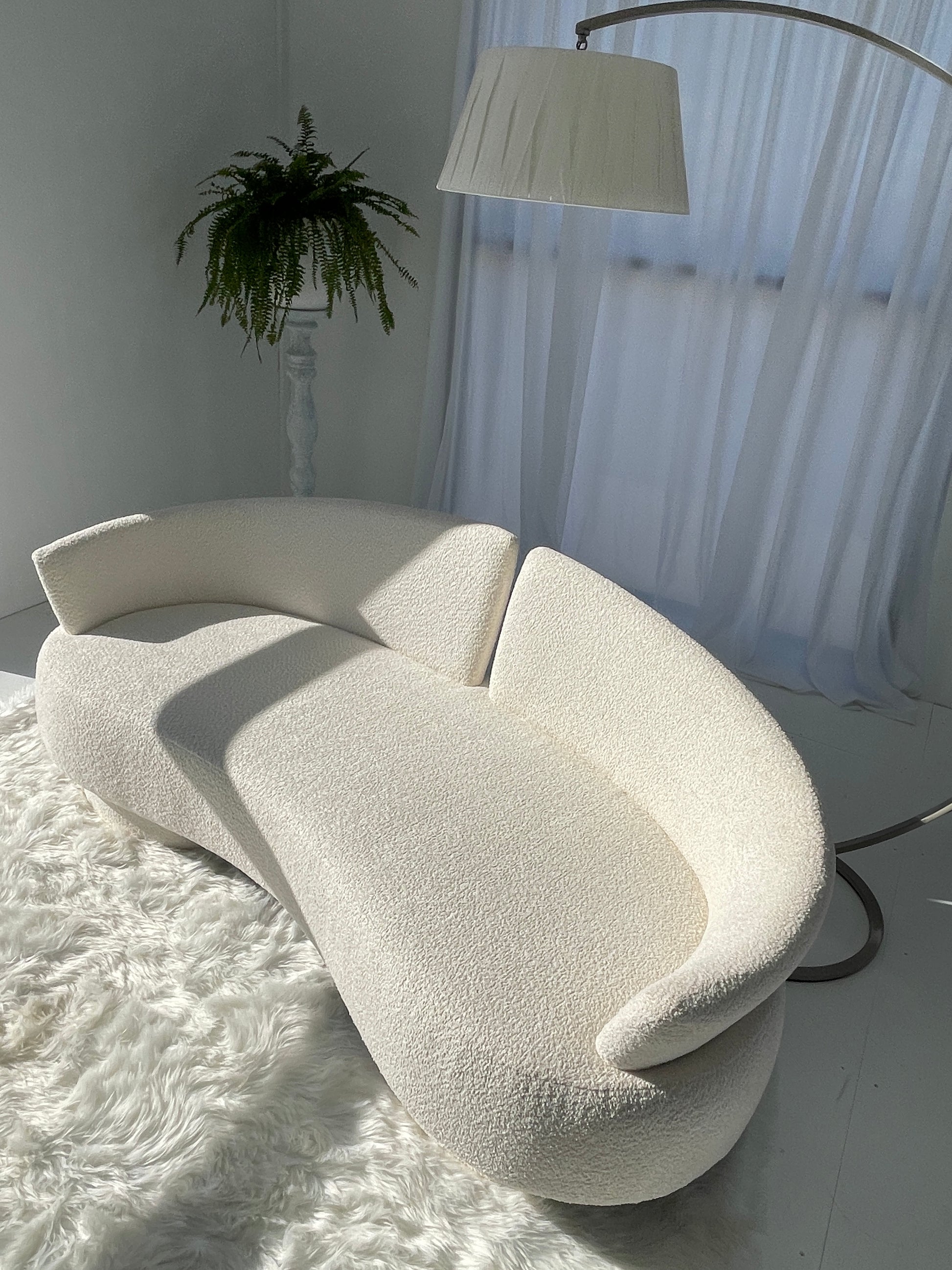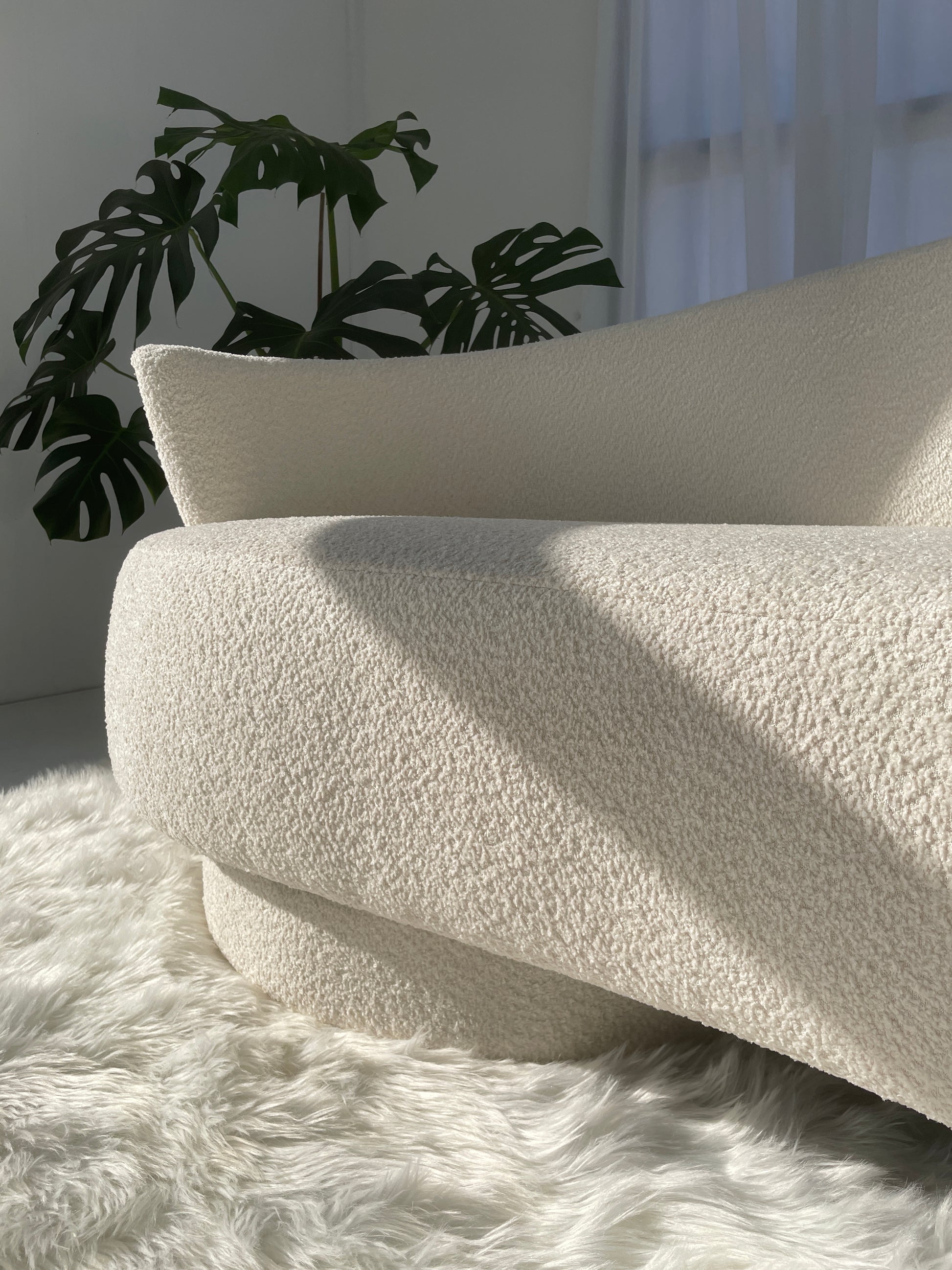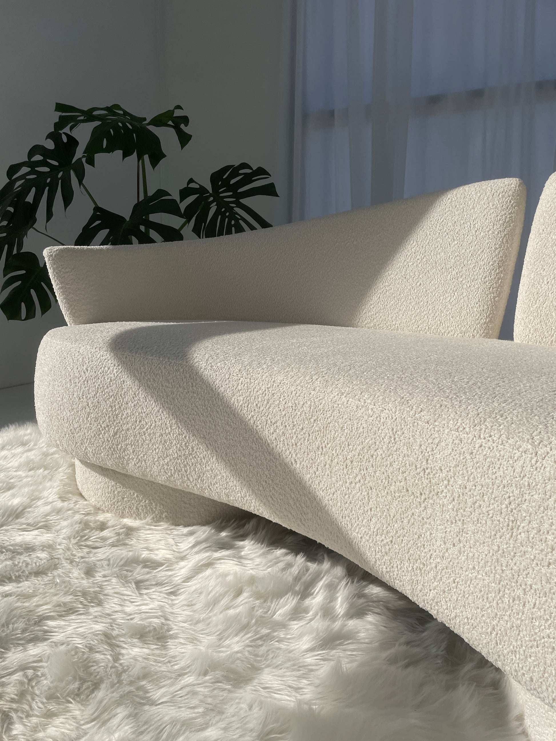 Stunning, freshly upholstered curved sofa in bouclé Snow fabric.