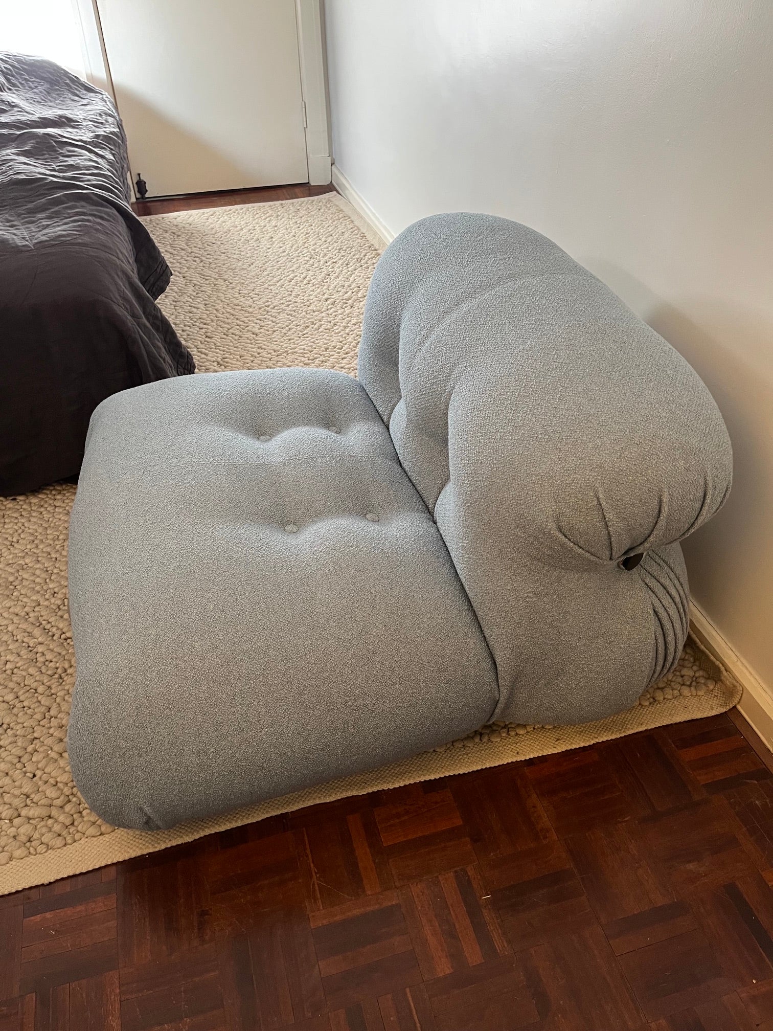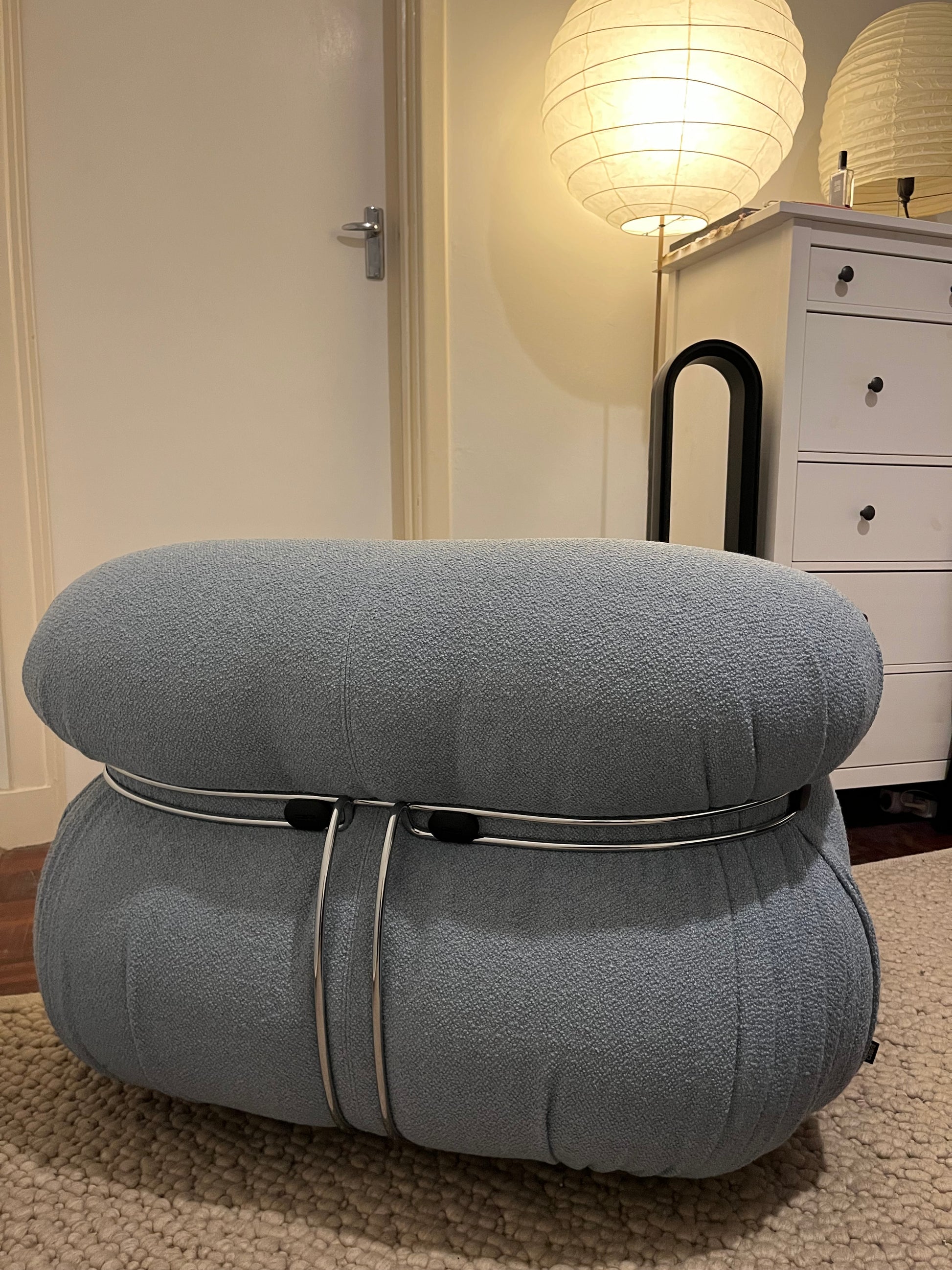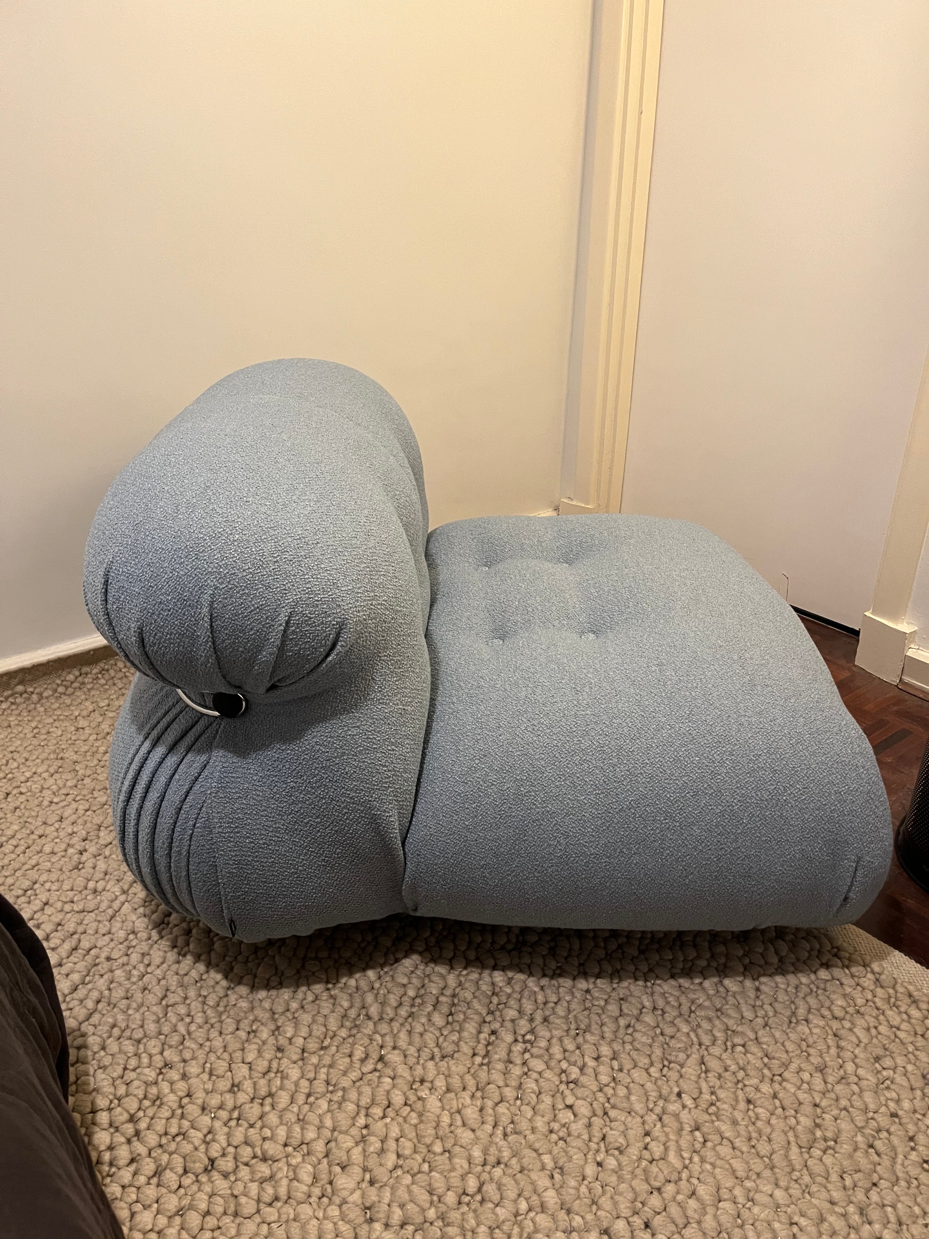 Ordered from Italy in Cielo blue wool boucle and silver hardware.