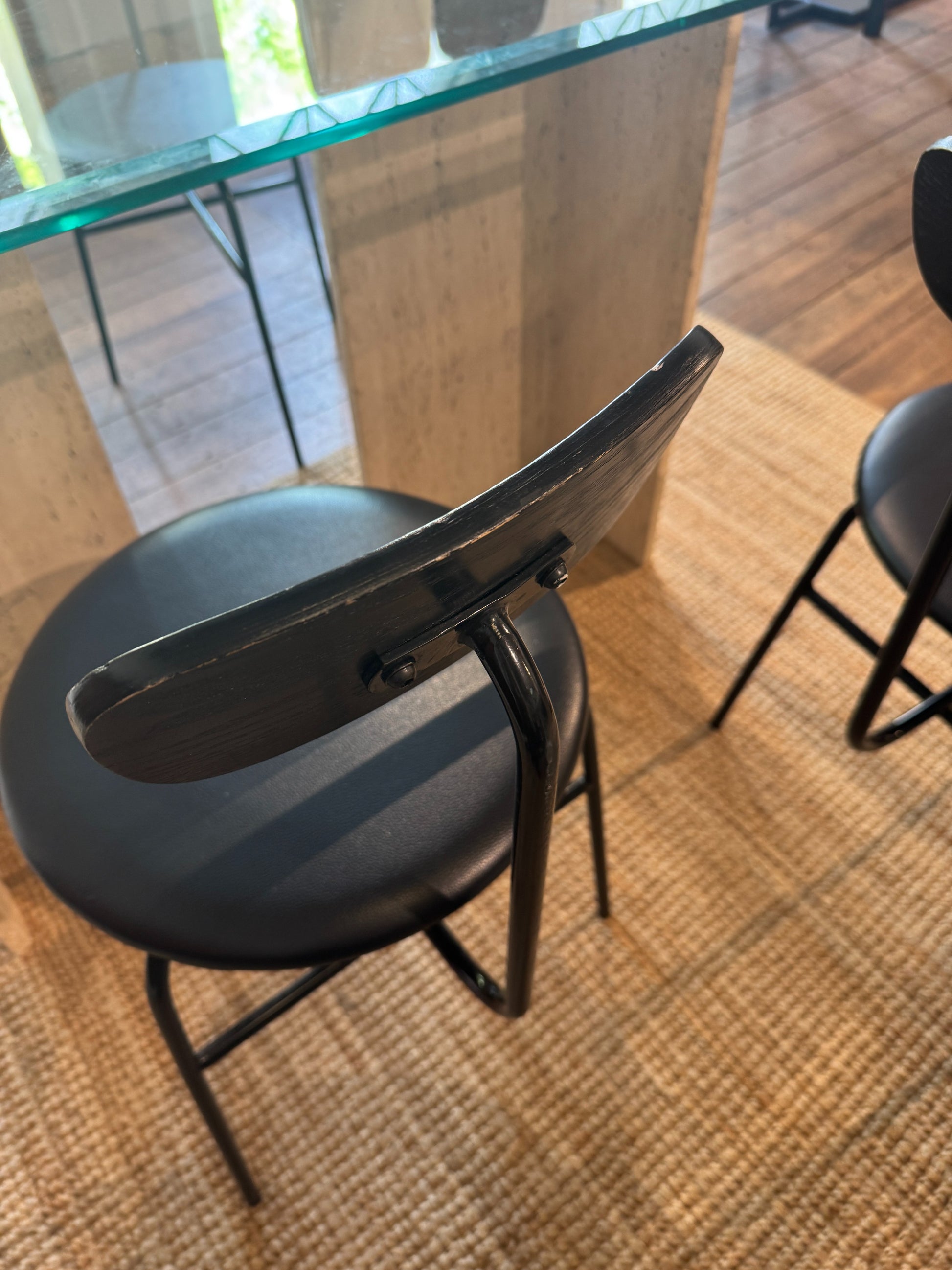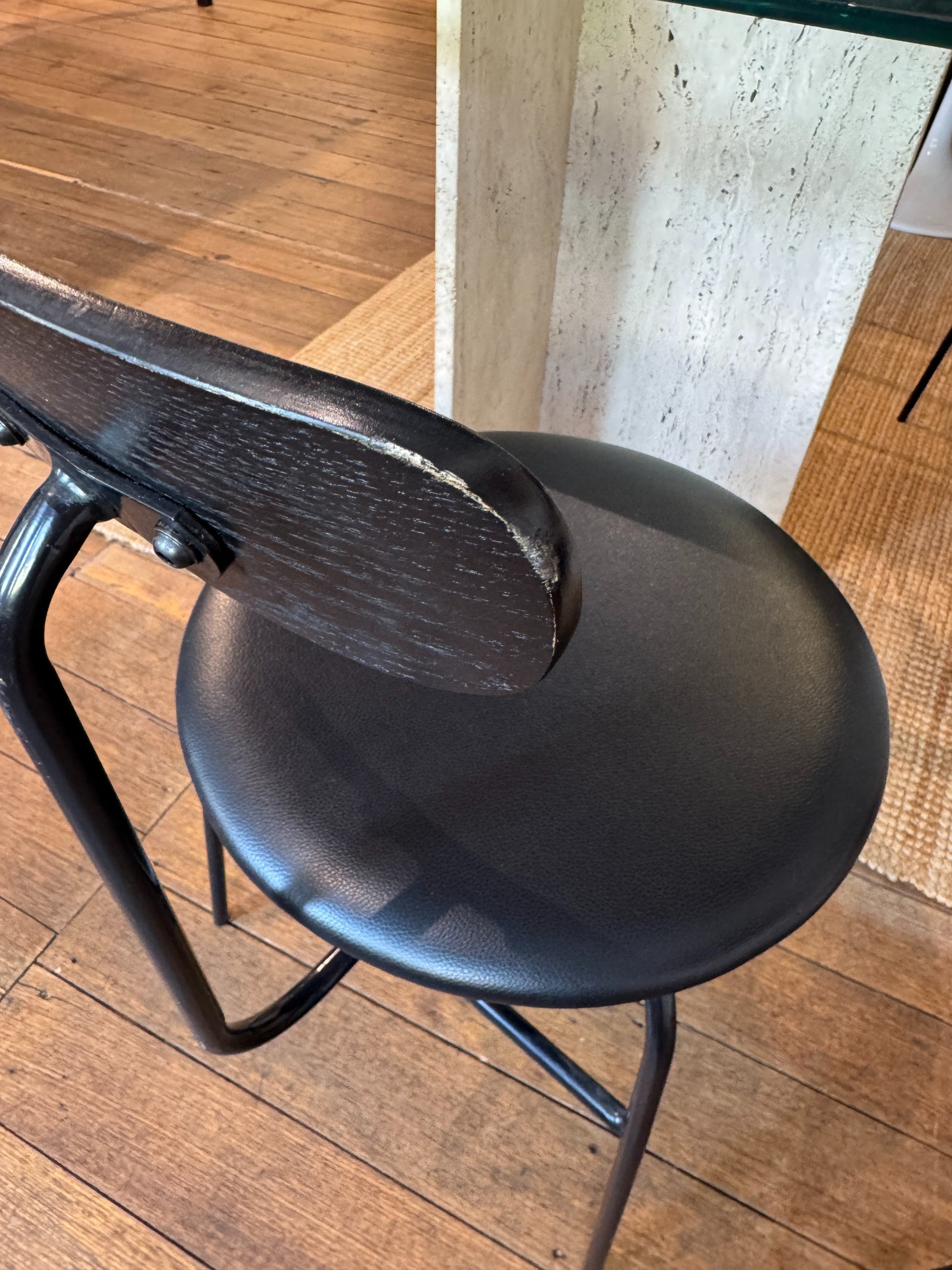 Set of four modern black menu chairs in good condition. Tiny scuff on 1 leather seat and some minor paint chipping on chair back. steel legs all in great condition.