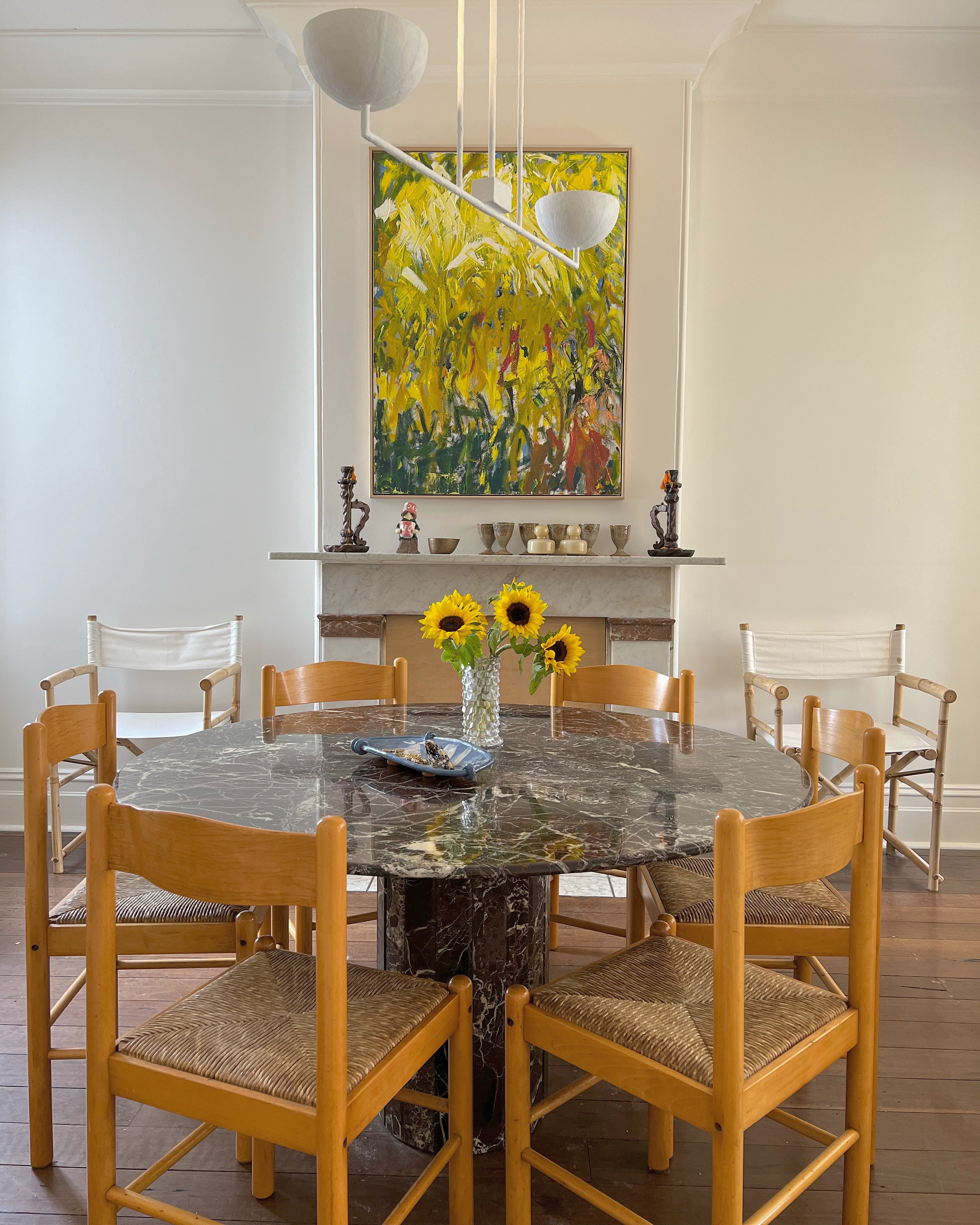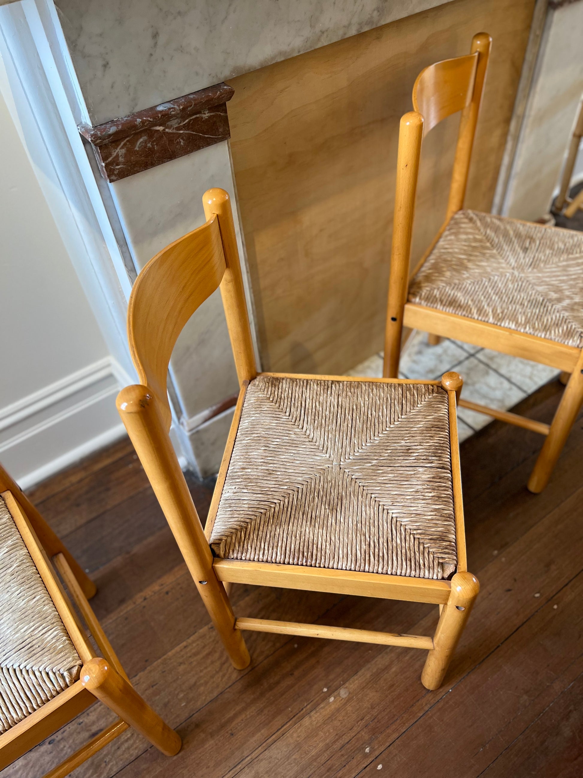 Timber with woven rush seat dining chairs. Set of 6.