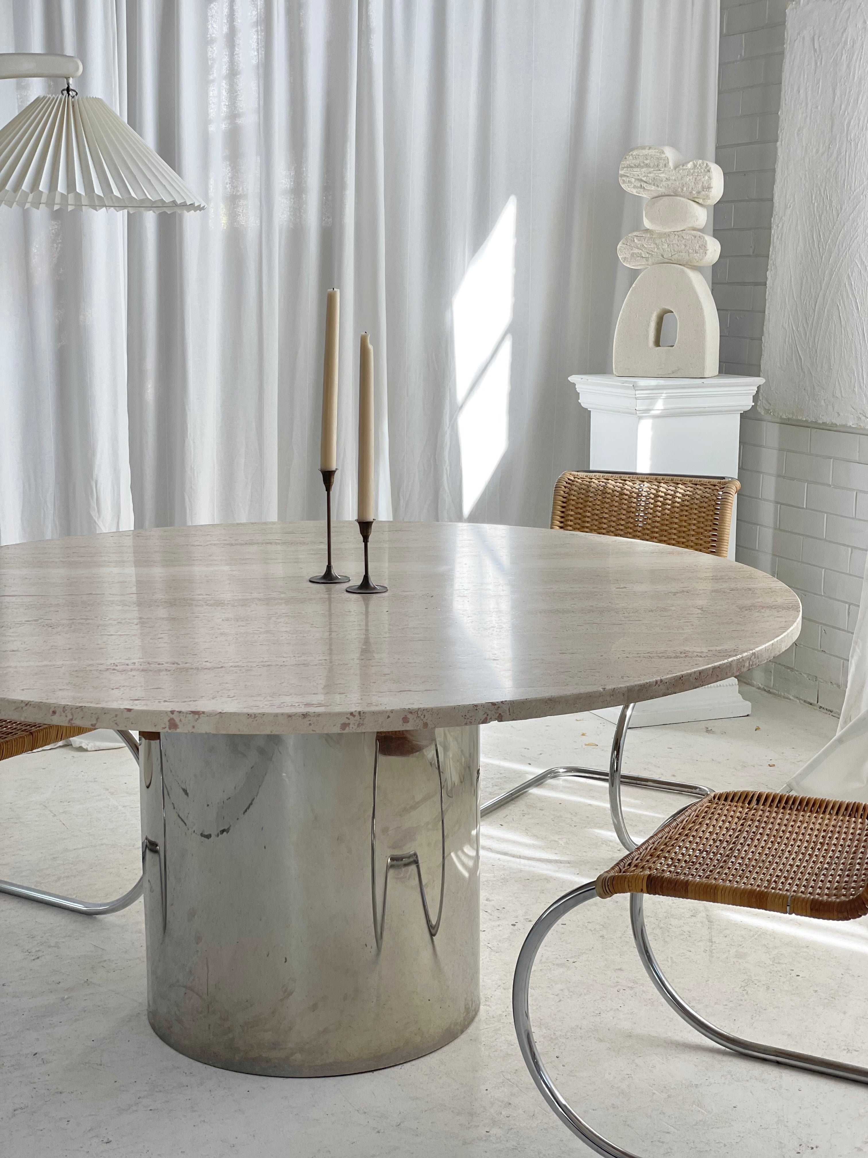 A truly divine statement piece, circa 1980s. Travertine top with steel base with brass inlay. Top and base separate for transport.