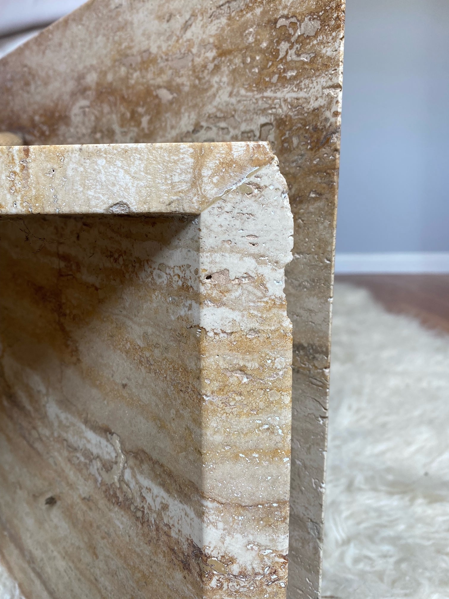 Travertine split level coffee table featuring beautiful pink beige and brown tones.