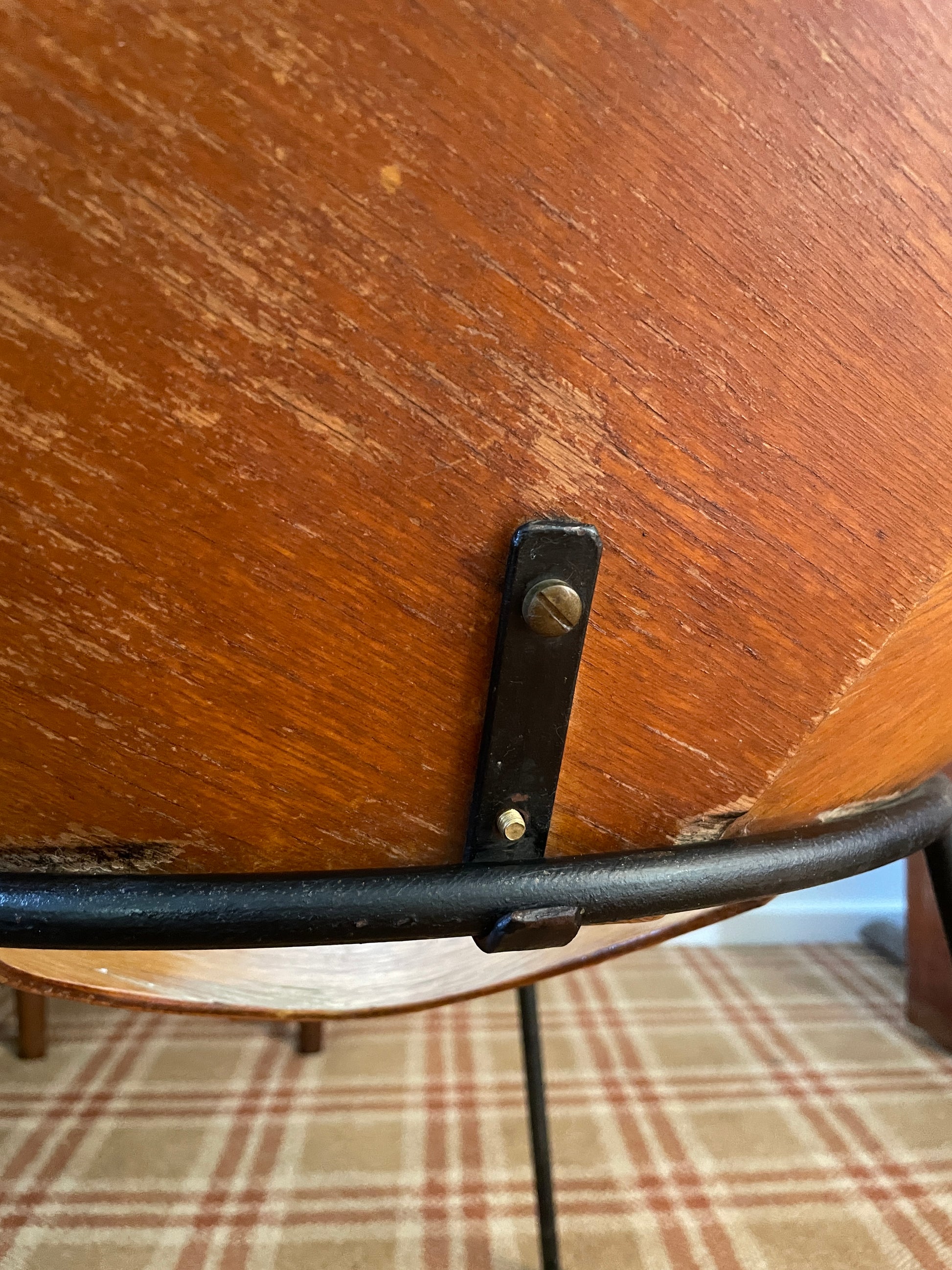 The plywood has been polished prior to listing but has wear to the finish on the back of the seat. The legs have some tarnish even after a good clean.