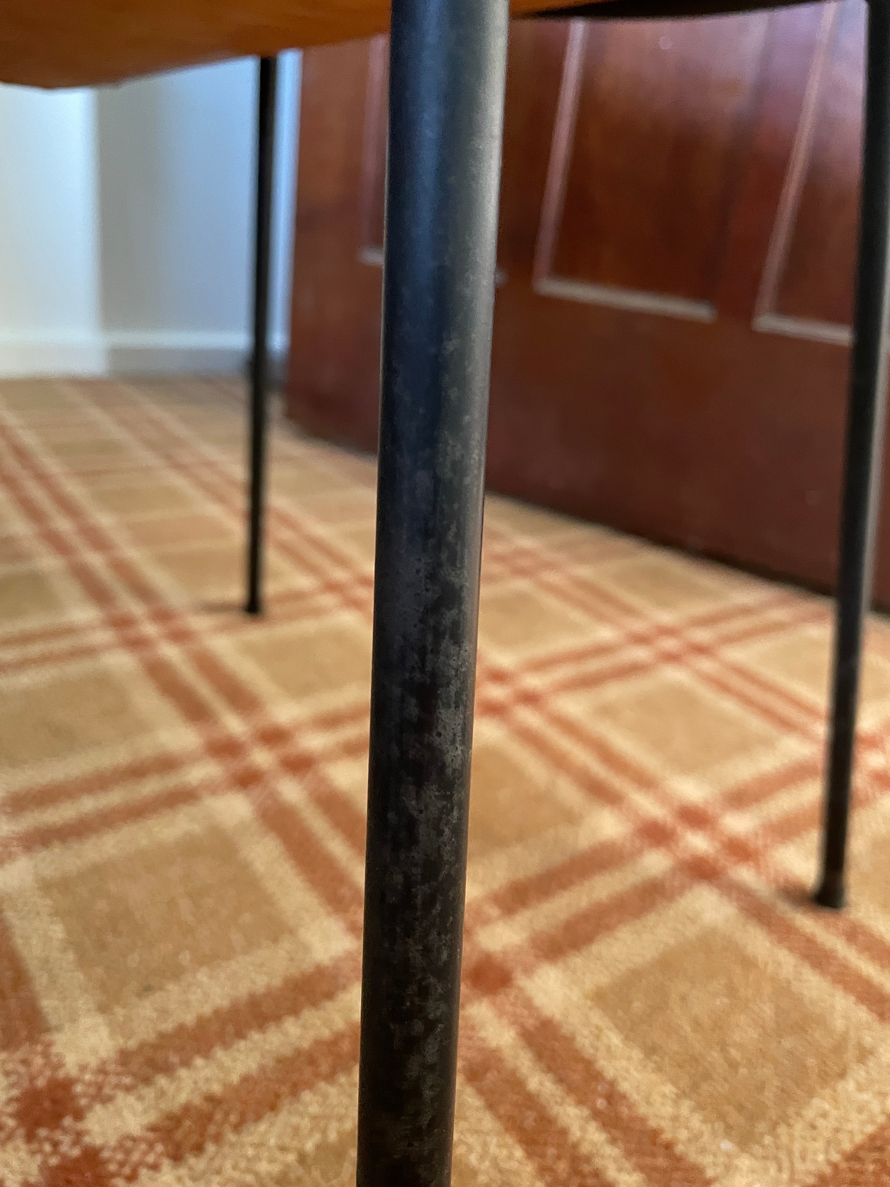 New rubber stoppers have been added to the end of the steel legs and one of the bolts that attaches the plywood seat to the legs has been replaced.