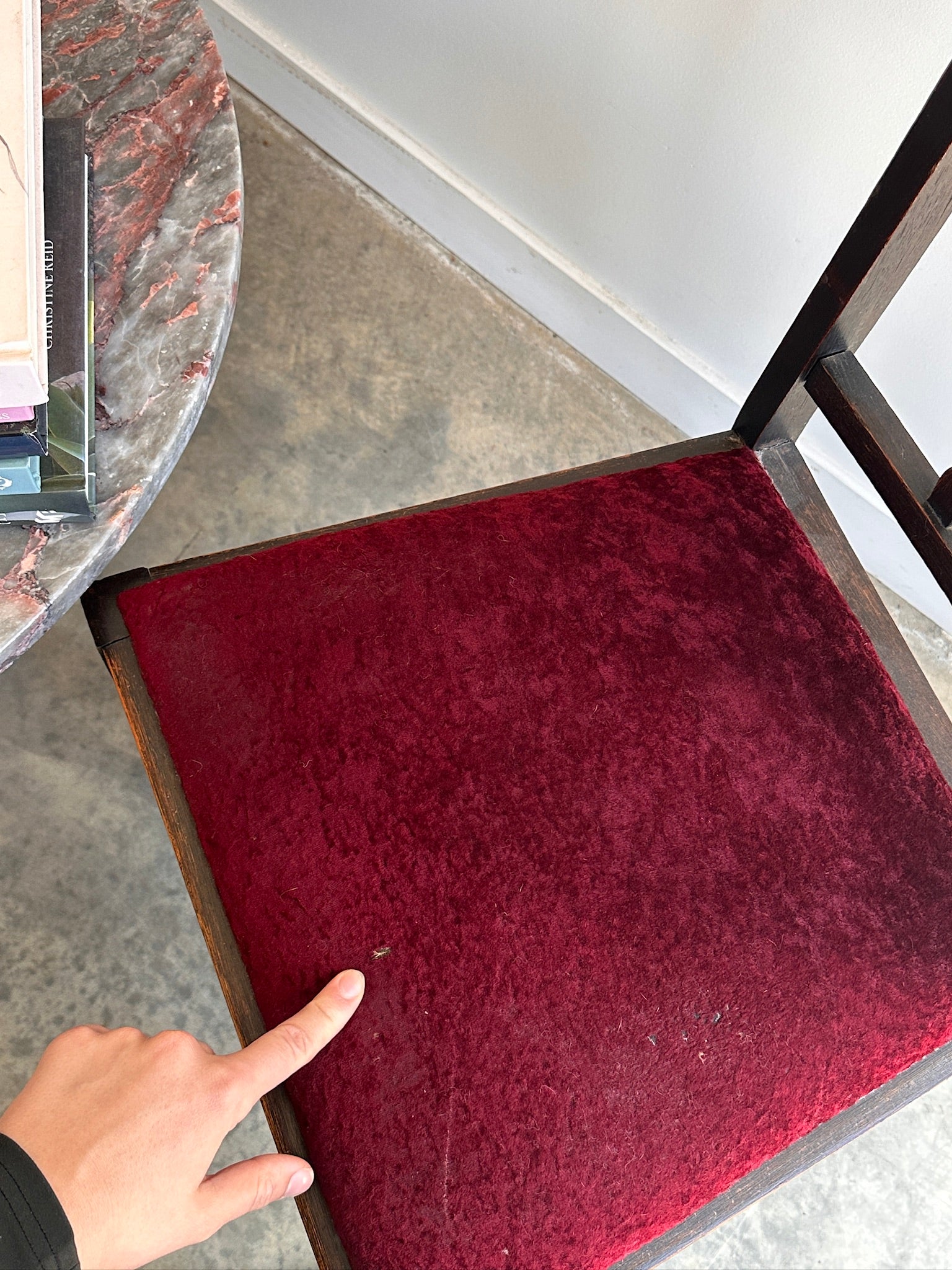 This chair presents in beautiful original condition. There is a slight misalignment in some of the joins due to age. Timber has many dings and bumps from wear over the years. This does not distract from it's beauty but adds to it's character. Please note this chair is very old, but still very functional. Some smalls imperfections & wear in the velvet upholstery. (See photos).