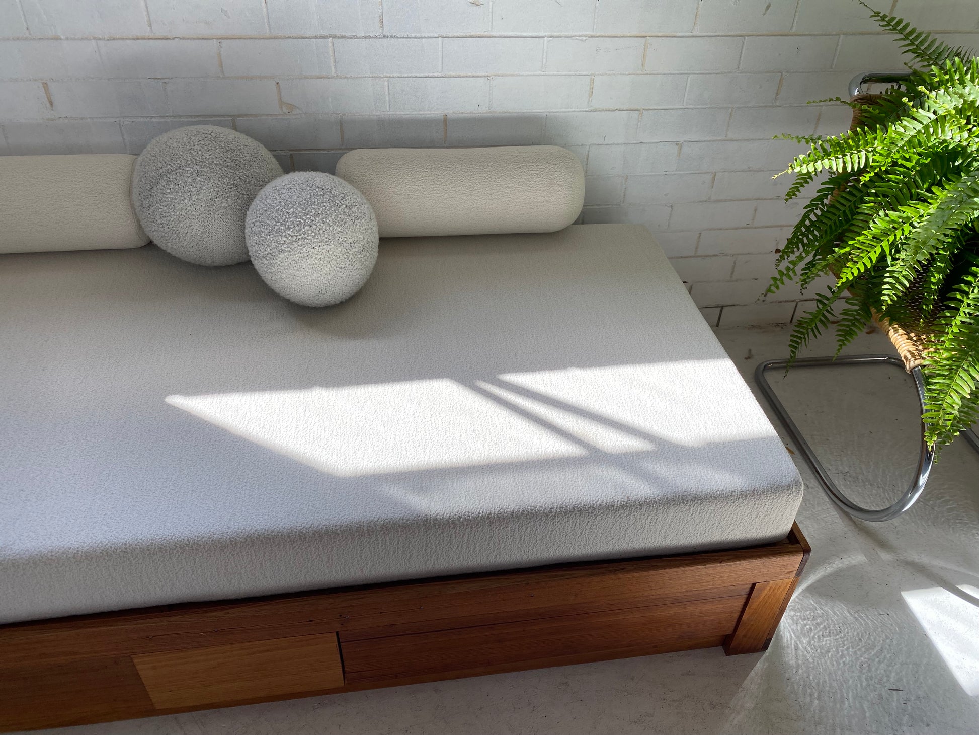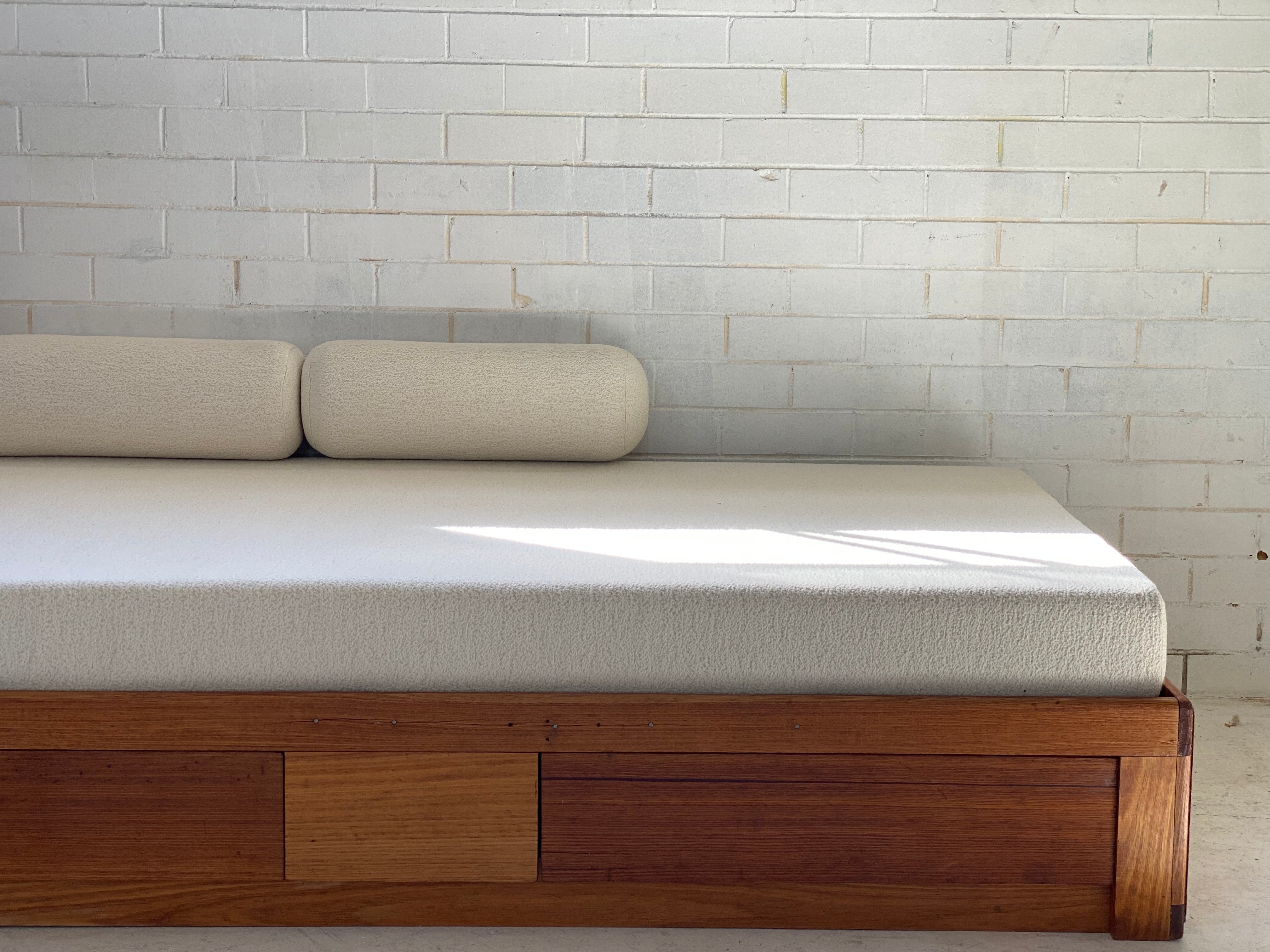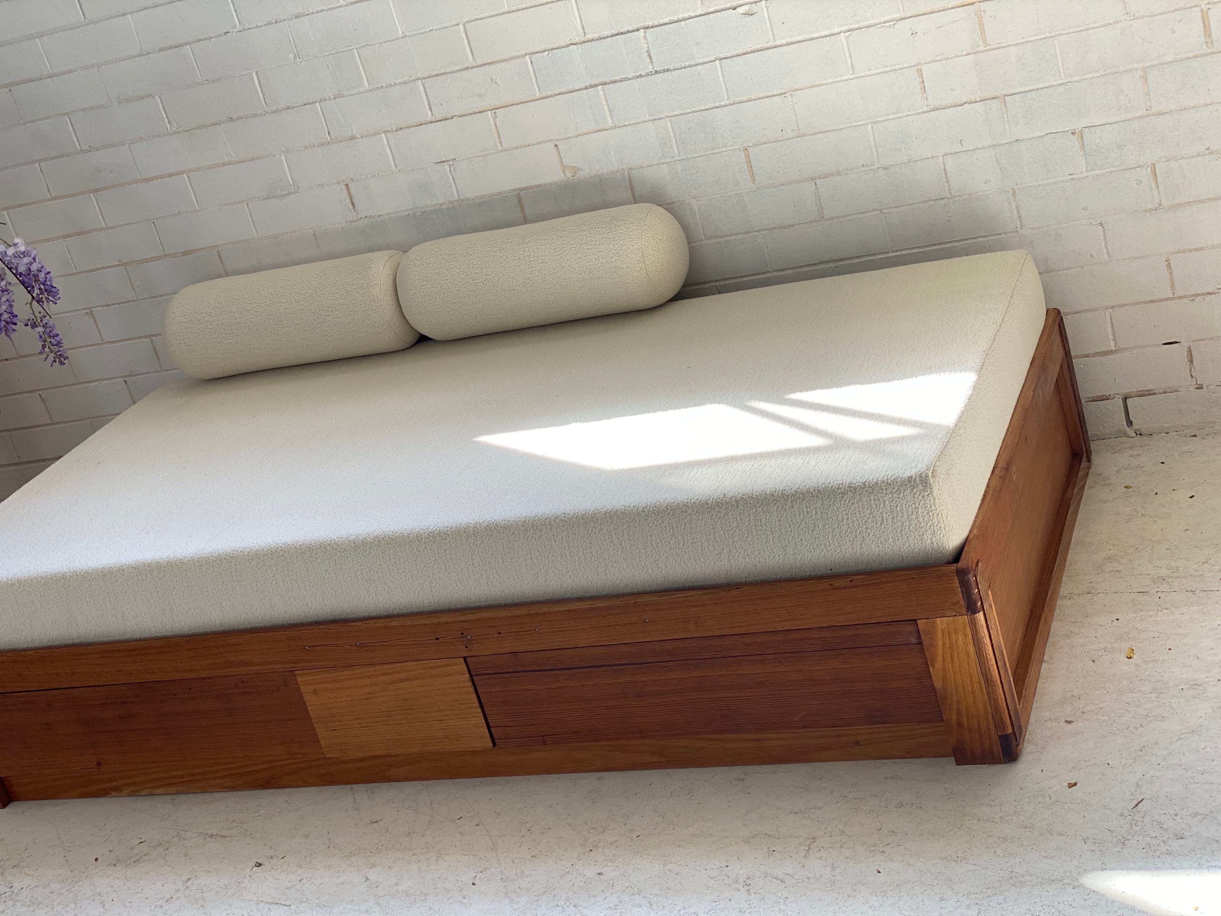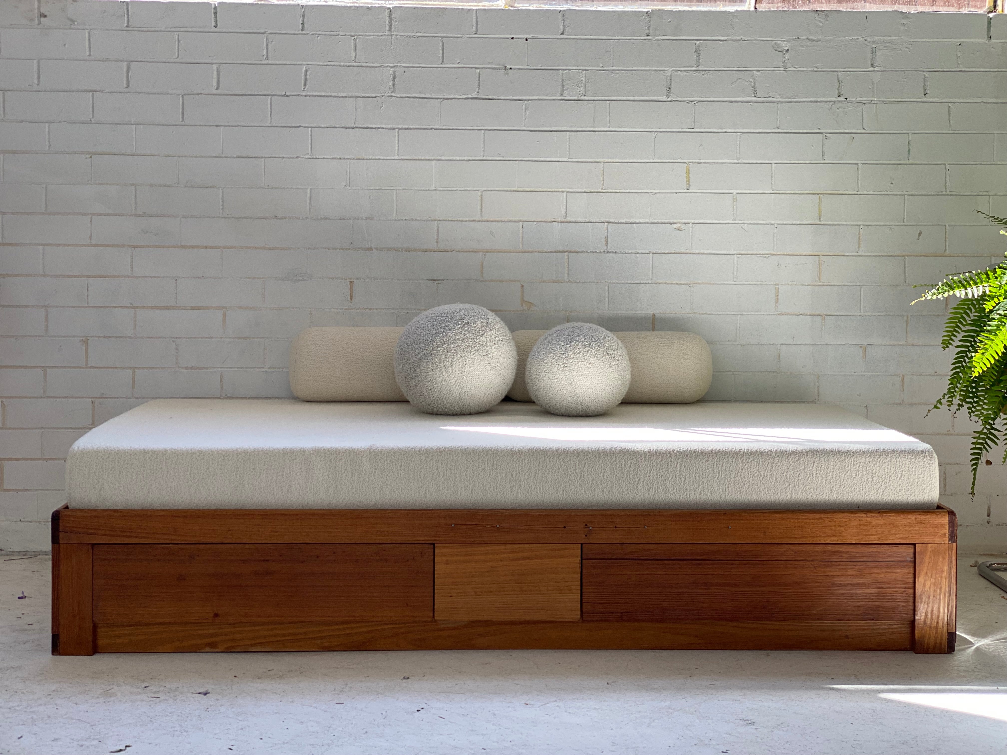 New mattress and foam bolster cushions freshly upholstered in a quality imported cream boucle fabric.