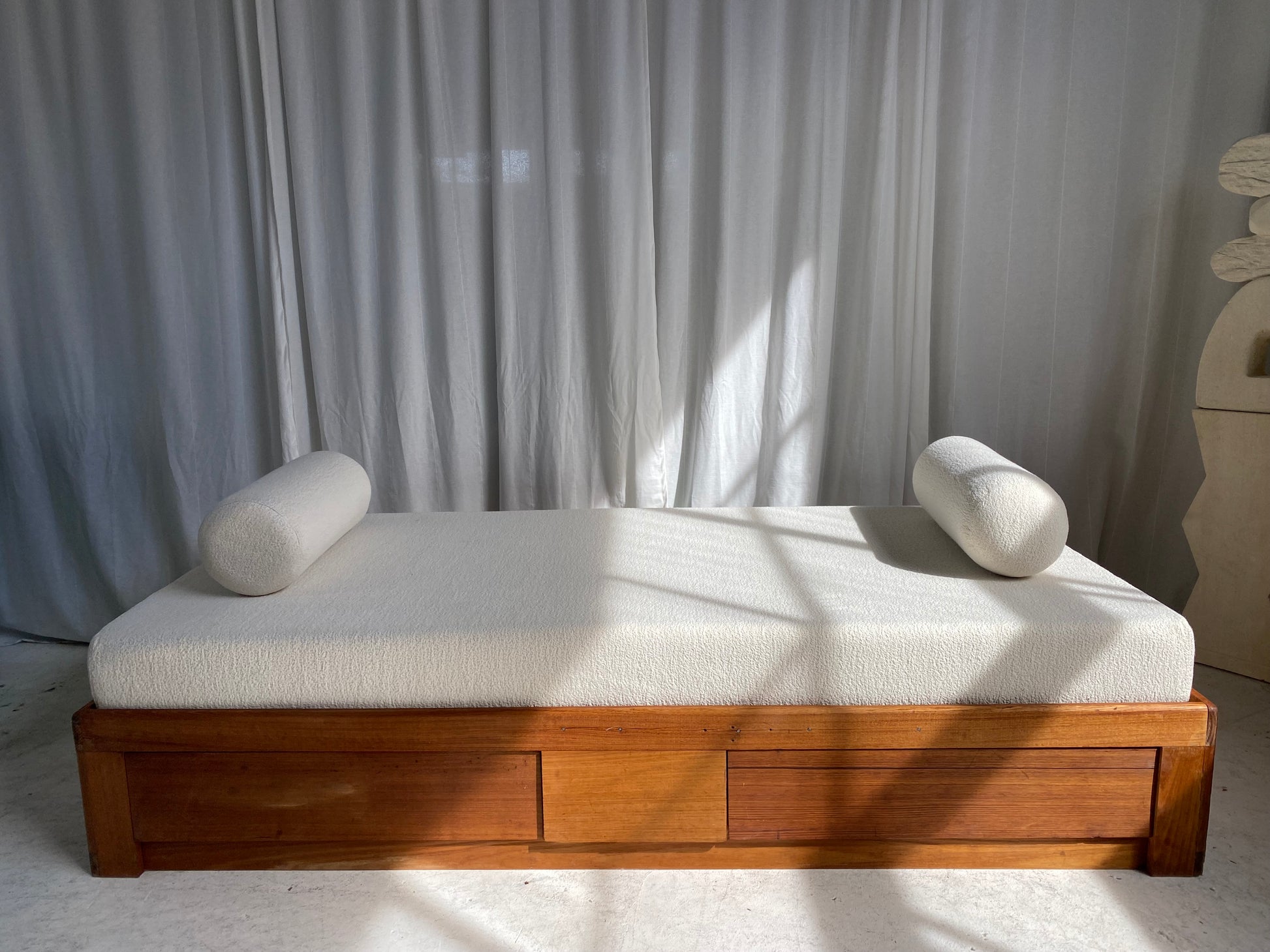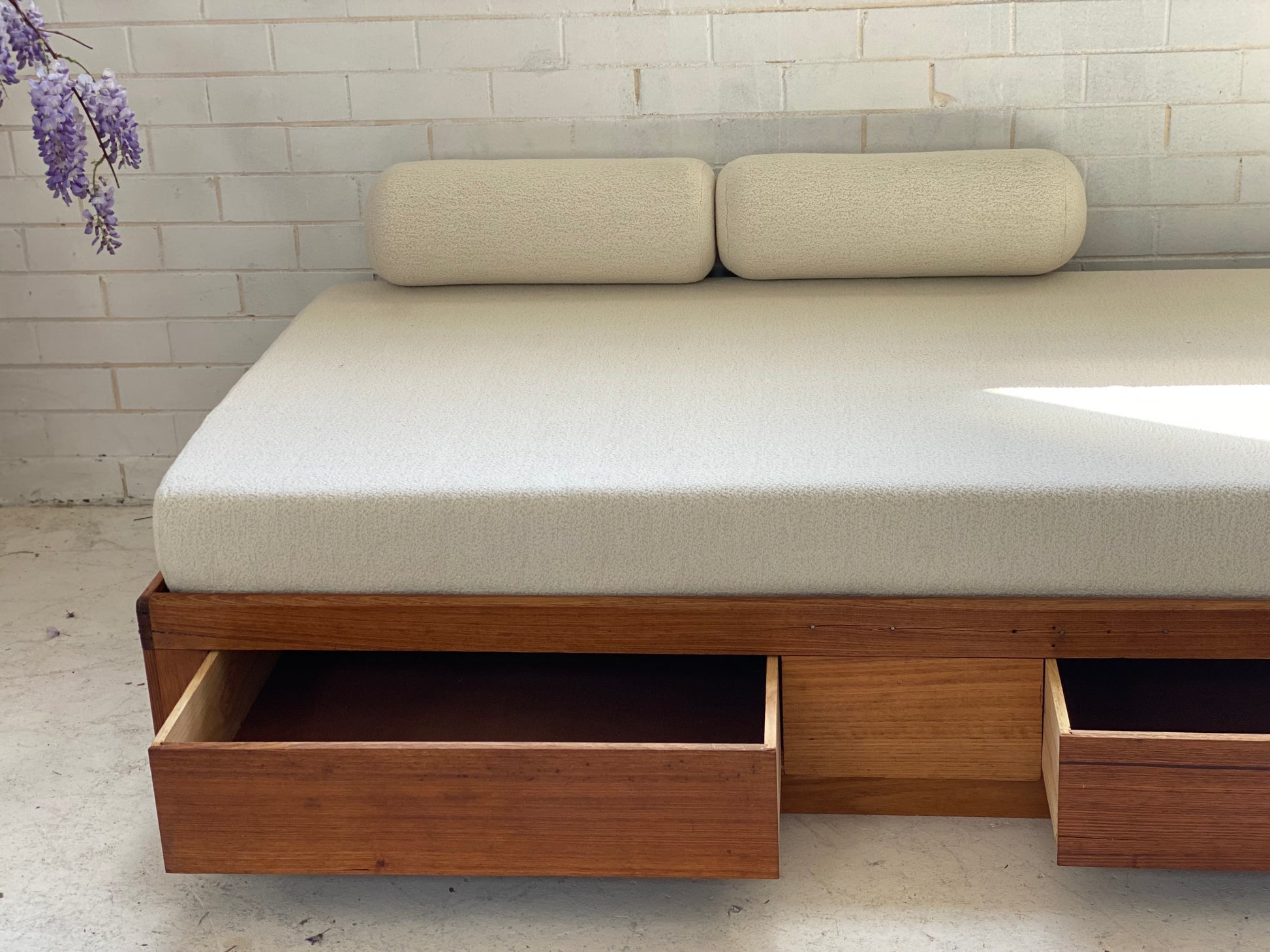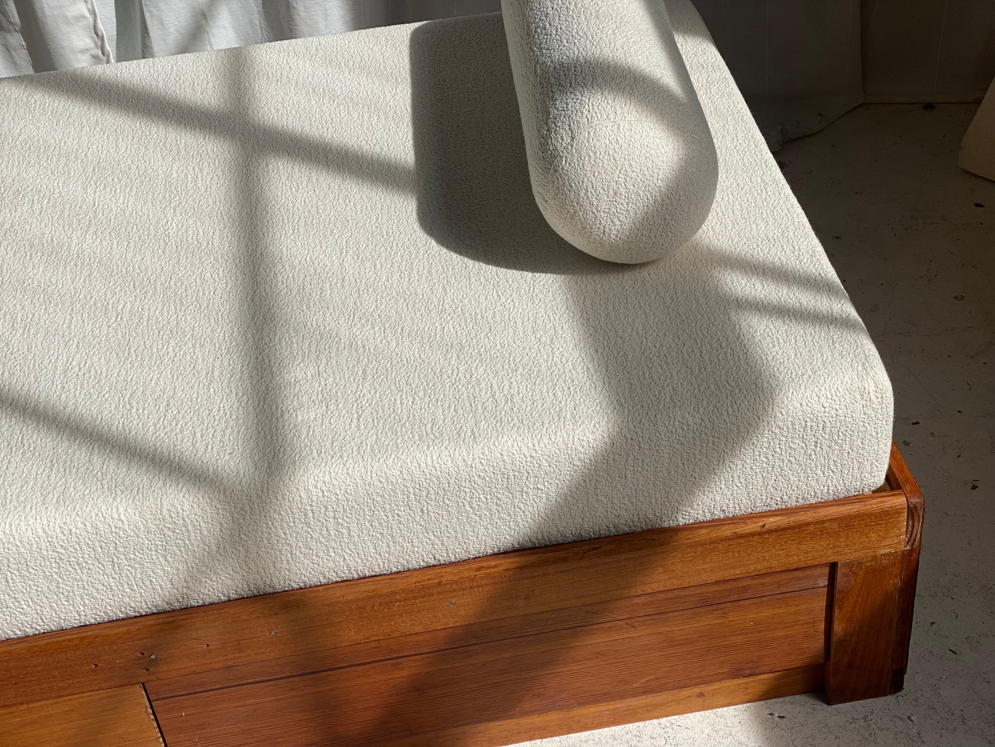 New mattress and foam bolster cushions freshly upholstered in a quality imported cream boucle fabric.