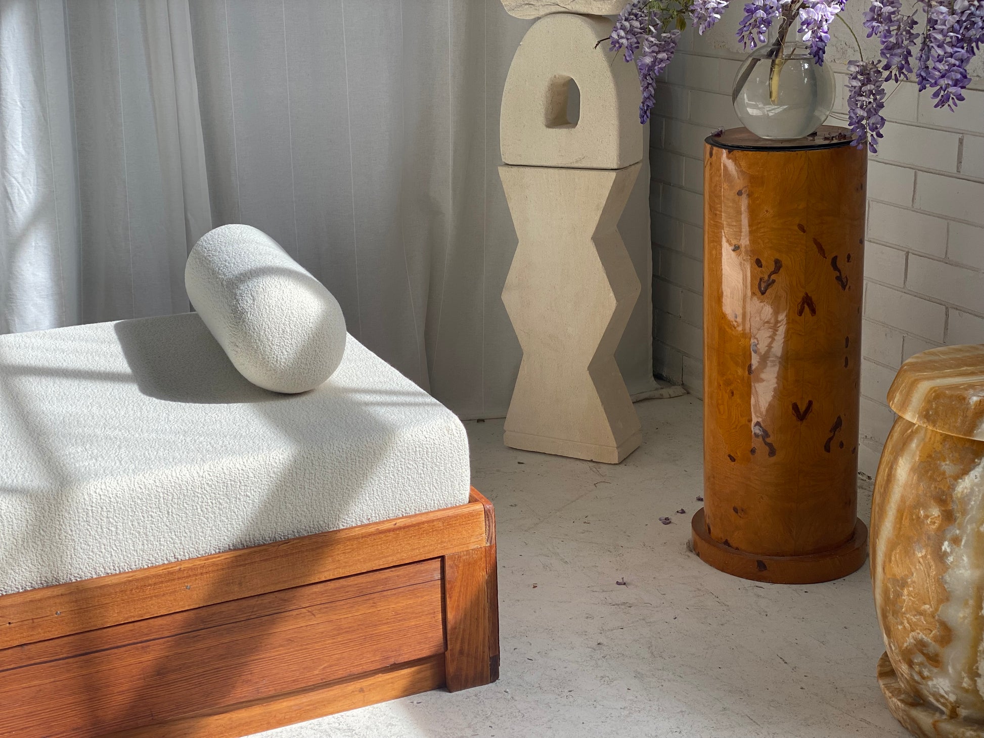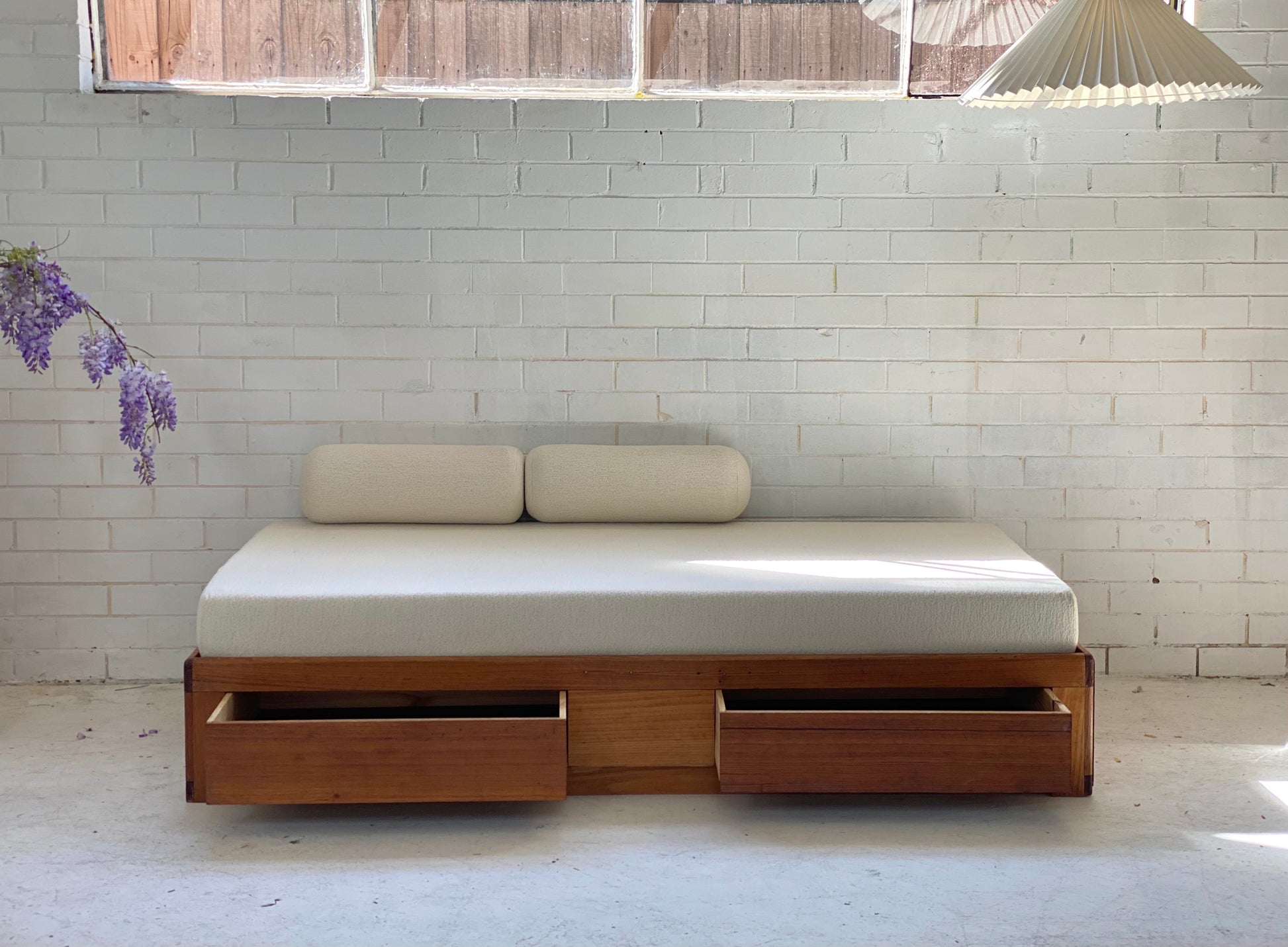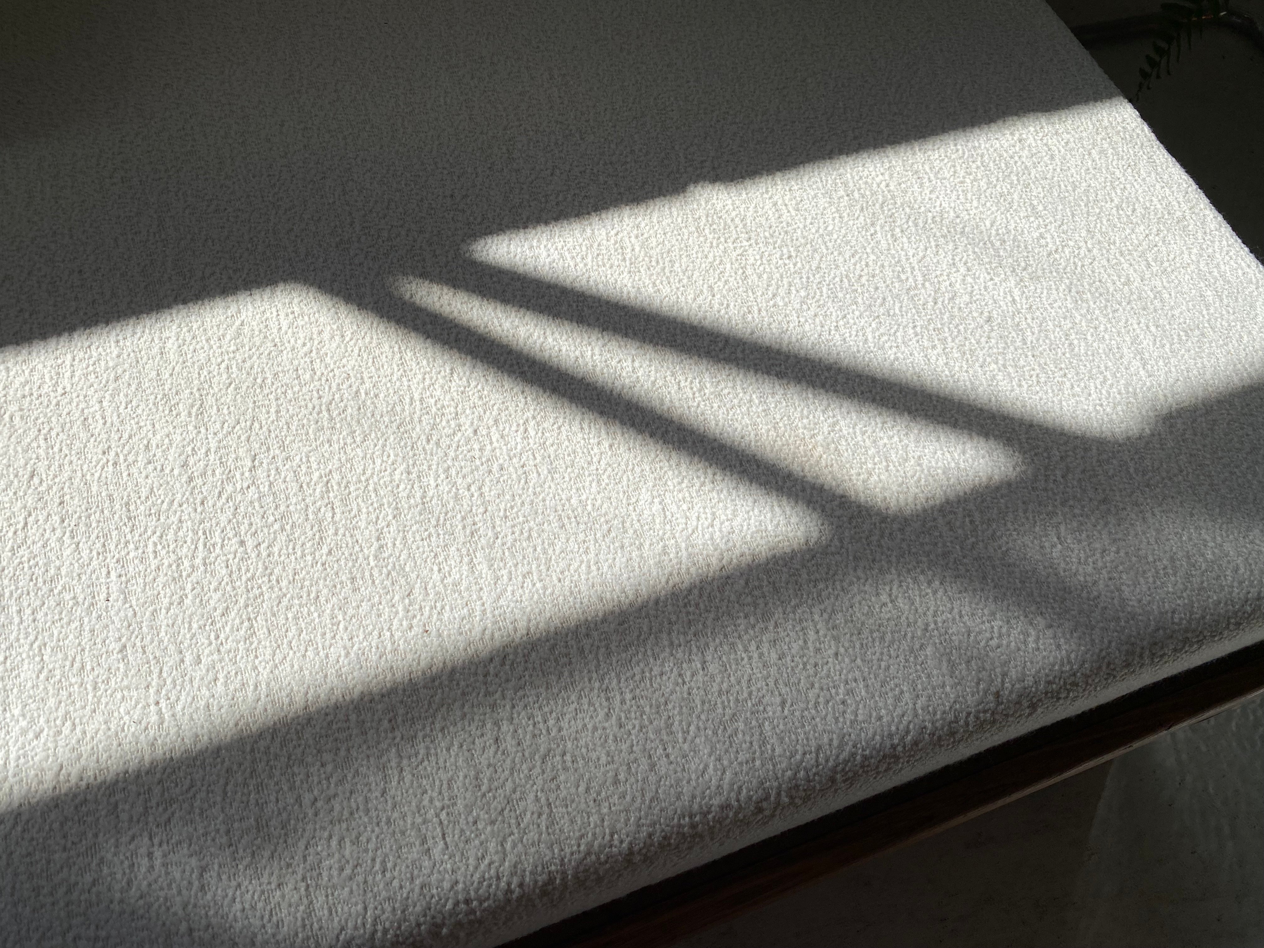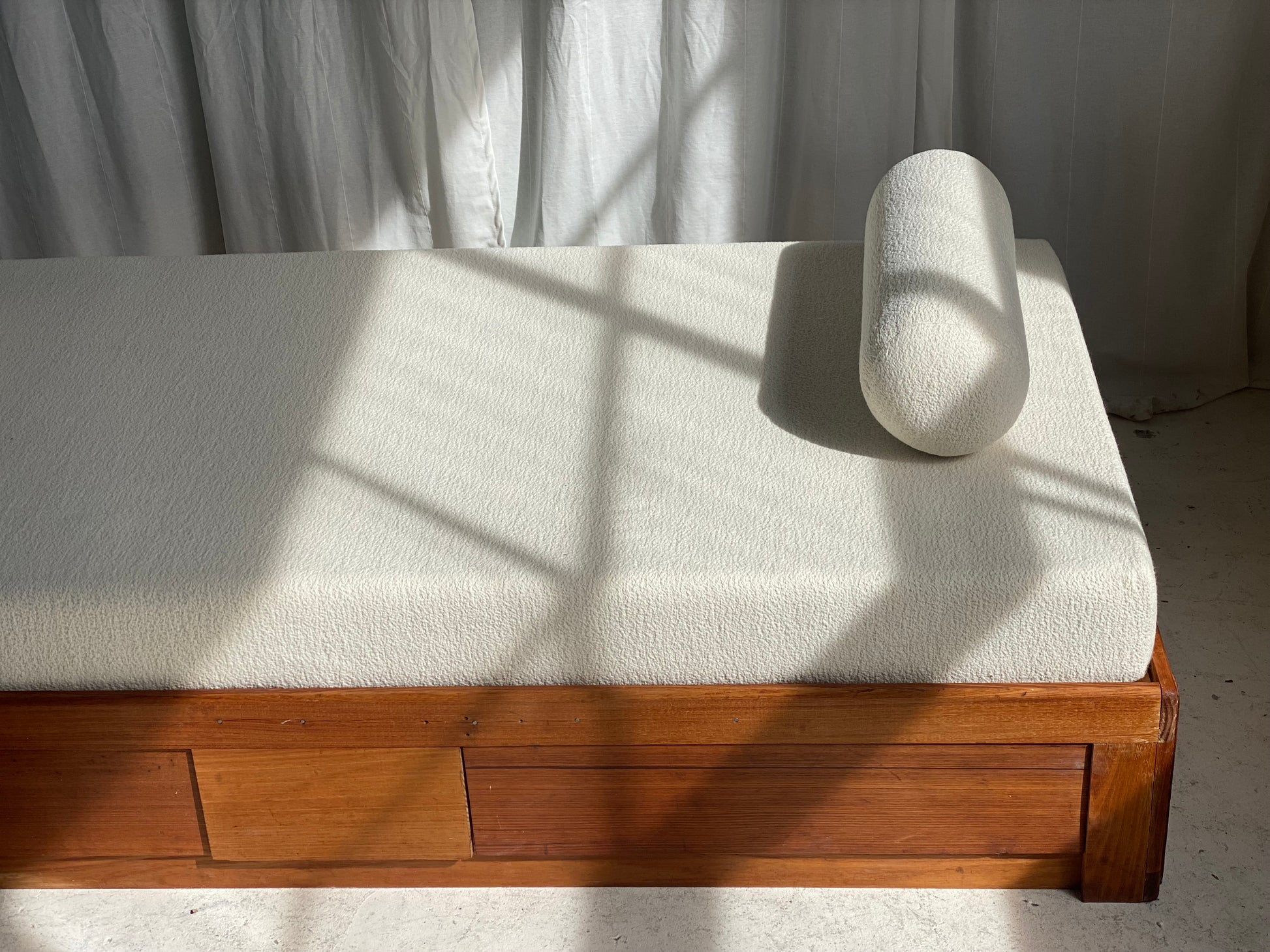 New mattress and foam bolster cushions freshly upholstered in a quality imported cream boucle fabric.