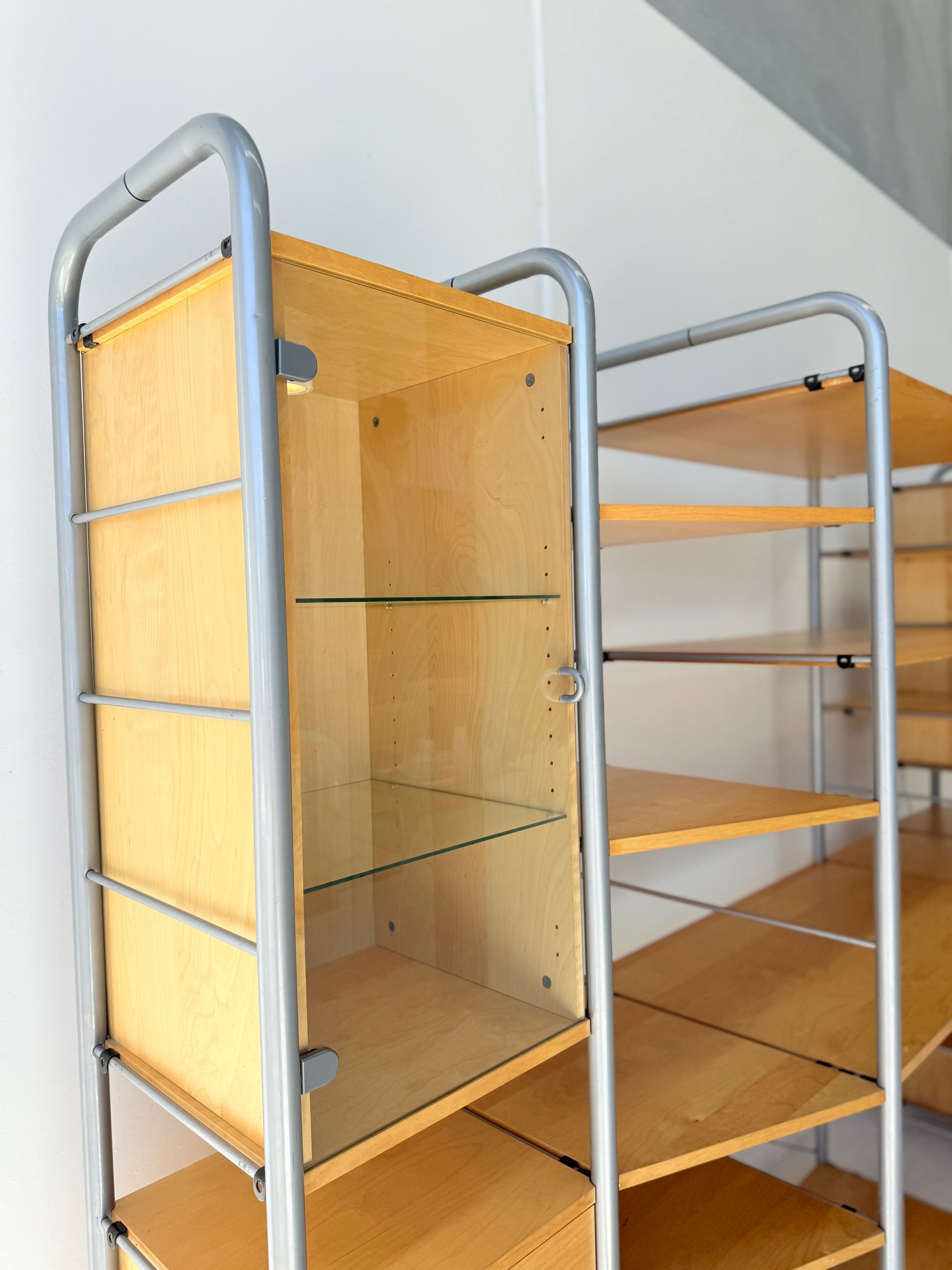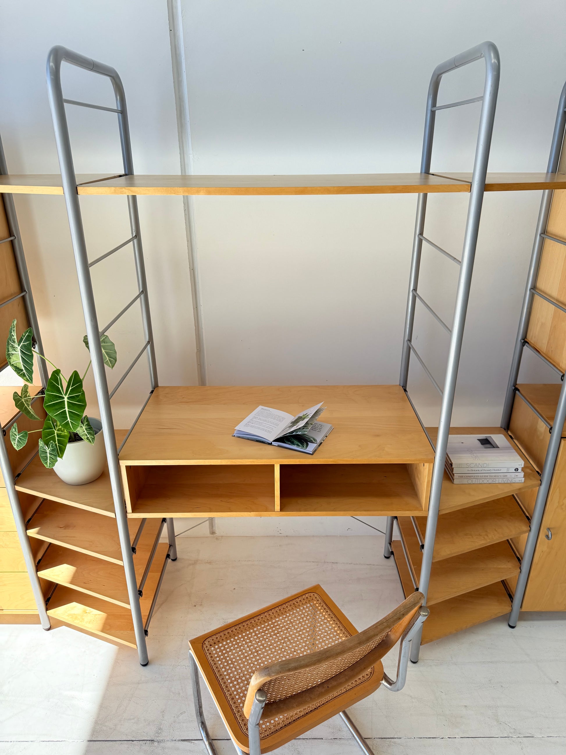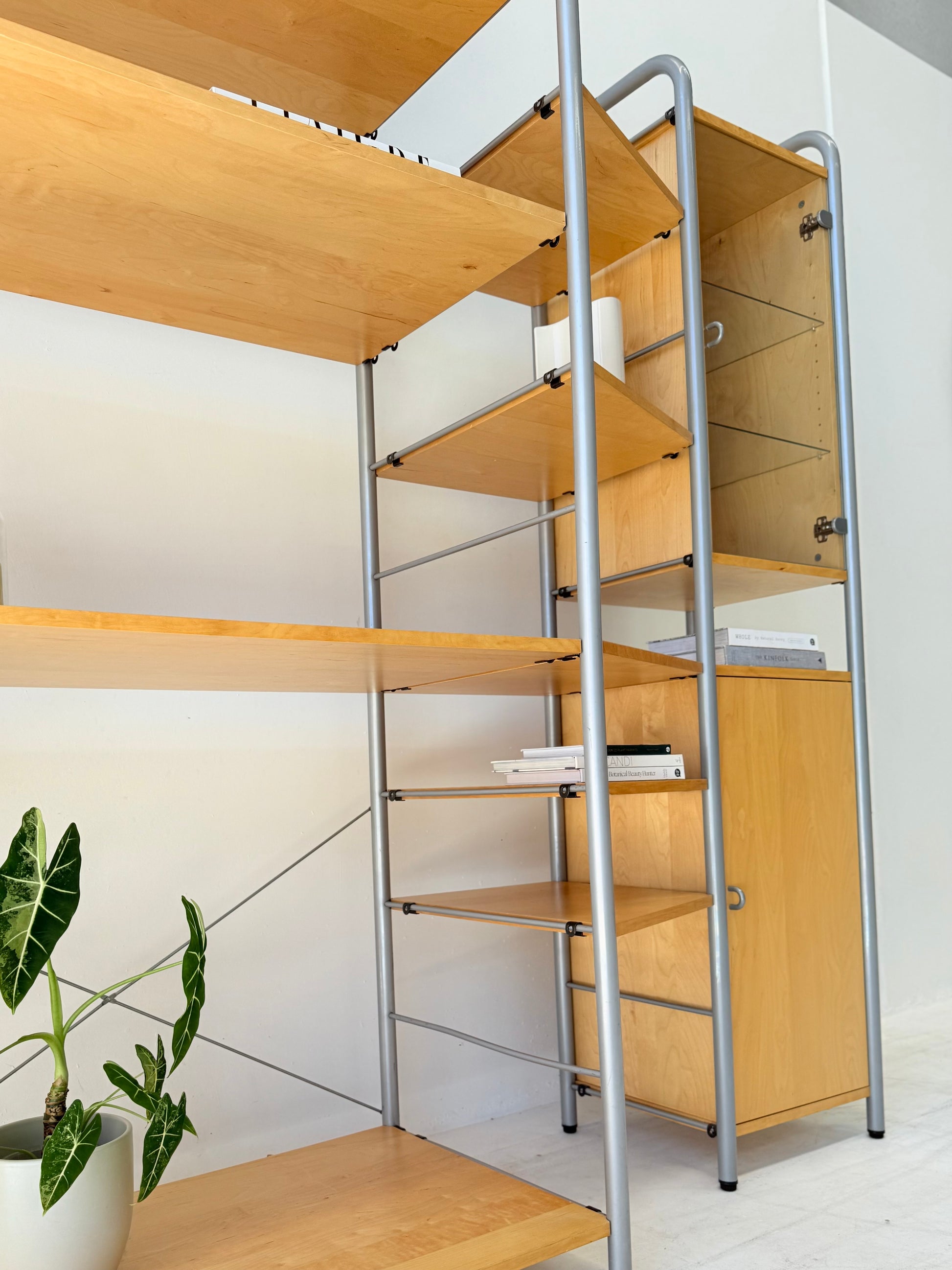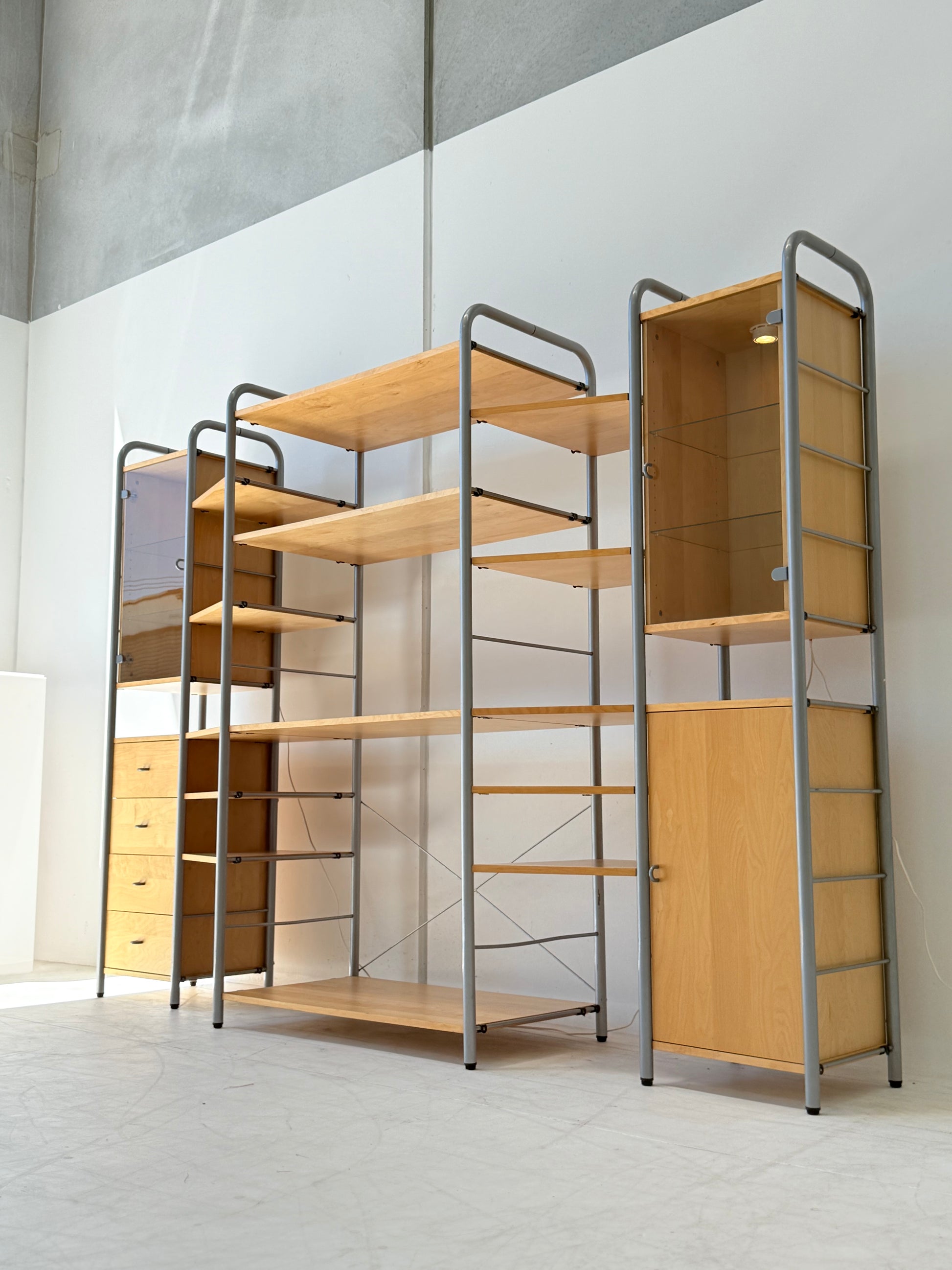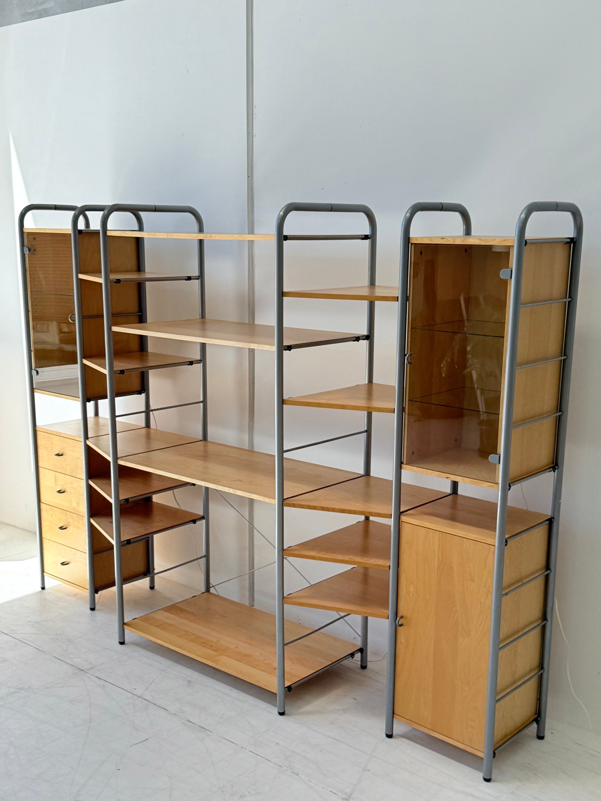Sought after vintage shelving unit consisting of 6 tall ladders, 14 slat shelves with one console shelf (or desk shelf) and four cabinets. Two glass door cabinets with 2 glass shelves each plus lighting, one single 4-drawer cabinet and one single cupboard with 2 shelves.