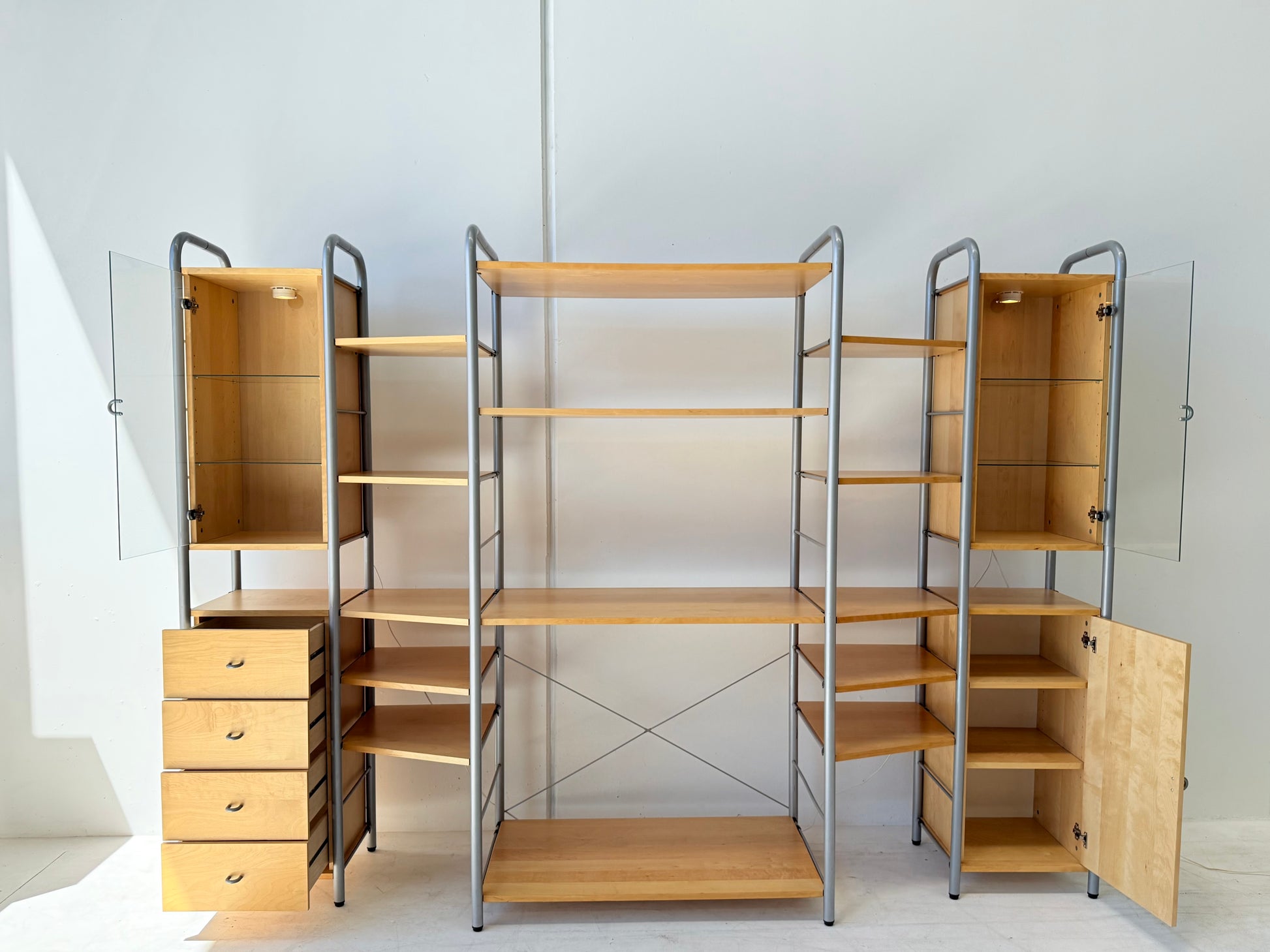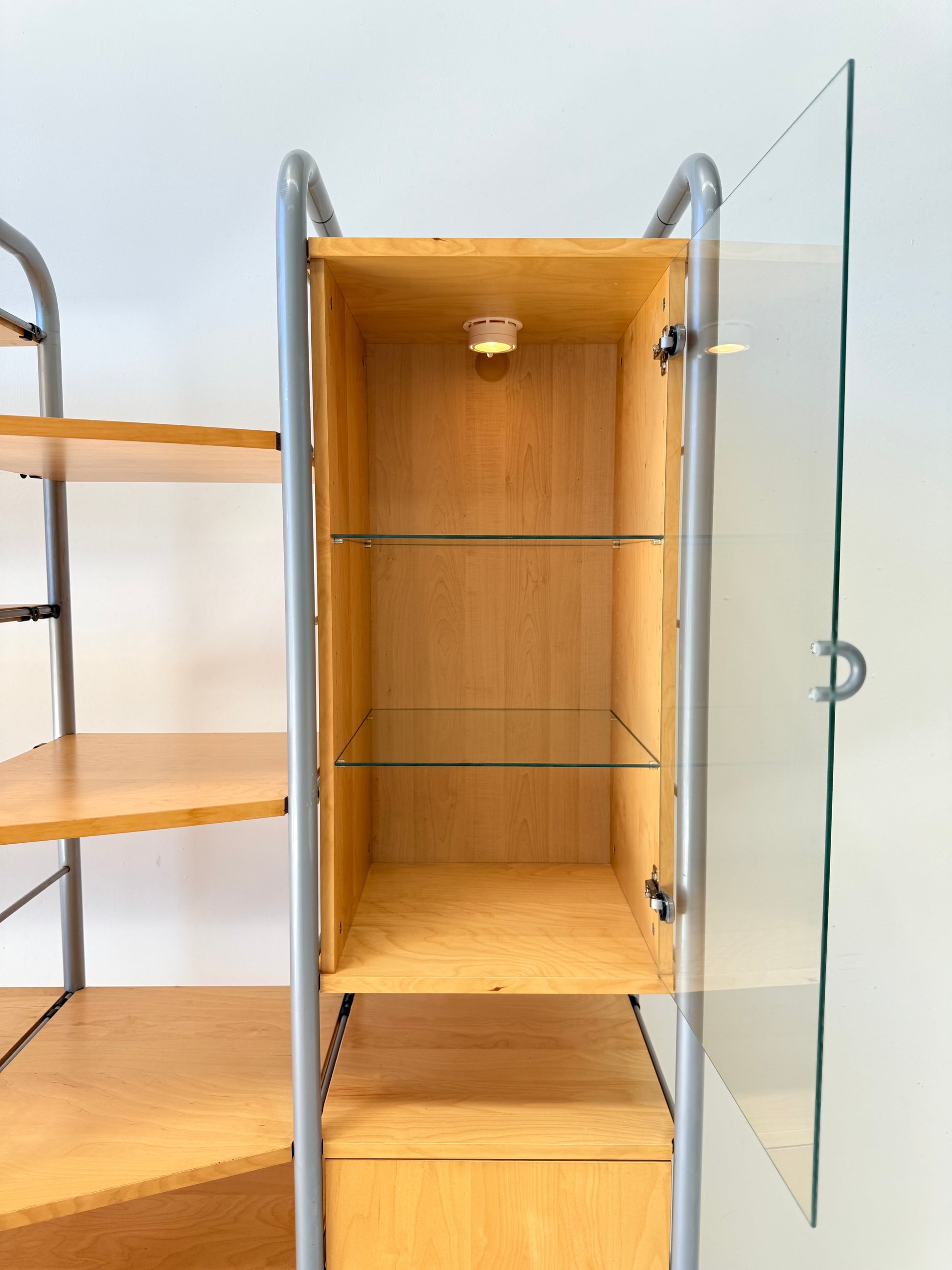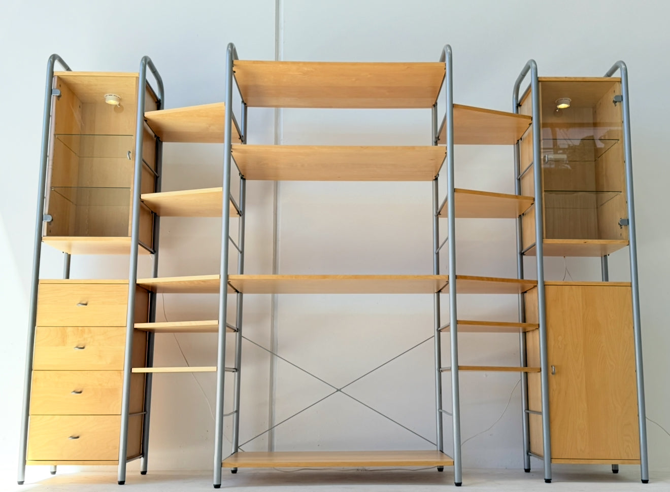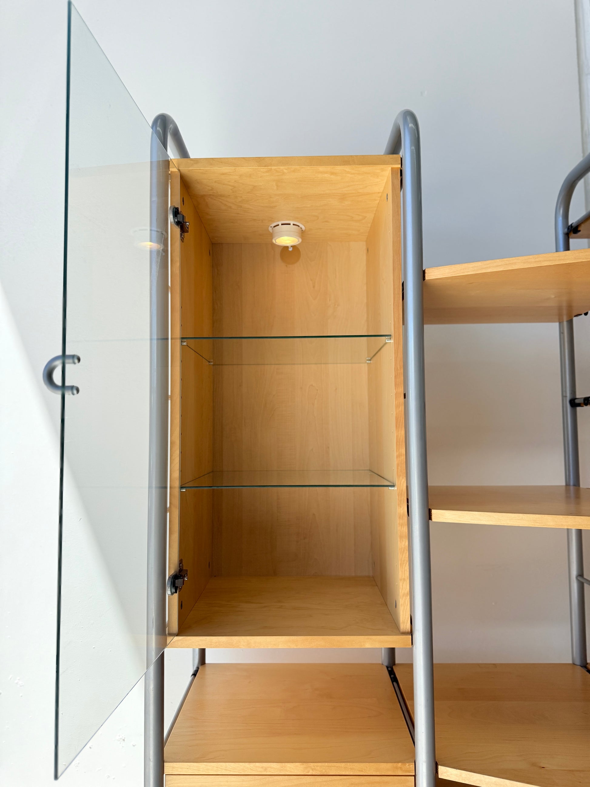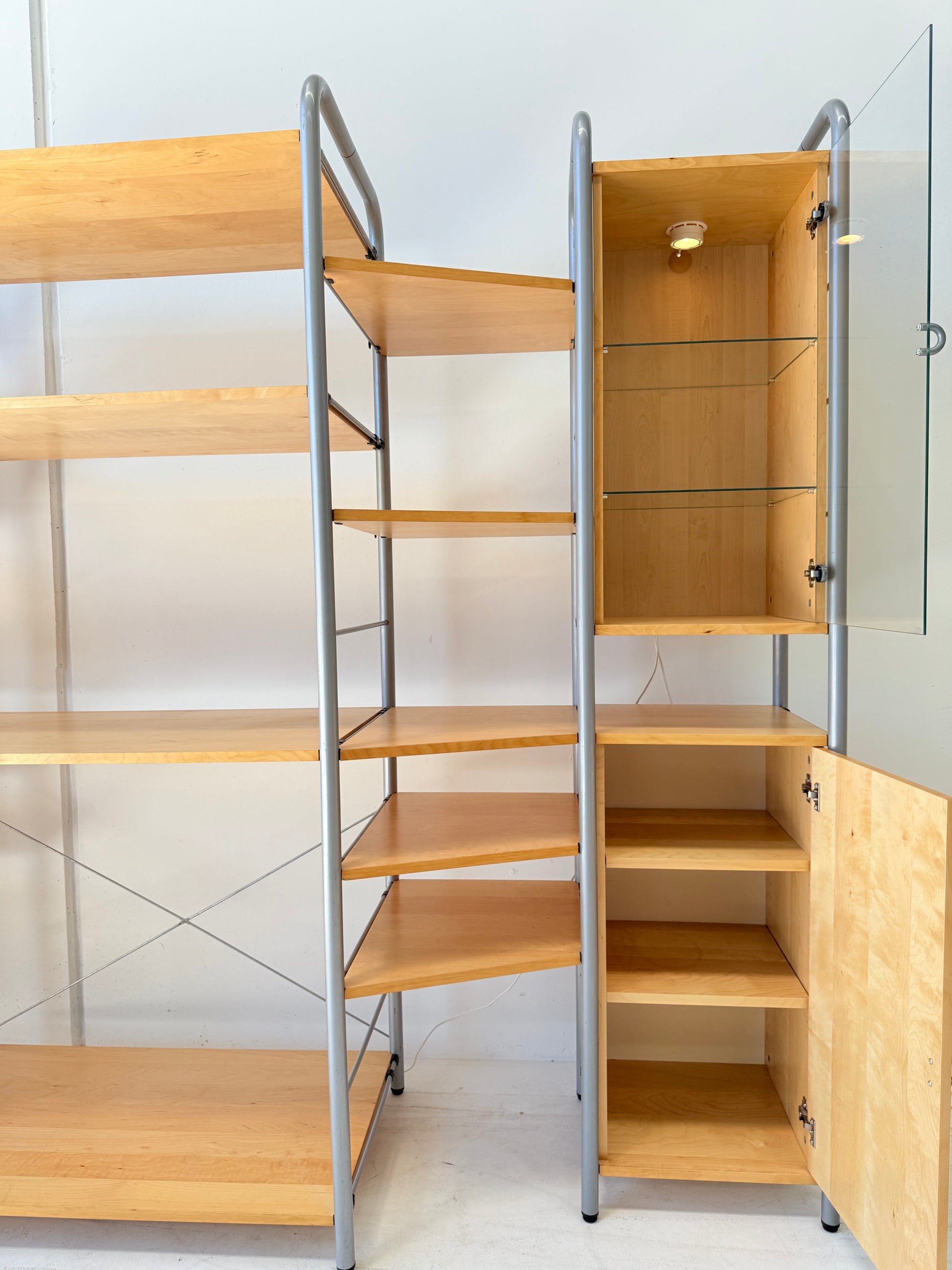 Sought after vintage shelving unit consisting of 6 tall ladders, 14 slat shelves with one console shelf (or desk shelf) and four cabinets. Two glass door cabinets with 2 glass shelves each plus lighting, one single 4-drawer cabinet and one single cupboard with 2 shelves.