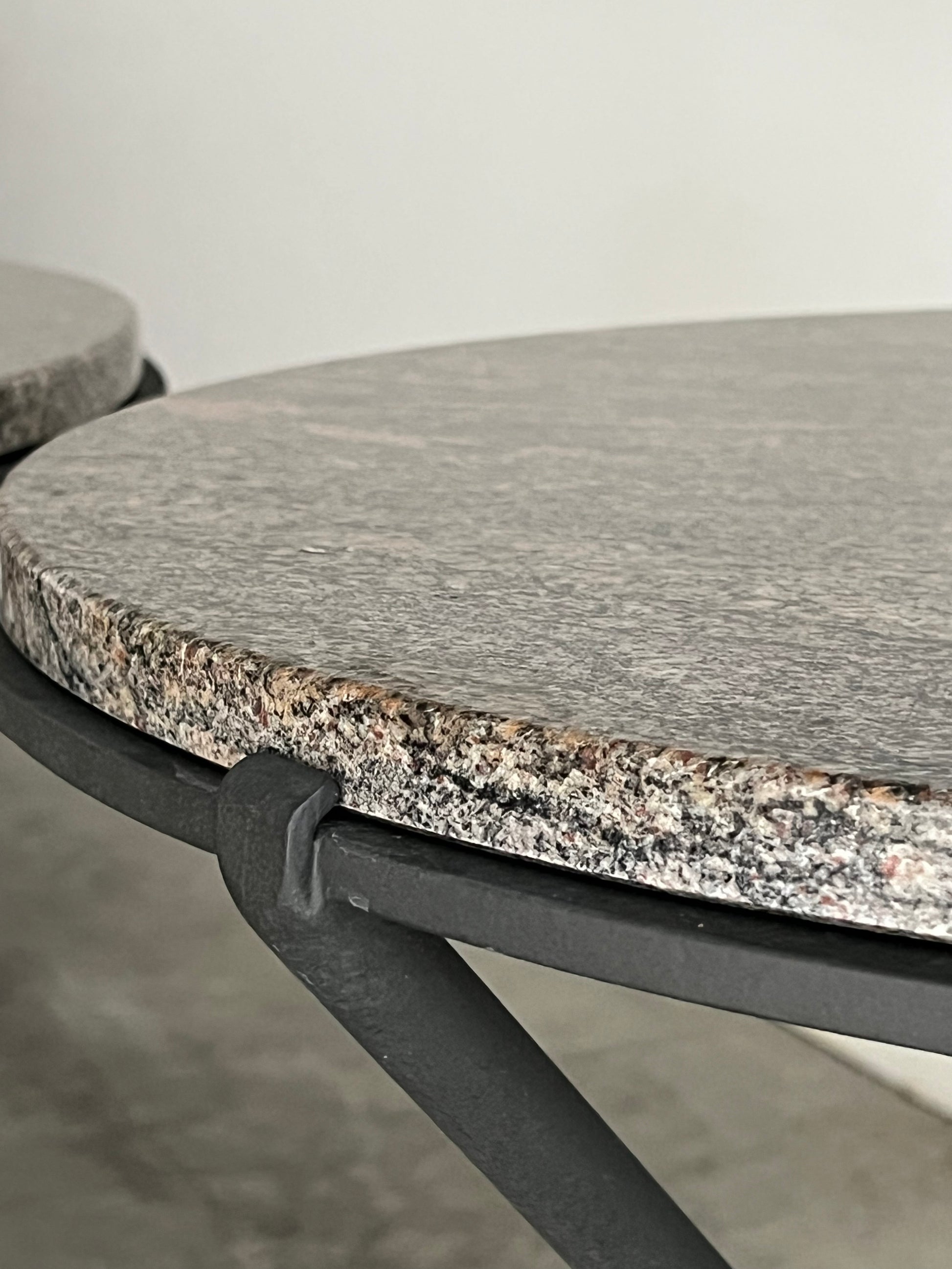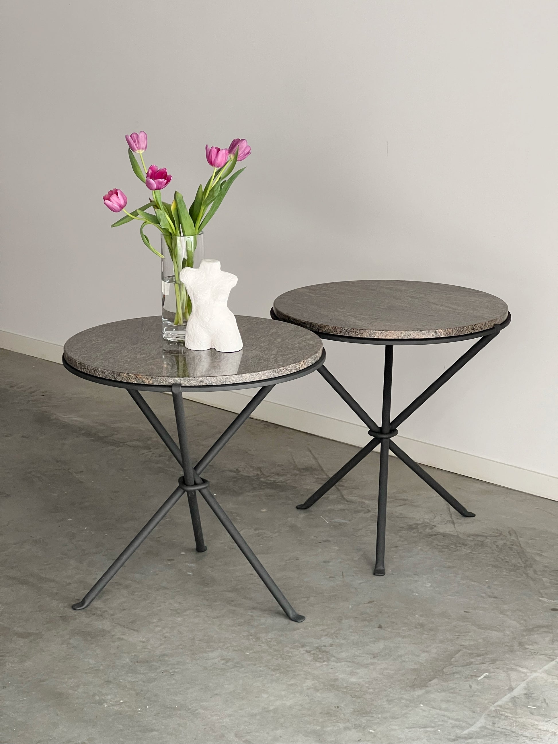 Hand-forged in Italy, these Neoclassical inspired side tables are extremely well preserved. Classic tripod base in a matte dark grey finish. 2cm thick granite tops are clasped in prong settings.