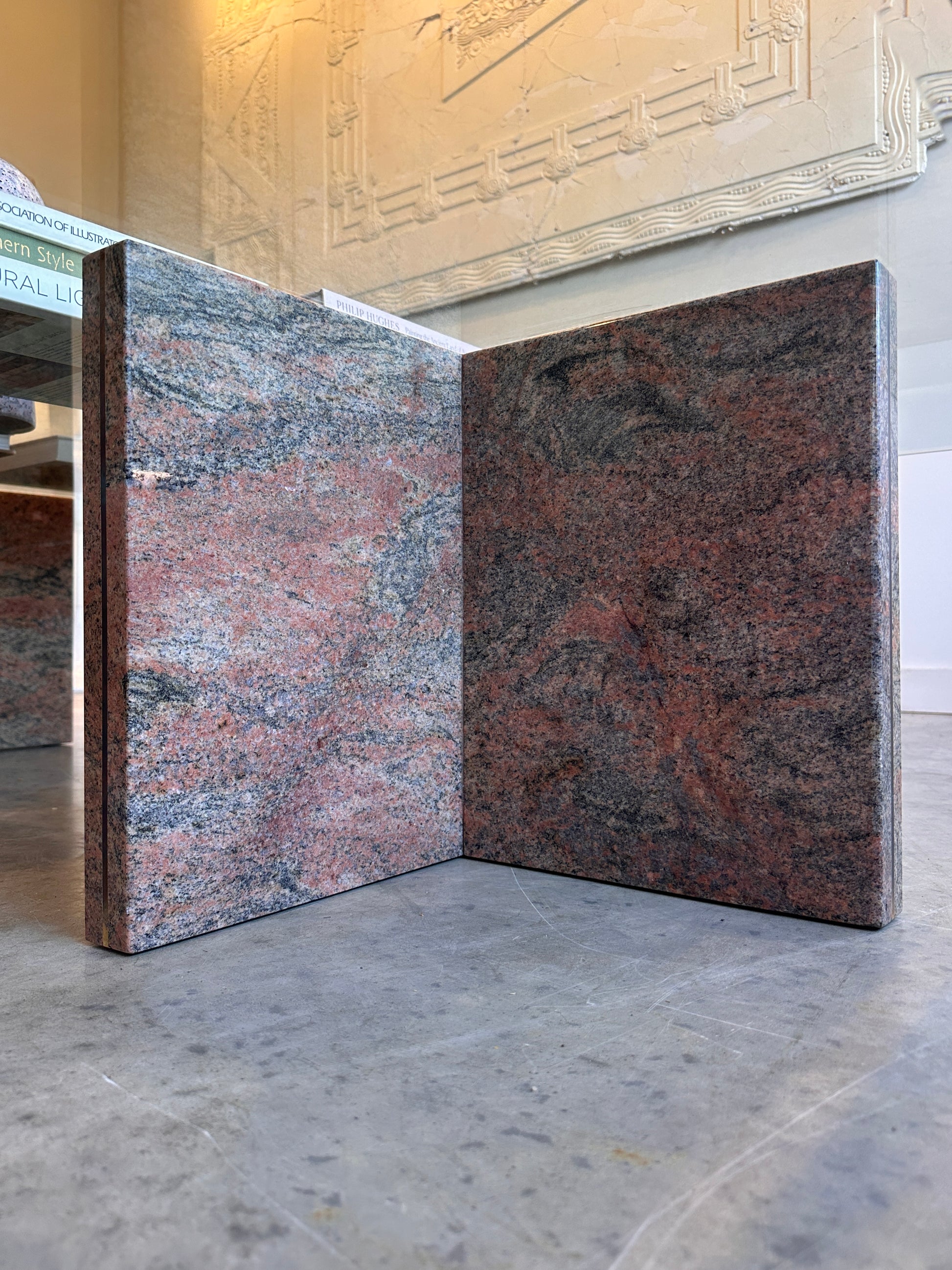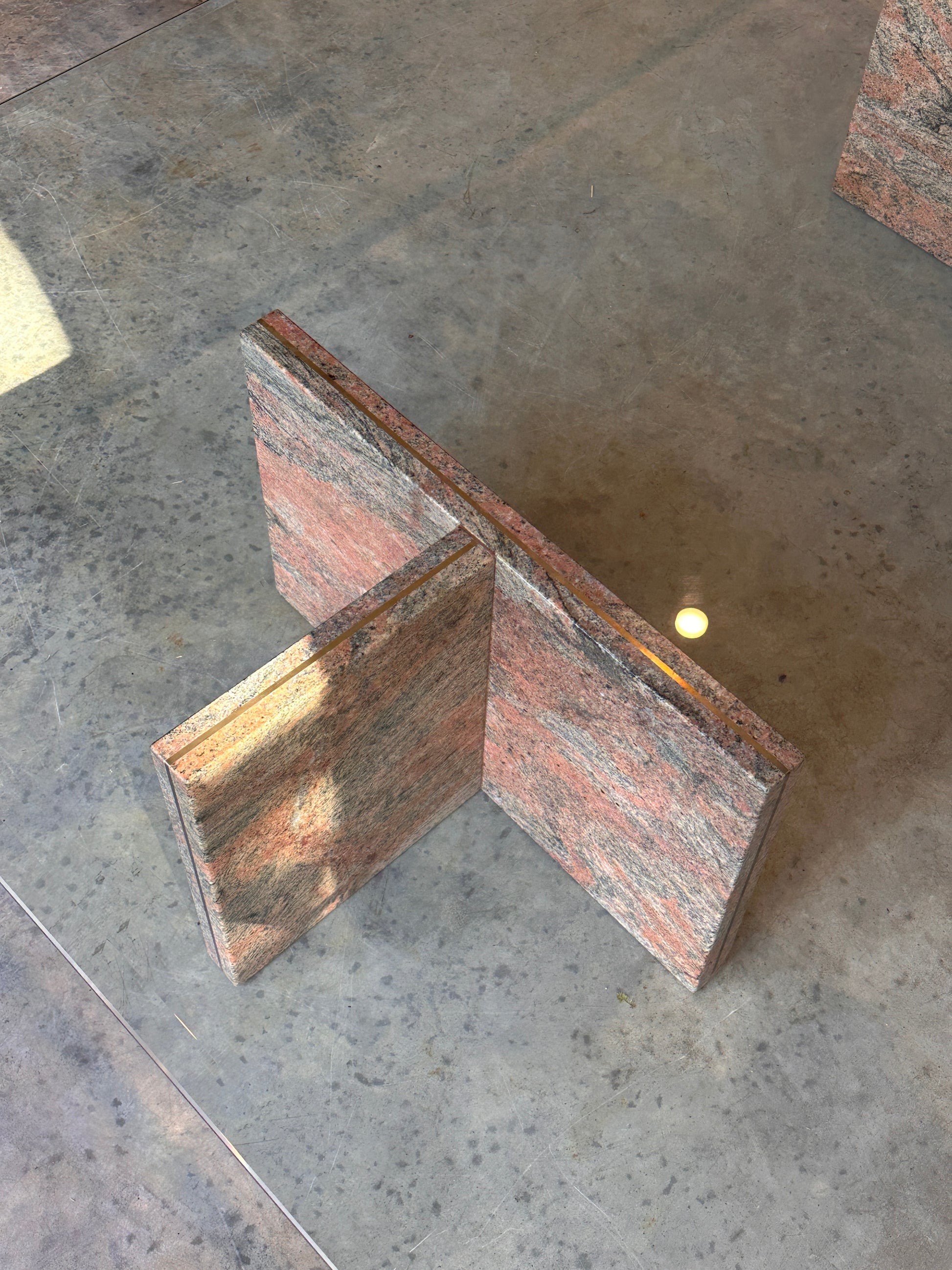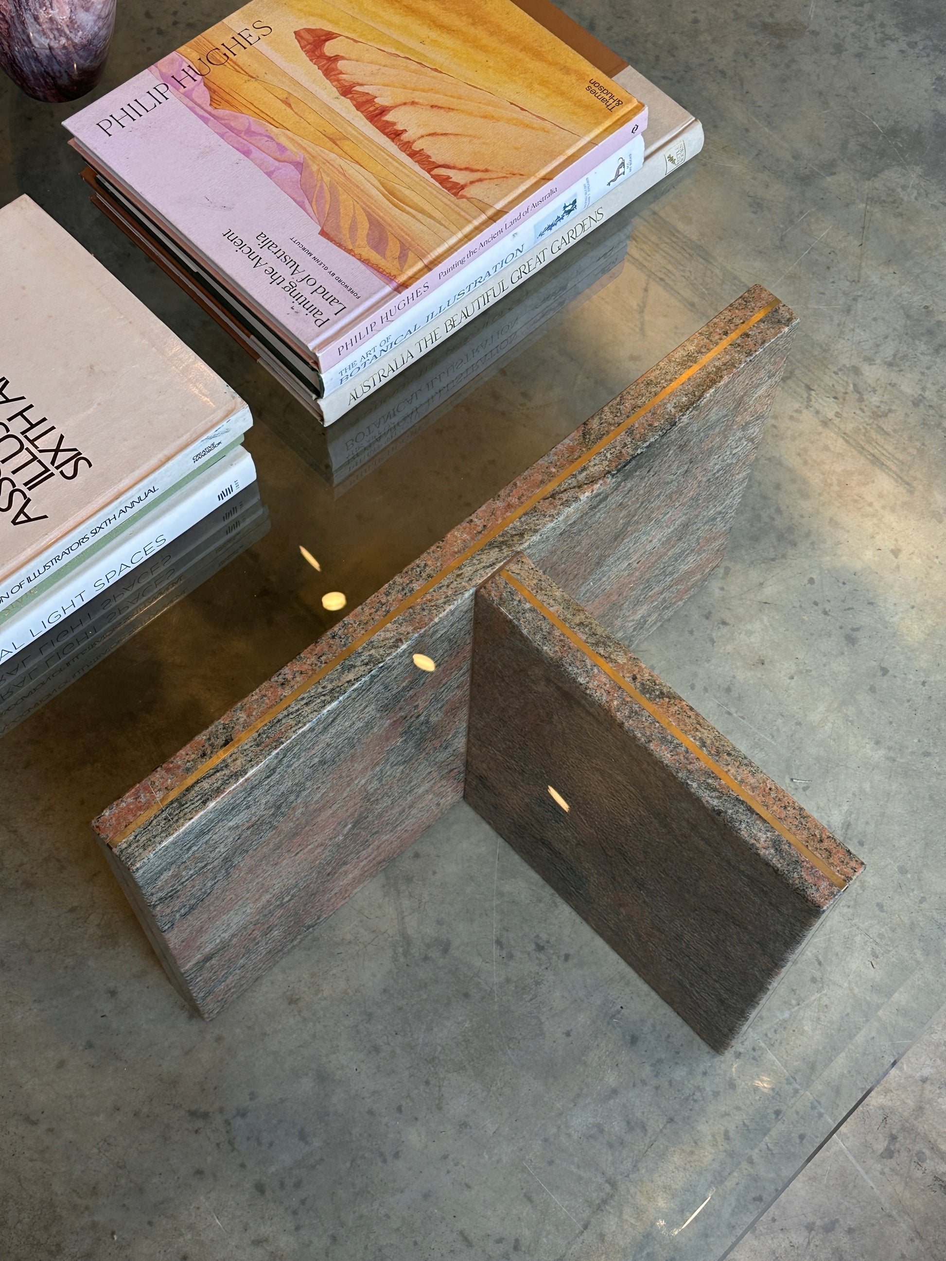 It features stunning pink granite bases with brass inlay & a double beveled edge, thickened glass top. Low profile. A really special piece & very cool.